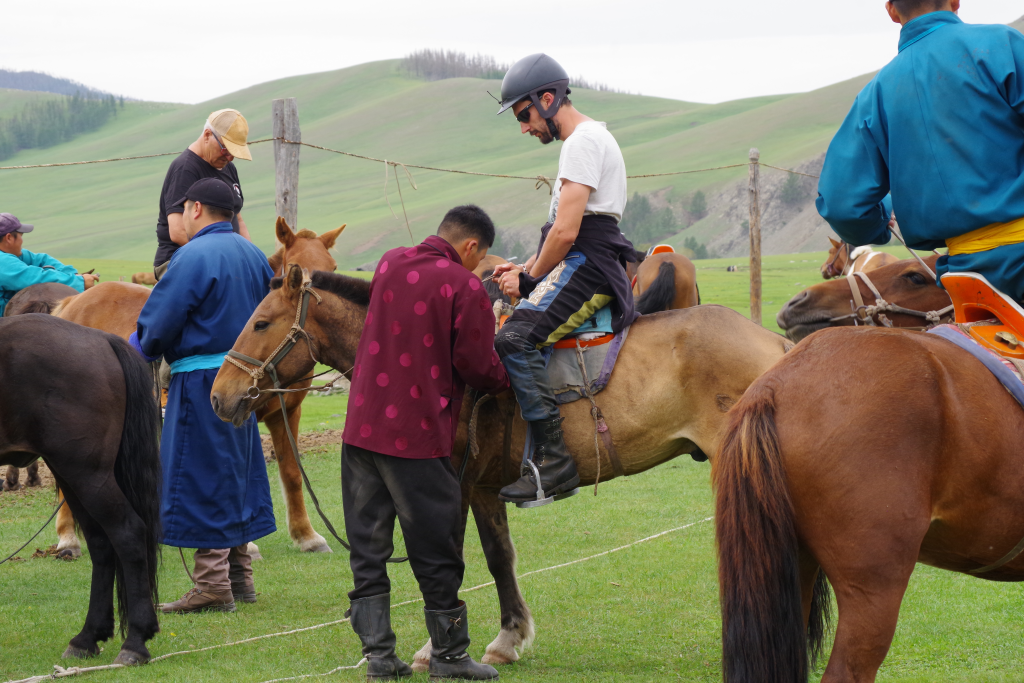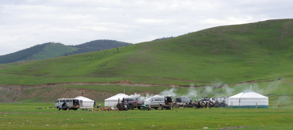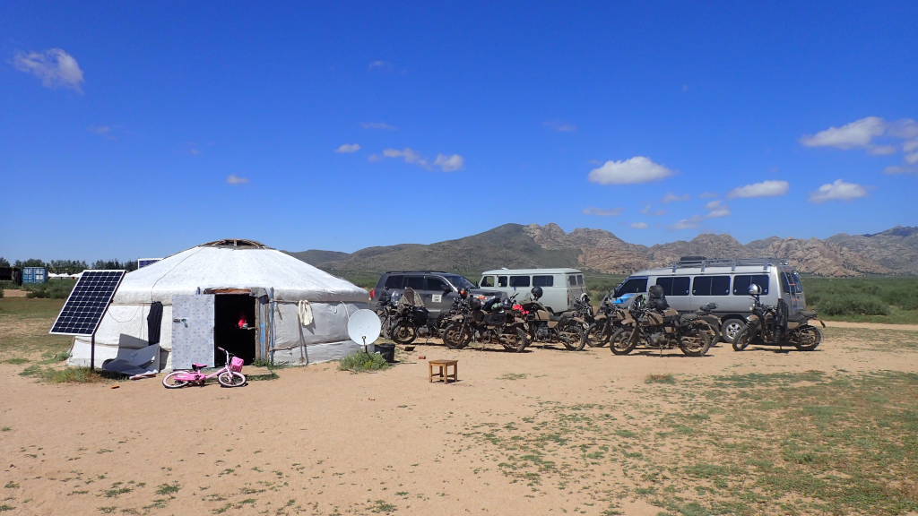 La reprise est un peu plus chaotique. On se trompe de chemin à un embranchement, et nous voici 5 motos perdue en Mongolie. Je grimpe dans un arbre pour essayer d’avoir du réseaux, et décidons finalement de faire demi-tour pour retourner à l’auberge. On croise le 4×4 d’assistance et une autre moto à la traîne. Filtre a essence bouché. On rejoint finalement le reste du groupe. Nous arrivons au dernier camps. Pas de douche, mais des serviettes chaudes qui font le même effet régénérant.