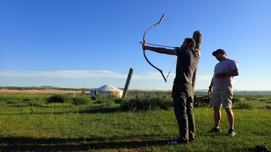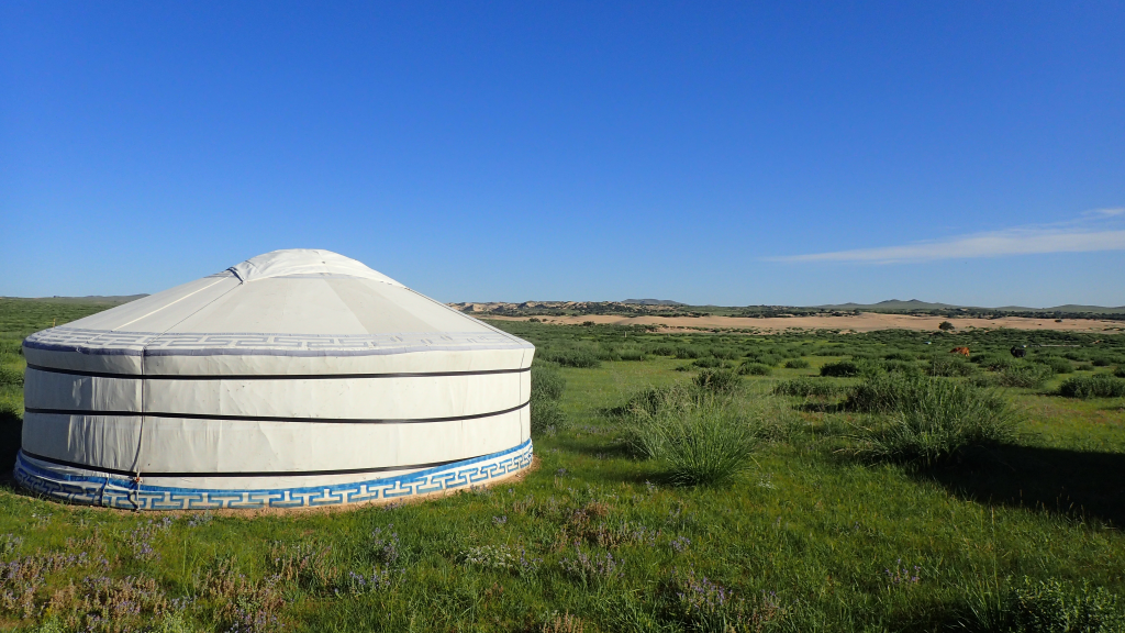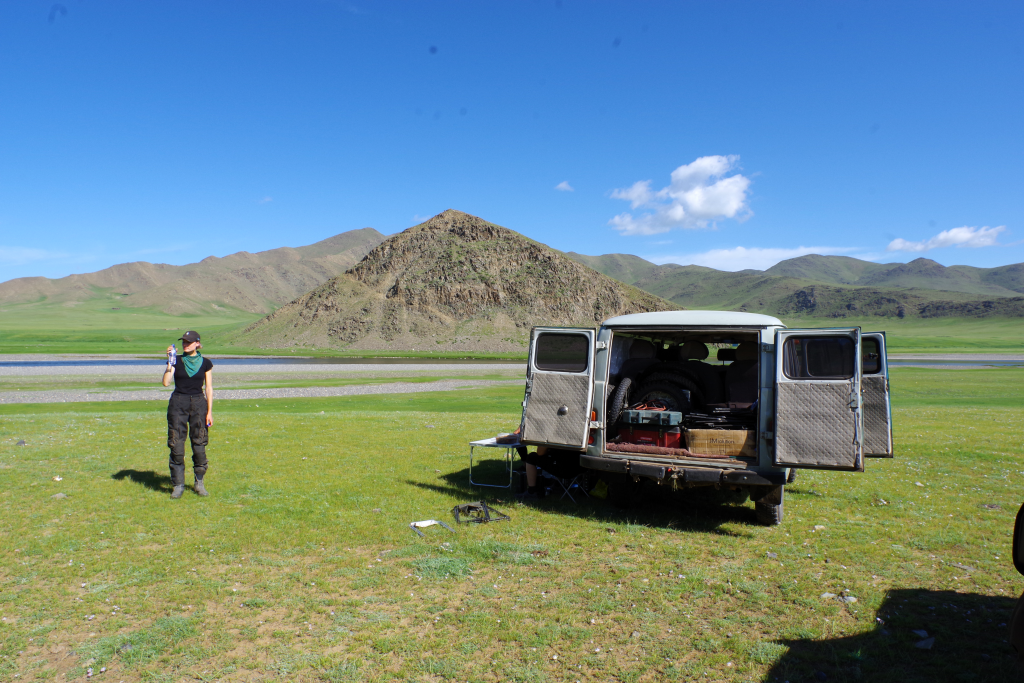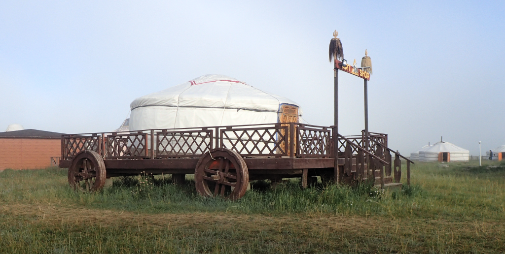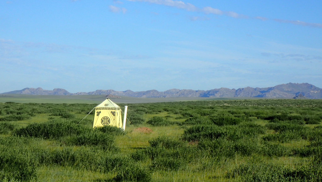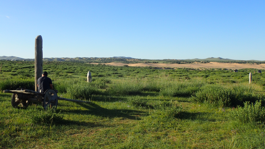 On se rapproche du désert de Gobi et le sable se fait plus présent. De quoi s’amuser un peu. Le déjeuner se fait dans une auberge improbable, composé de quelques yourtes pour la cuisine, deux table de pique-nique et un panneau solaire au porte du désert.