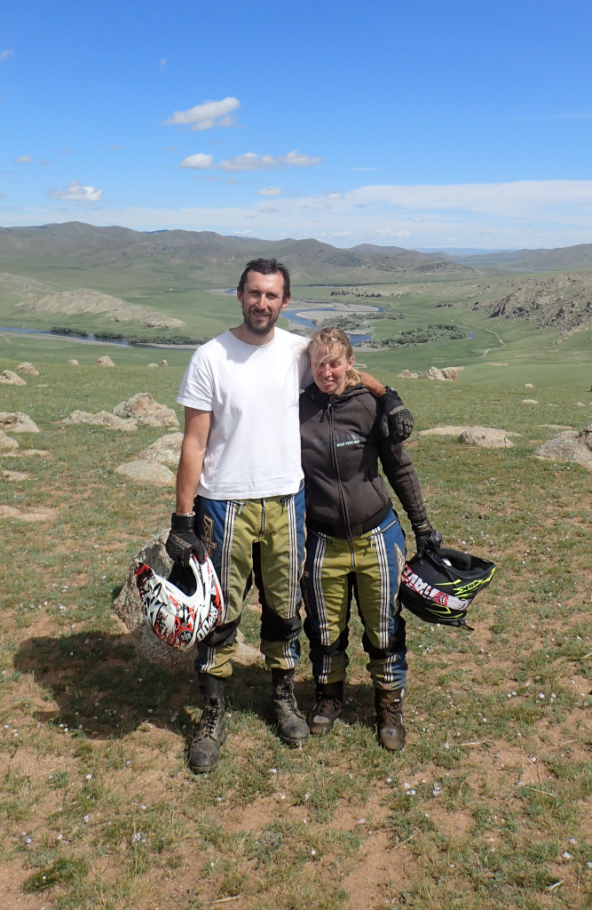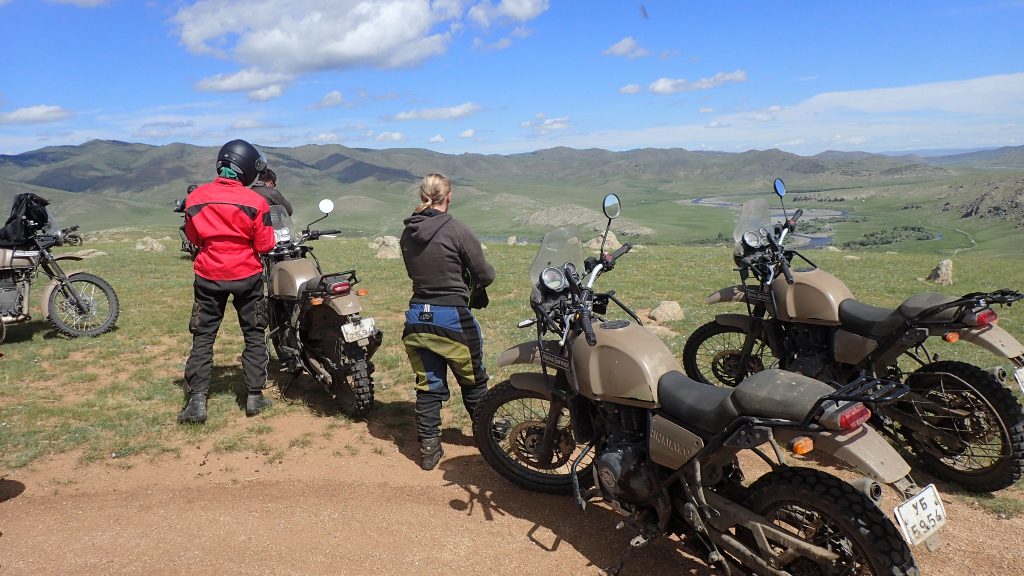 La piste est variée. Plaine, sable, boue, longues montée suivie d’une vue imprenable sur la steppe Mongole. Un dévers touchera les limites de la garde au sol de l’indienne, et mon pied en fera les frais, coincé entre la pente et le bas moteur. Je m’en tire avec un bon bleu mais heureusement, rien de plus. Les rangers ont fait leur boulot. La fatigue commence a se faire sentir pour Laure qui chute à plusieurs reprises. Kirsten chute dans une ornière. Là aussi, la fatigue n’y est pas étrangère.