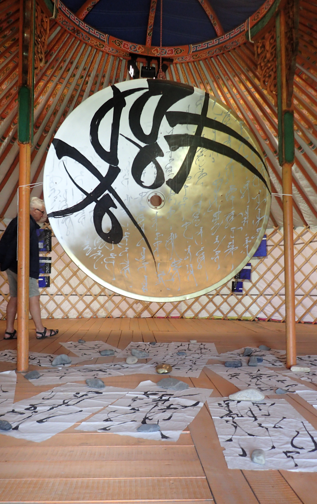 Nous arrivons au camp avant de repartir en 4×4 visiter le centre de calligraphie. L’endroit est apaisant et appel à la méditation et la philosophie. La dernière œuvre me marque par son symbolisme. Des papier ornée d’écriture sont recouverts de pierres au sol. Les papiers représentent la culture, l’histoire du peuple. Les pierres sont les gens qui partagent ce savoir. Si les pierres s’en vont, le vent emporte les papiers, et l’histoire disparaît.