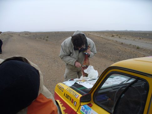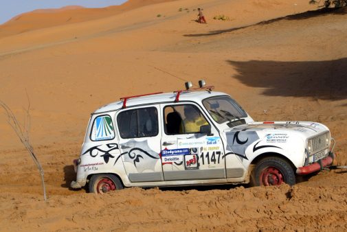 Oasis au portes du plus grand bac à sable du monde. L’occasion de tester cet infatigable véhicule au cours d’une spéciale dans les dunes. Je chinte le thermostat du radiateur et enclenche le chauffage à fond pour refroidir du mieux possible les 1100 centimètres cube de ce fabuleux moteur. Le départ est lancé. Premier virage, premier ensablage. Le 4×4 d’assistance me ramène au départ. 2ème essai, toujours pas. Au vue des traces dans le sable et de l’air blasé du conducteur, je ne dois pas être le premier. Il me traine jusqu’après le virage où je peux reprendre le circuit. Au détour d’une chicane, je fais une embardé pour éviter un petit marocain. Une bande de gamins traine au bord de la piste et leur jeu consiste à traverser au dernier moment juste devant la voiture. Je préviens l’orga qui leur passe un savon et poste un membre du staff pour les surveiller. Après ça je finis enfin mon tour de spéciale, un peu déçu de tous ces contretemps.
