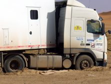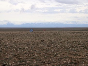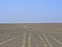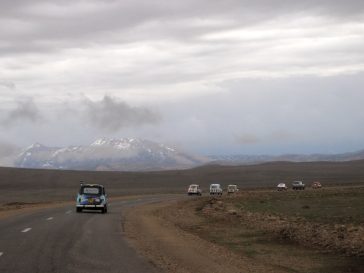 Je me réveille engourdi par le froid et tellement vivant. Une pluie fine tombe sur le camp de base, les visages sont tirés mais néanmoins euphoriques. Piste et bitume sont déjà devenus notre quotidien, Bordeaux semble si loin maintenant. Nous nous arrêtons sur le bas-coté pour manger un peu de jambon et sommes très vite rejoints par d’autres équipages. Un peu plus loin une oasis nous accueille en contrebas, de quoi faire quelques ablutions puis juste avant notre arrivée, la voiture heurte un gros caillou. La tôle de protection a probablement sauvé sa boîte de vitesse, mais la barre anti-roulis a pris un coup. Rien de très grave, la réparation peut attendre jusqu’au bivouac. La mécanique souffre aussi chez les autres équipages et je m’endors bercé par le martellement des mécaniciens du pôle technique.