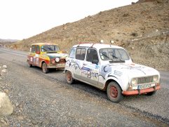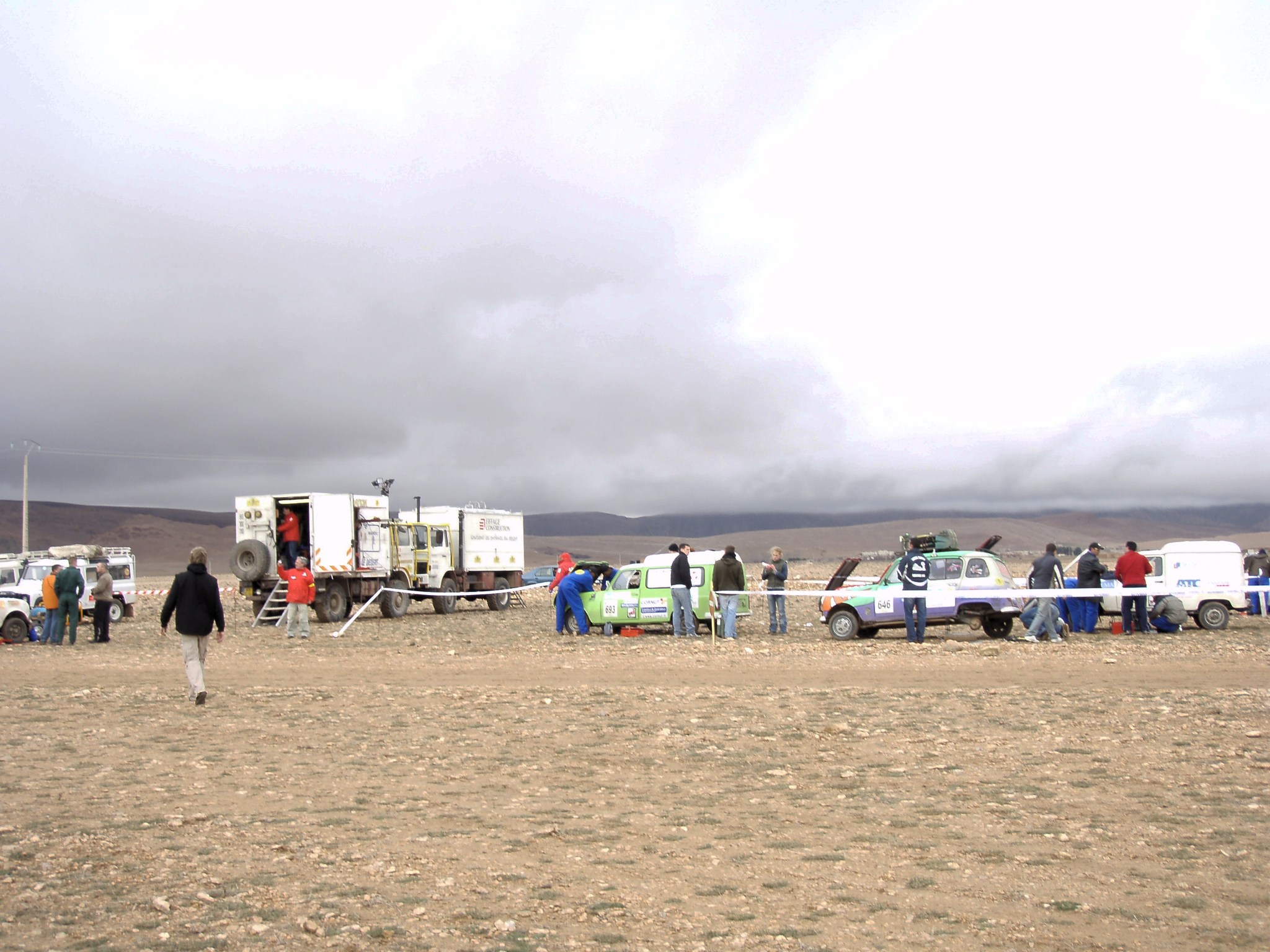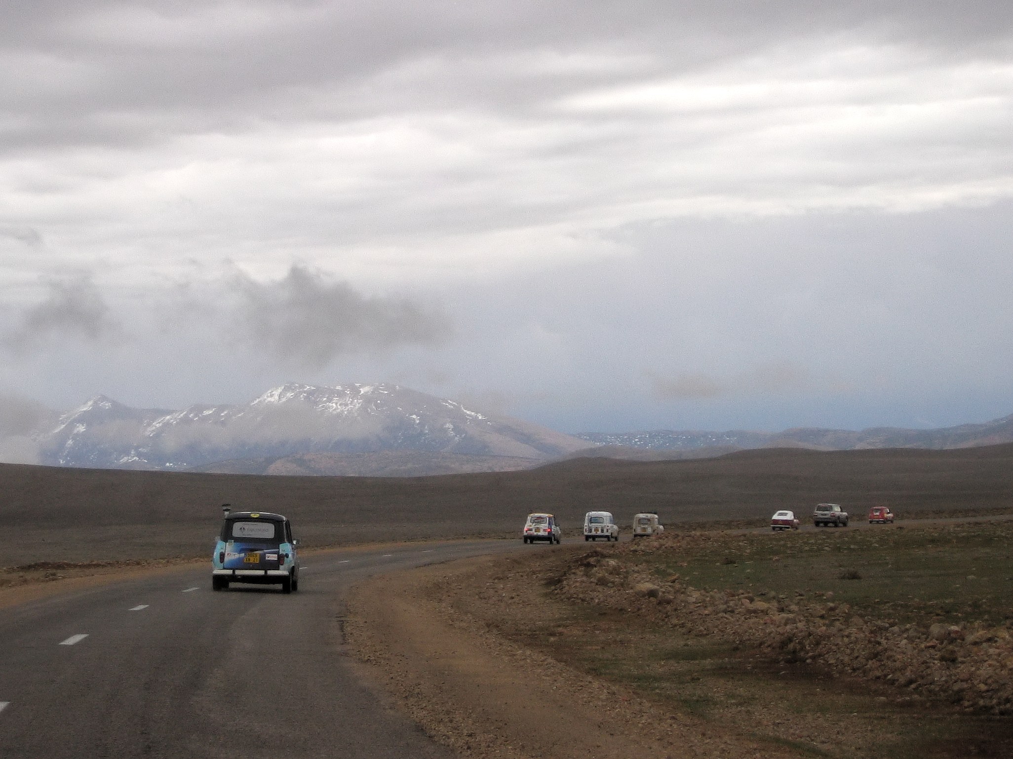 Descente du bateau, pour nous c’est bon. Pour d’autres malheureux, le châssis de la voiture ne tient pas et lâche. On reprend la route, marocaine cette fois. Les kilomètres défilent, les 4L se suivent, parfois se doublent, une pluie légère alterne avec le soleil marocain le tout sous le regard imperturbable des mont de l’Atlas qui surveillent de haut cet étrange peloton sous-motorisé. Puis la première piste à quelques kilomètres de Boulemane. La voiture tremble, le crissement de la ferraille et le couinement incessant de la suspension sur cette tôle ondulée de route ne s’arrêtera que 6 jours et 1000km plus tard. Nous rejoignons le bivouac sur les plateaux désertiques. La température chute sous cette bruine gelée, l’organisation nous annonce des températures négatives la nuit. Allongé dans le sac de couchage de mon père, son deuxième voyage au Maroc pour lui, un matelas gonflable de plage en guise de literie, je grelote. Je met ma doudoune par dessus mon visage pour le protéger du froid et fini par m’endormir. Le thermomètre descendra à -10°C cette nuit là.