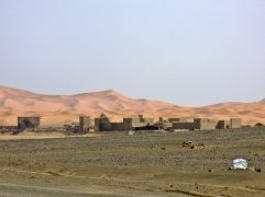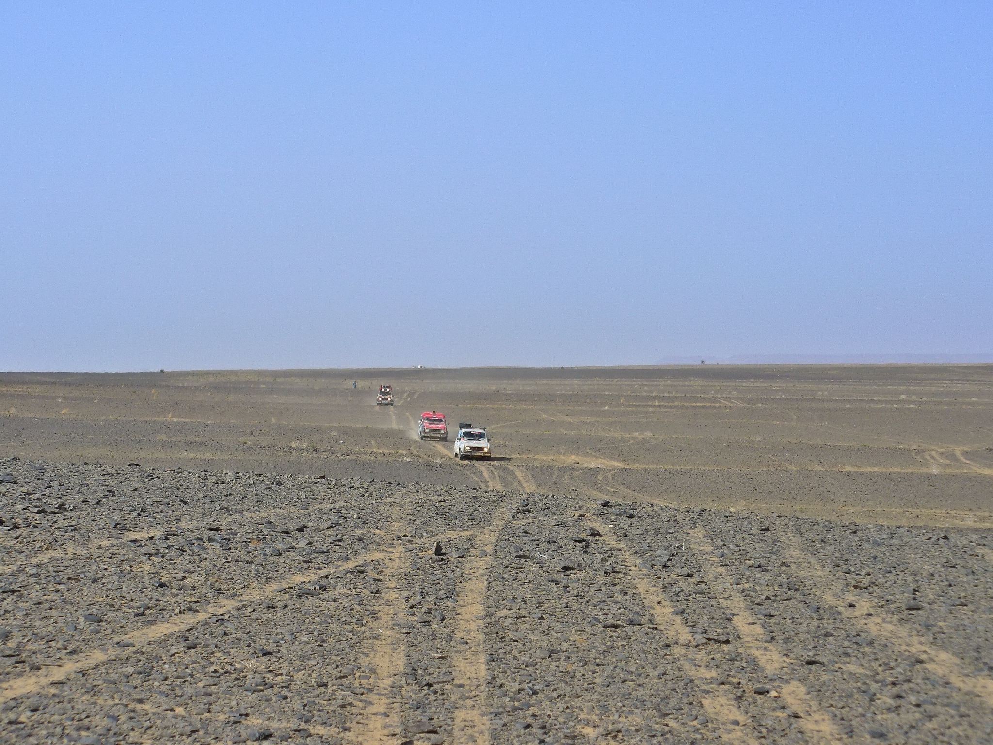 Nous levons le camp et partons pour Merzouga et les premières dunes du Sahara. Les pistes et les portions bitumées alternent comme pour reposer notre fidèle attelage. Nous arrivons au bord d’un oued asséché. Tenter la traversée ou faire un détour pour emprunter le pont un peu plus loin, la question se pose mais nos acolytes décident de tenter le coup. Je préconise à mon copilote d’attendre un peu pour voir. Il s’ensuivra deux heures de désassemblage sous un soleil de plomb pour sortir la 2ème 4L de cet enfer sableux. La dizaine de voiture planté autour de nous aurait du nous rendre plus méfiant. Puis les pistes et les dunes au loin. En s’arrêtant auprès d’un autre équipage pour chercher notre chemin, un berbère sorti de nulle part monté sur une motobécane d’un autre temps nous accoste. Il entame la conversation et nous indique un raccourci pour rejoindre Merzouga en passant entre le désert et la colline au lieu de faire le tour. Nous suivons son conseil, entrainant avec nous quelques équipages égarées attiré par le panache de poussière que nous soulevons.