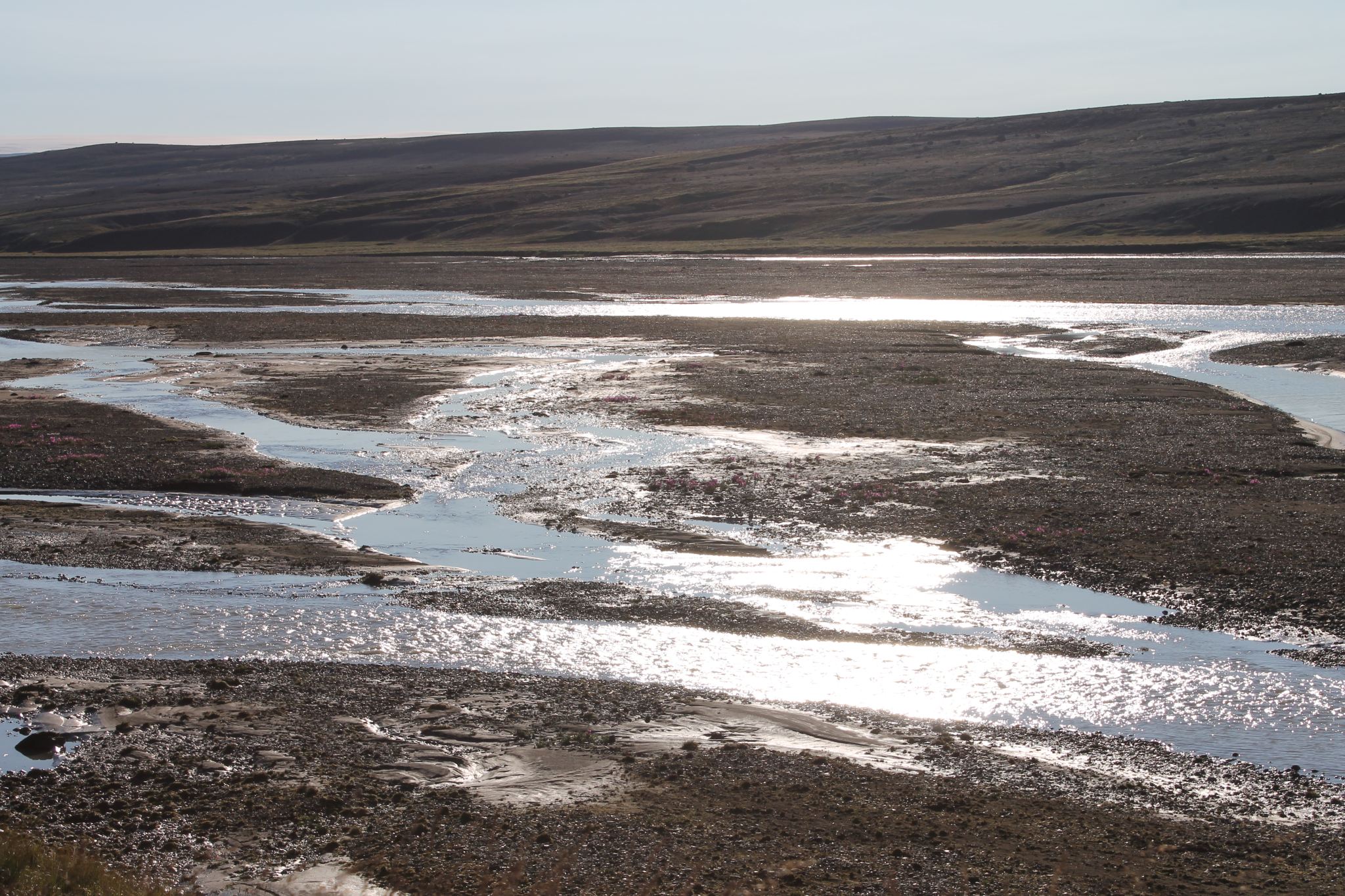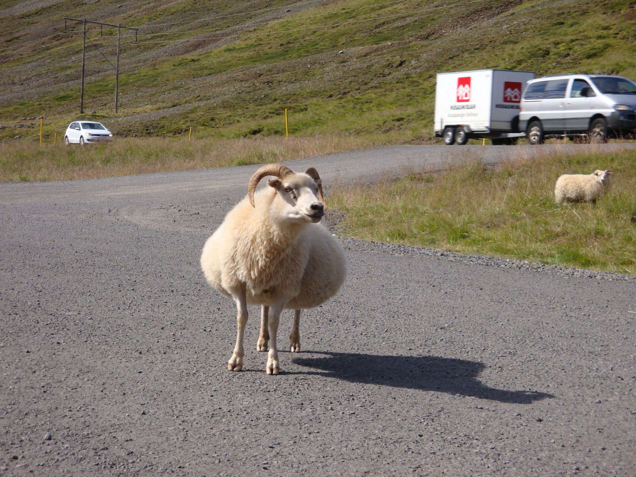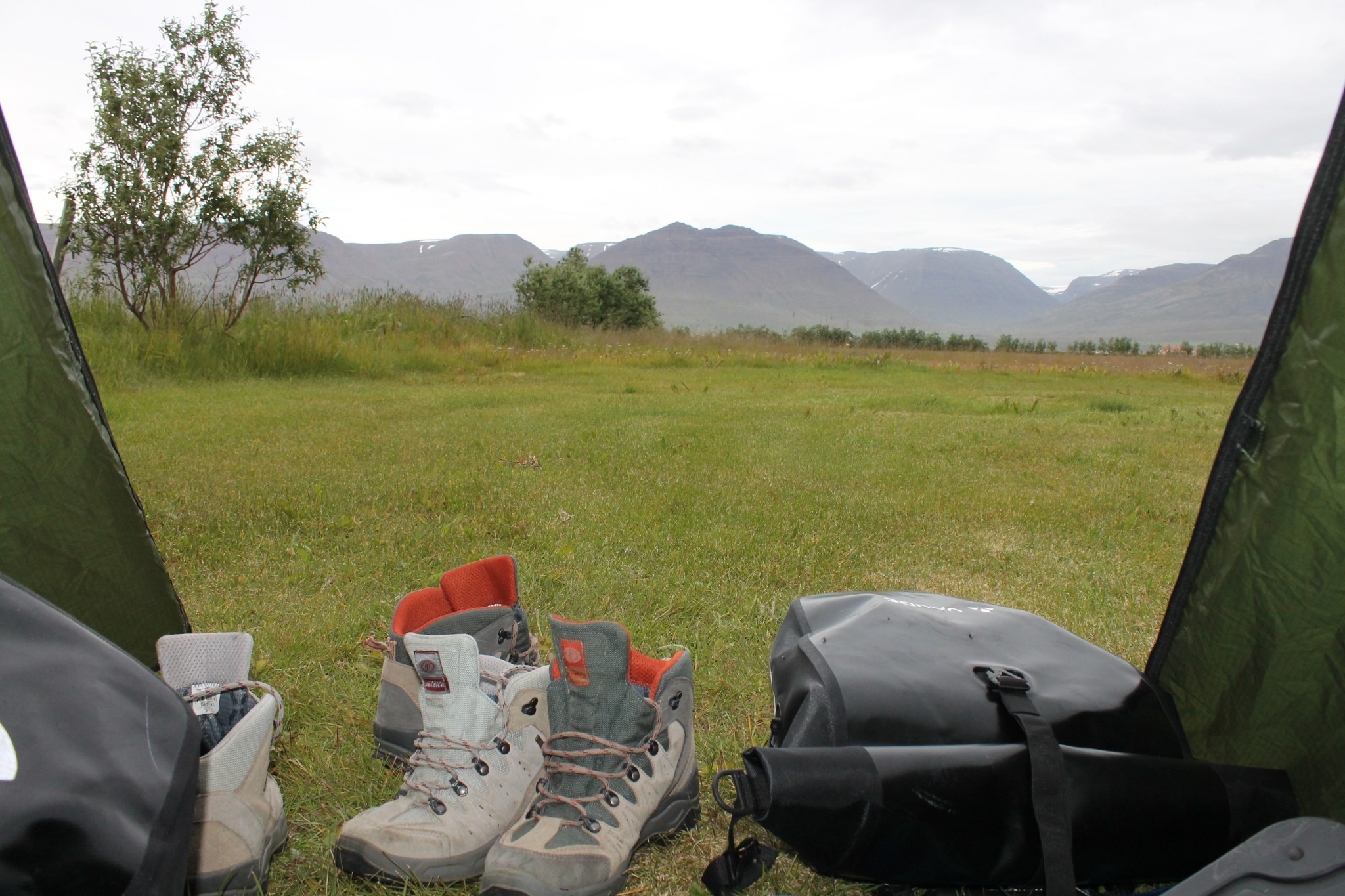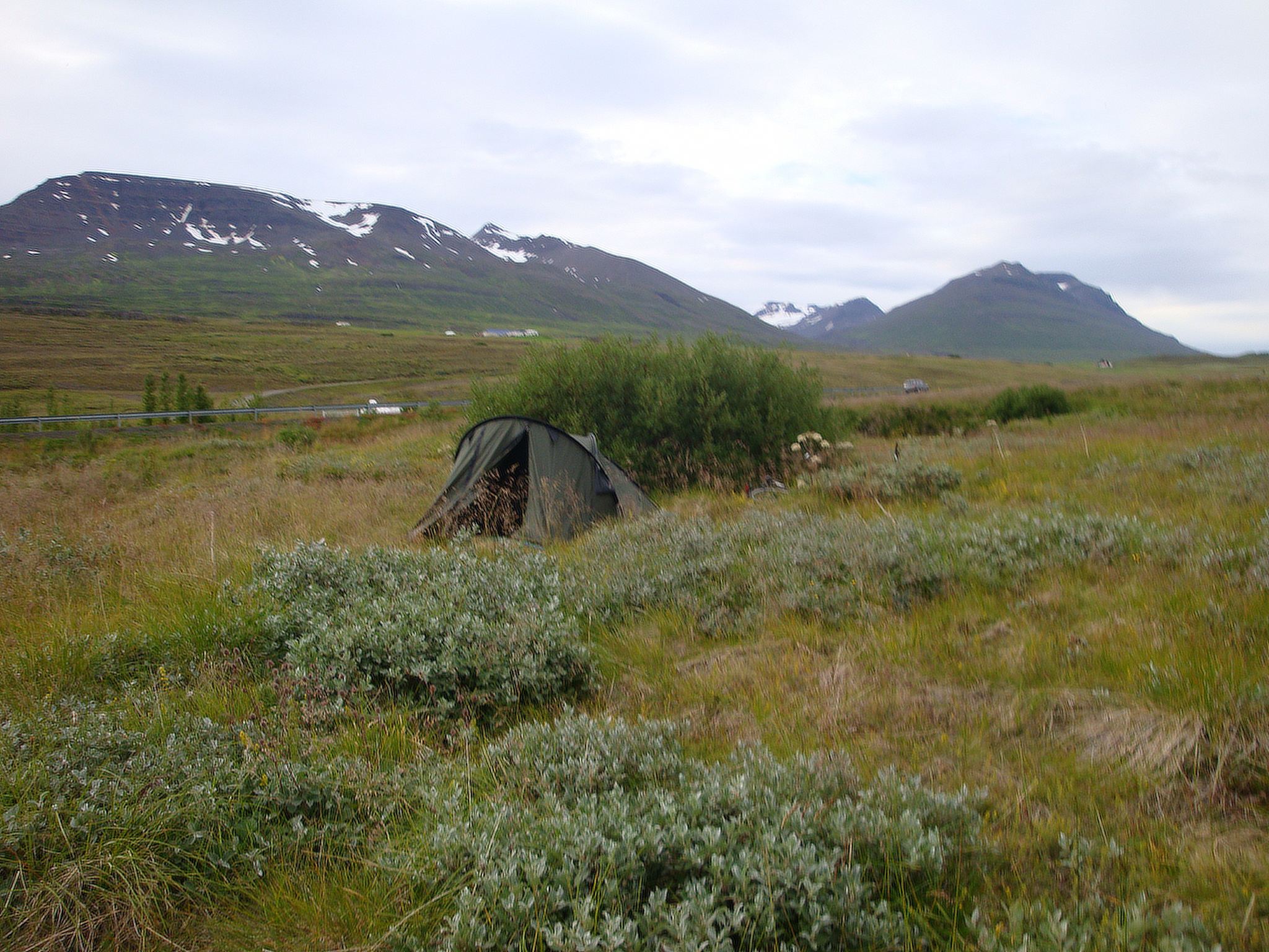On a fait notre premier camping sauvage islandais au bord de la route derrière un buisson, on repart vers 10h. Une interminable côte nous achève et on finit à pied mais après, on a une longue descente et grand soleil. A une pause, Thibaut se fait bêler par un mouton pas farouche. On arrive dans une grand plaine balayées par le vent Islandais. Les 20km de ligne droite, avec des rafales de face et de travers sont longs et éprouvants. Mais on veut dormir ce soir à Varmalhid pour pouvoir prendre un bus le lendemain. Le but est de gagner 2 jours de vélo, Gain de temps et d’énergie, perte d’argent, le compromis est là. On arrive à 18h30 à Varmalhid, 80km dans les pattes. On a bien pédalé, mais on en a encore un peu marre. Il y a un camping à l’entrée, tenu par une adorable petite vielle. Ce sera 500 ISK par personnes, bien moins qu’à Reykjavik. En plus, le terrain est plat, propre, désert pas loin de la gare routière avec vue sur les montagnes. C’est bien.