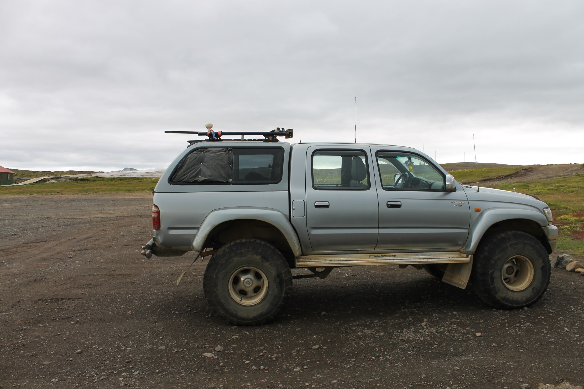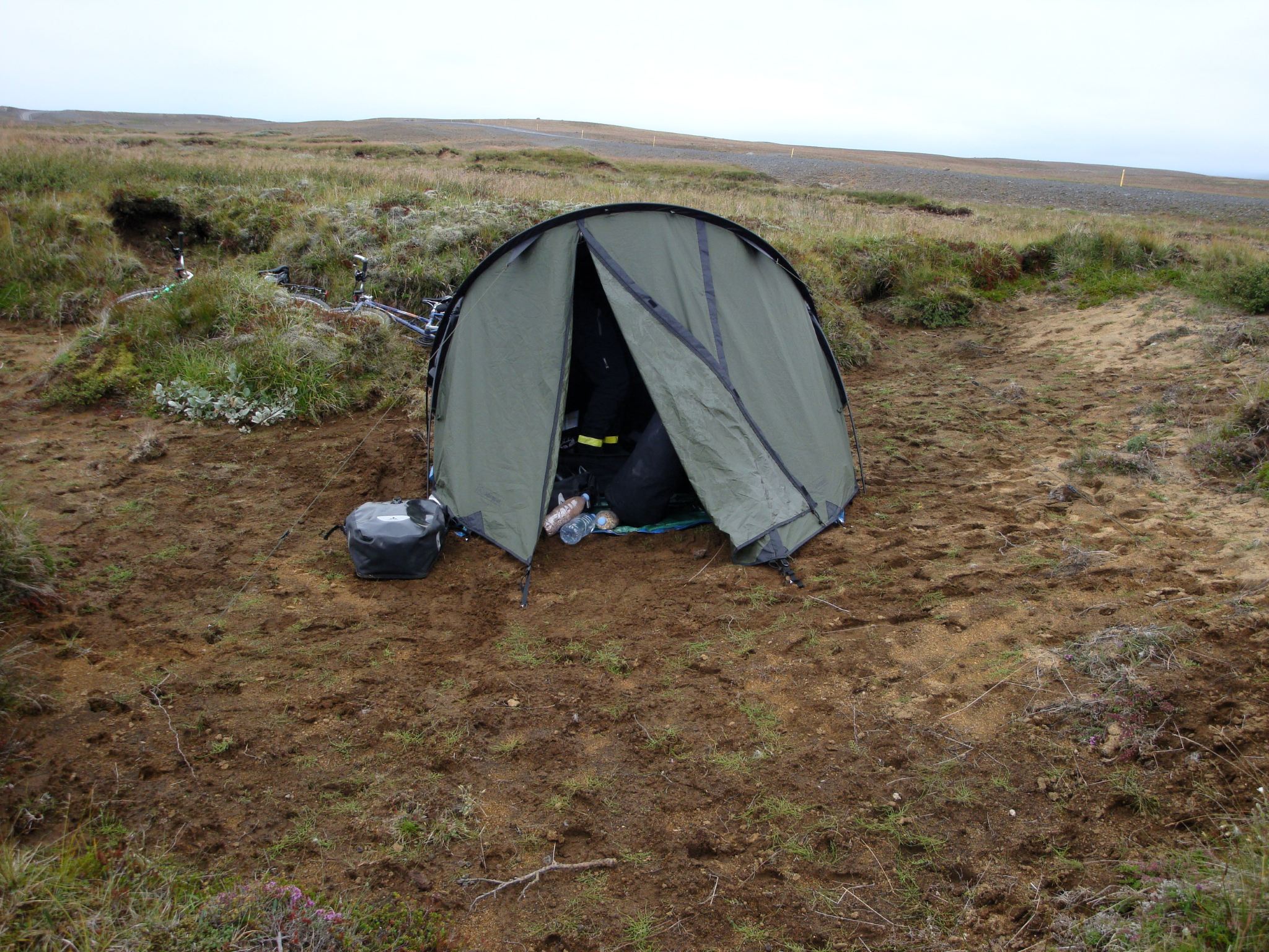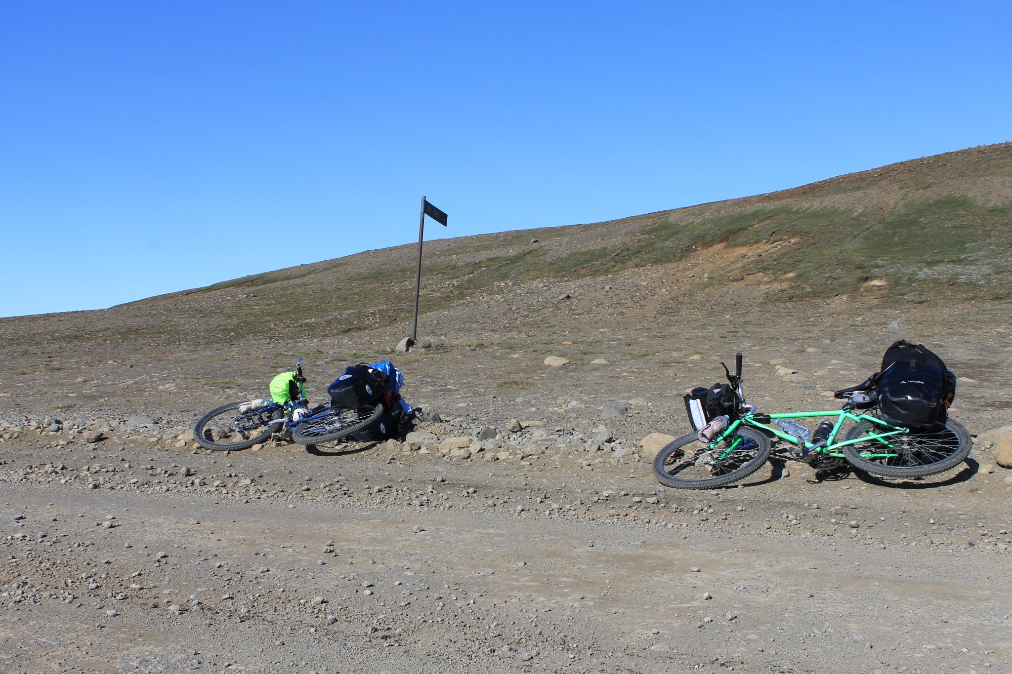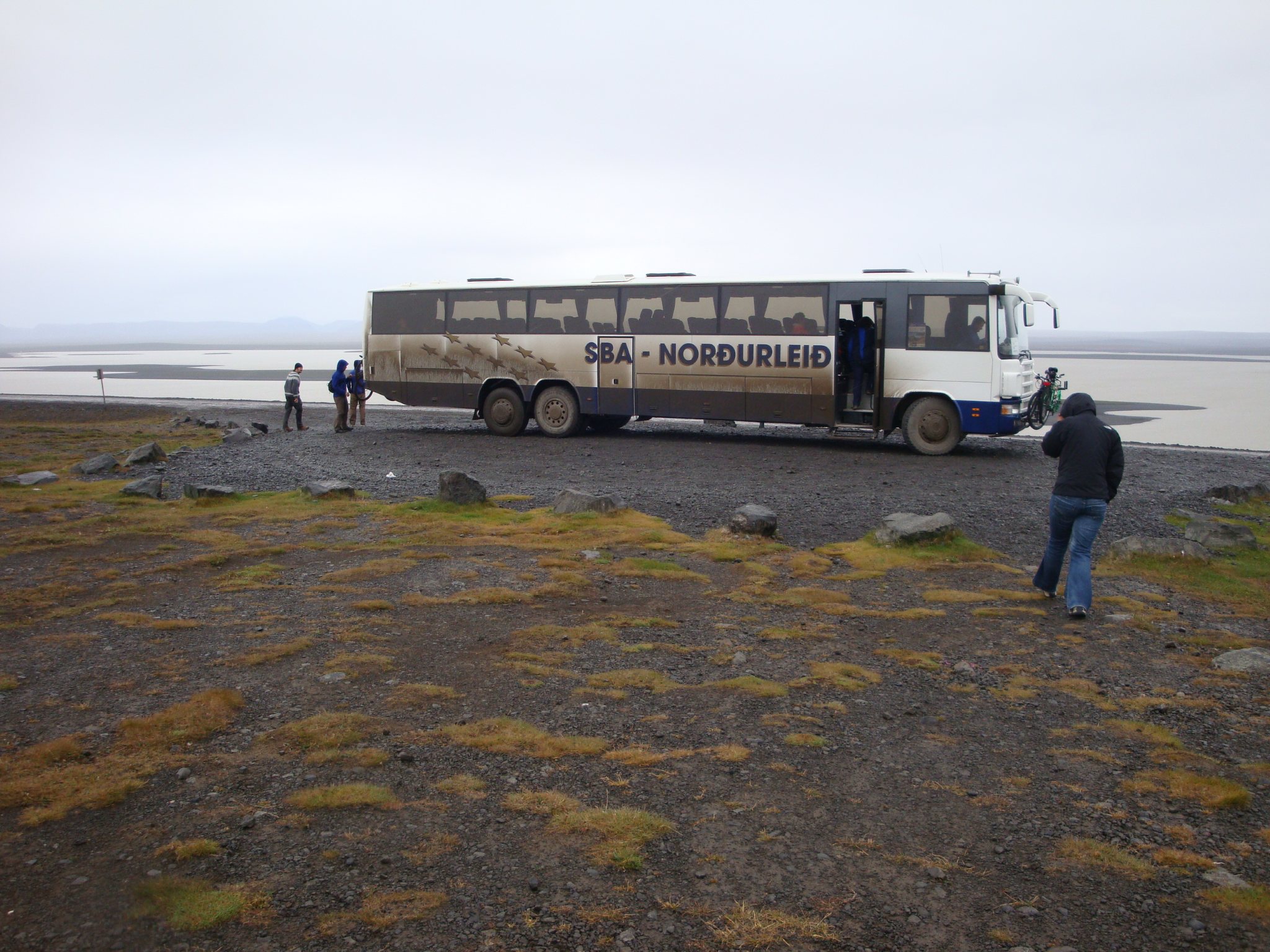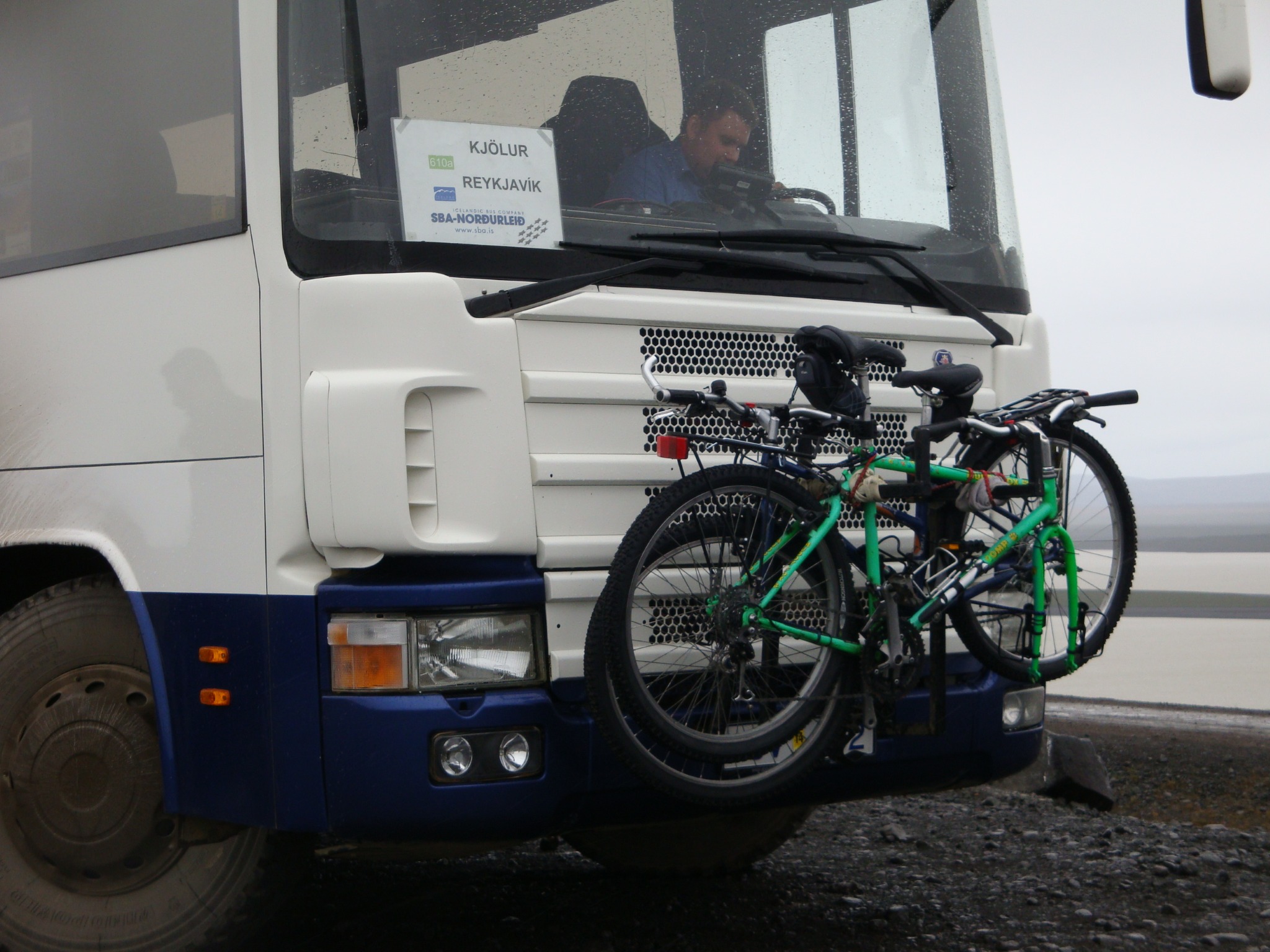 Réveil à 7h sous une pluie fine, l’arrêt de bus est juste à coté du camping. Le bus arrive à peu près à l’heure pour 10min d’arrêt. Le chauffeur essaye de monter nos vélos sur le porte vélos arrière, plus de place. Il rampe sous le bus, sort un autre porte-vélos qu’il accroche à l’avant cette fois. Le conducteur est d’une conscienciosité sans faille (si, ce mot existe) et quelques dizaines de tendeurs plus tard, nous sommes prêts à repartir après 45min d’arrêt. En Islande, les horaires ne sont qu’indicatifs car avec les aléas de la météo ou de la route, on ne sais jamais trop ce qu’il peut se passer. Le bus quitte la route bitumée et s’engage sur la piste F35. Il franchit des gués, grimpe des côtes et franchi des dévers impressionnant pour un engin de cette taille. On arrive finalement au camping de Hveravellir balayé par les vents avec une température de quelques degrés au dessus de zéro.