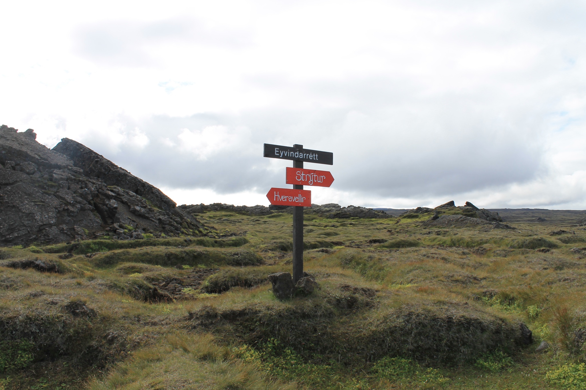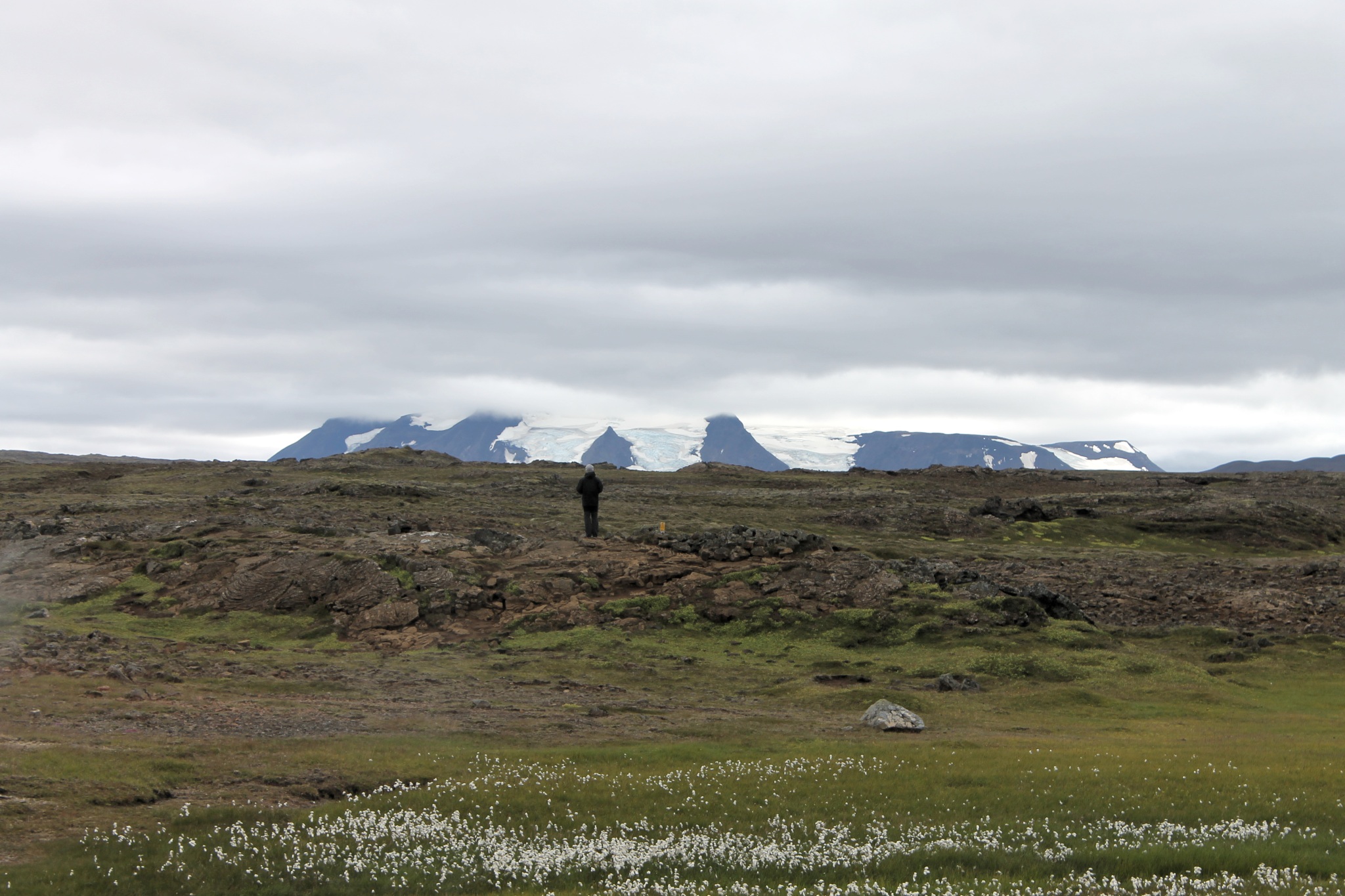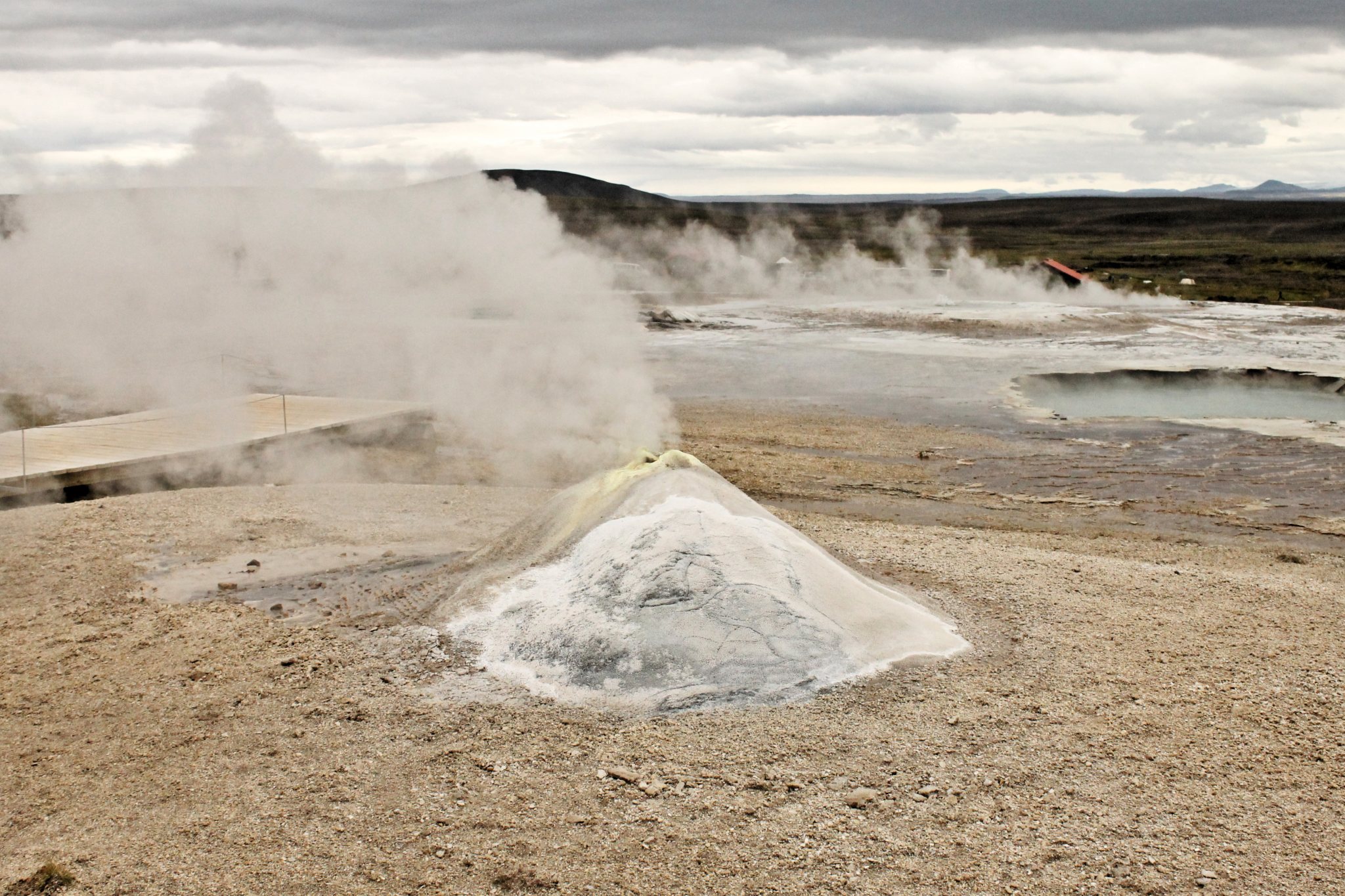 Il a fait froid cette nuit, peut-être -2°C, et du vent. Et un peu de pluie et du vent après. Et au matin du soleil mais pas longtemps. Un peu de bruine, du vent et du soleil avec de la pluie entre les deux. Et des fois tout en même temps. Un proverbe Islandais dit « Si tu n’aime pas le temps qu’il fait, attend 5 min ». En tout cas, il est vrai qu’en Islande il fait beau plusieurs fois par jour. On passe la journée à se balader en suivant quelques chemins tracés dans la toundra. Hveravellir est situé sur un « Hot spot » très bien aménagé. En s’éloignant, on trouve des chemins un peu plus sauvages. La nature est fragile ici, aussi doit-on rester sur le sentier. A l’entrée du camping, un panneau indique en plusieurs langues « La poubelle la plus proche est à 100km. Merci d’emporter vos déchets avec vous ».