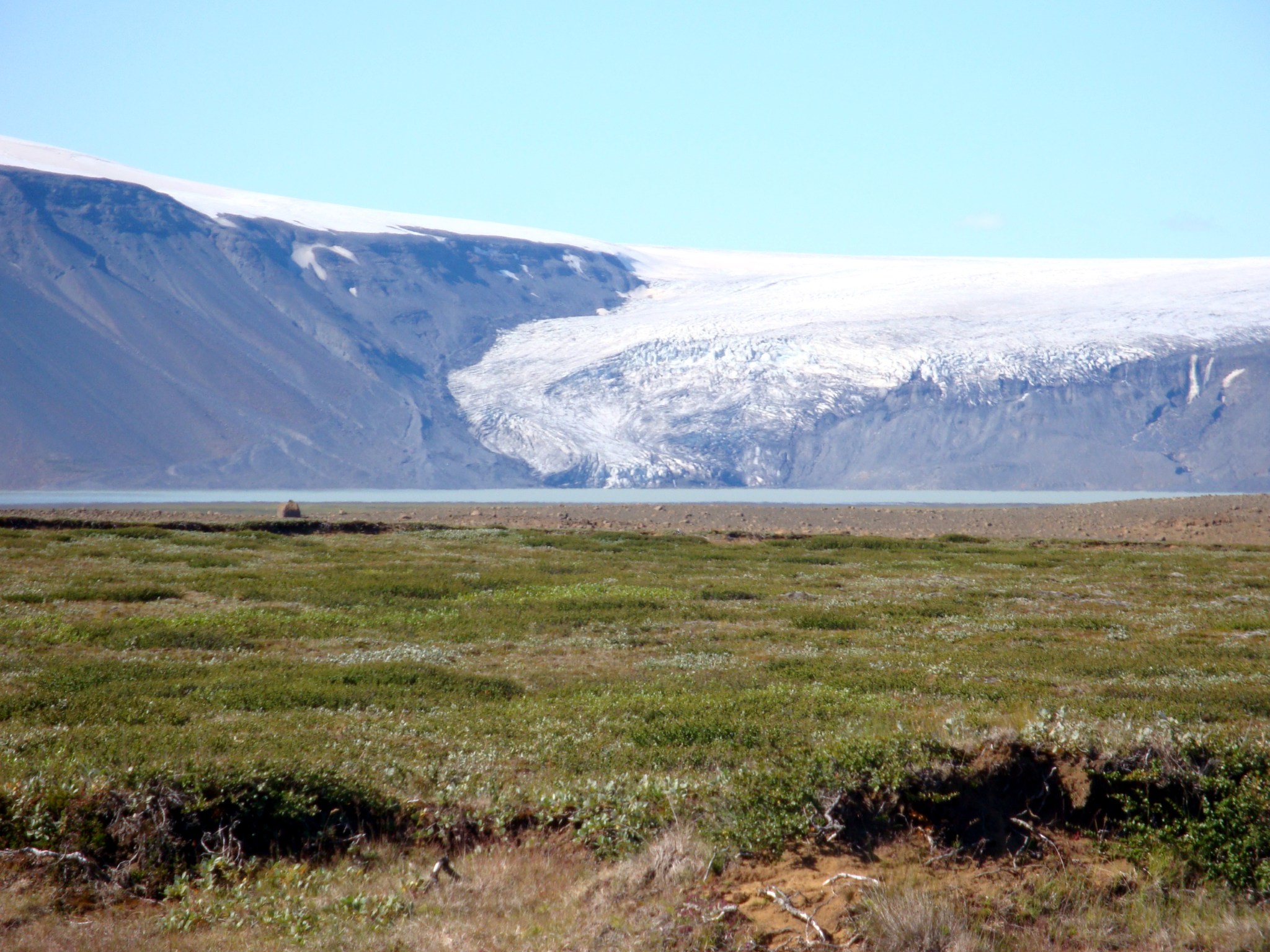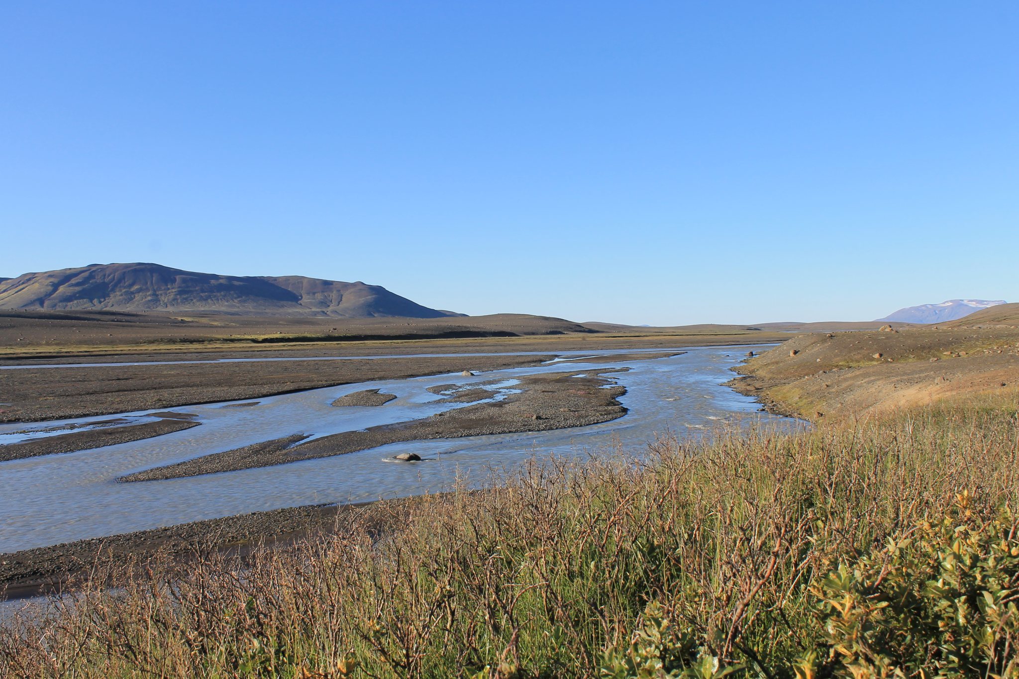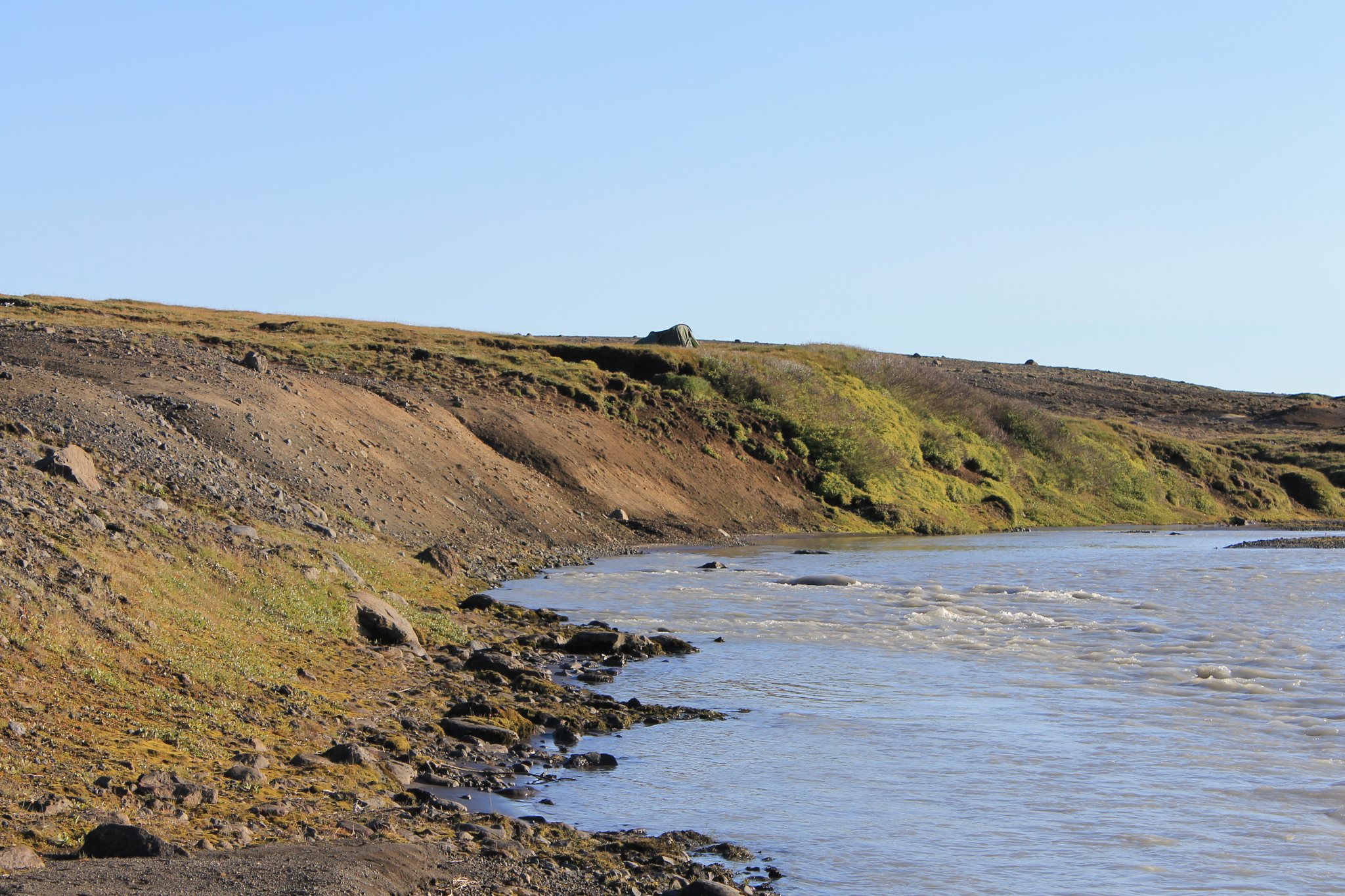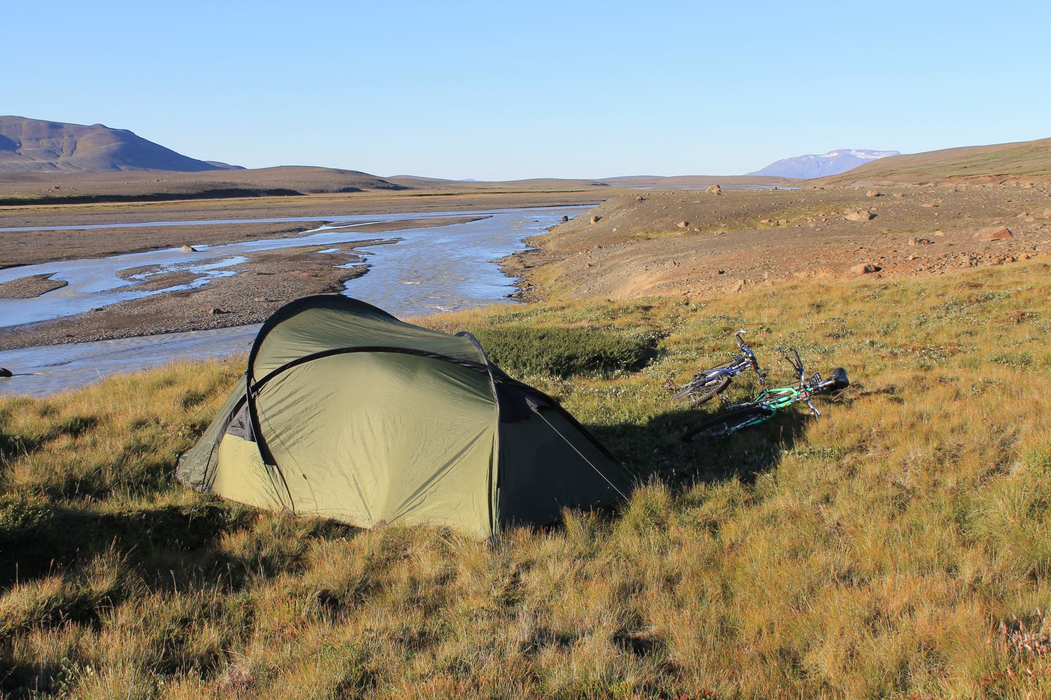 Aujourd’hui, c’est la reprise du vélo et le véritable début de la piste pour nous. La piste est en bon état, semblable à nos chemins blancs français, mais en moins blanc. Ce n’est pas tellement physique mais très cassant et éprouvant car il faut toujours être concentré. Avec près de 20 kg de matériel sur les vélos, il vaut mieux éviter les nids de poule. Après 4h de vélo pour à peine 25 km, transis de froid par le vent du nord, on s’arrête dans un refuge boire une café. La gardienne prend pitié de nous et nous offre une soupe bien chaude. On apprend au passage à dire merci en islandais: tak. Il y a des refuges tous les 30/40 km environ le long de la F35, mais rien ne garanti qu’ils soient ouverts. Au mieux, on peut s’y réchauffer, acheter quelques gâteaux et prendre un café. Au pire… ils possèdent en général un robinet extérieur pour ravitailler en eau, même si l’eau ne manque pas sur cette ile . On repart et on finit par trouver un coin magnifique pour s’installer, au bord d’une petite falaise, la rivière en contrebas, les glaciers en arrière plan. On en profite pour faire un peu de lessive/toilette dans de l’eau à 5°C.