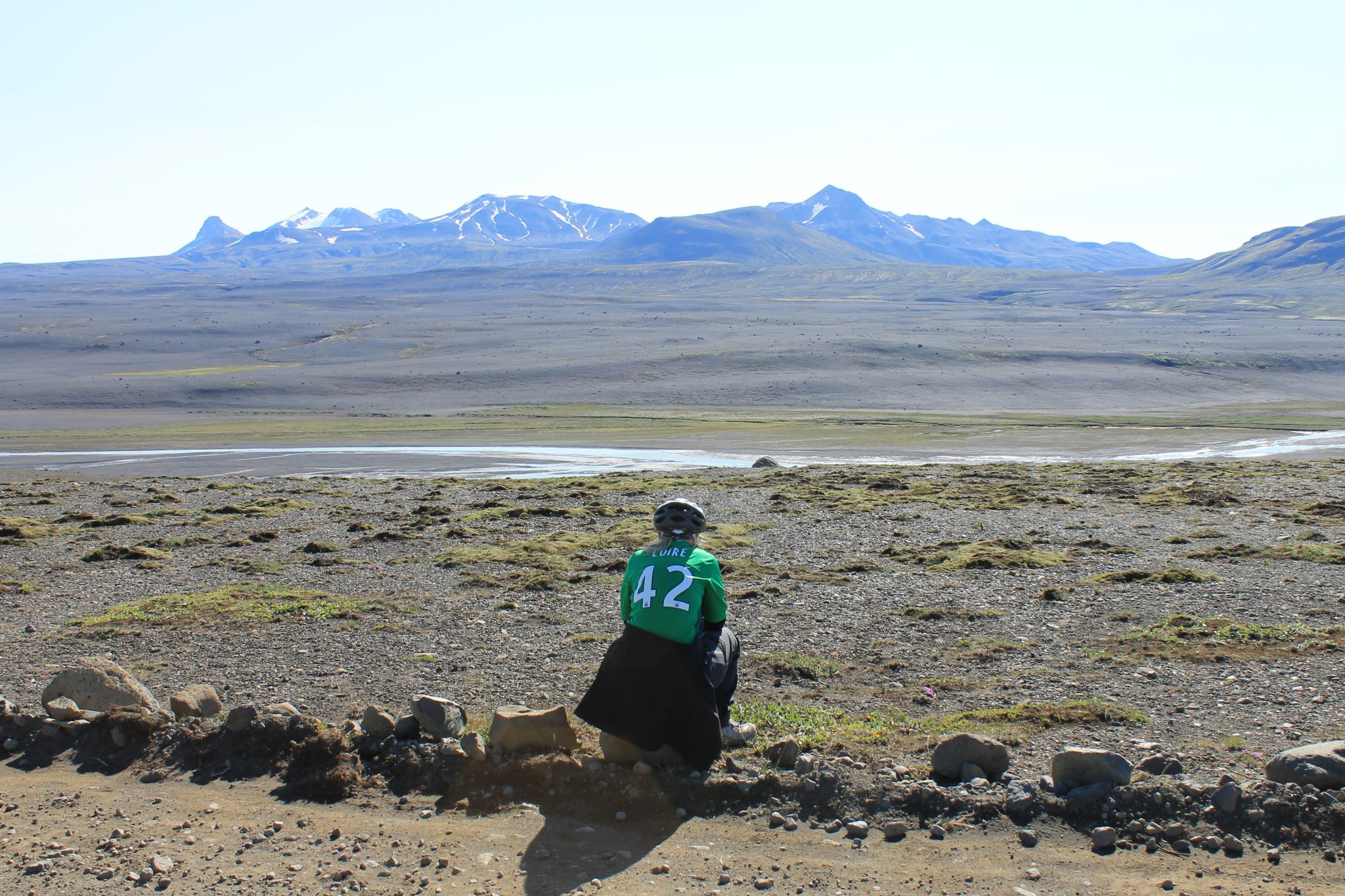 La nuit a été longue, difficile et froide. La température est descendue jusqu’à 1°C mais au petit matin il fait grand soleil. On ne savait pas qu’il pouvait faire aussi beau en Islande : pas un nuage à l’horizon. La vue est superbe. De ce fait, on profite en prenant notre temps pour ranger le campement et on fait du pain. Puis on repart. La journée se déroule sans accroc, des montées, des descente et du vent. Beaucoup de vent.