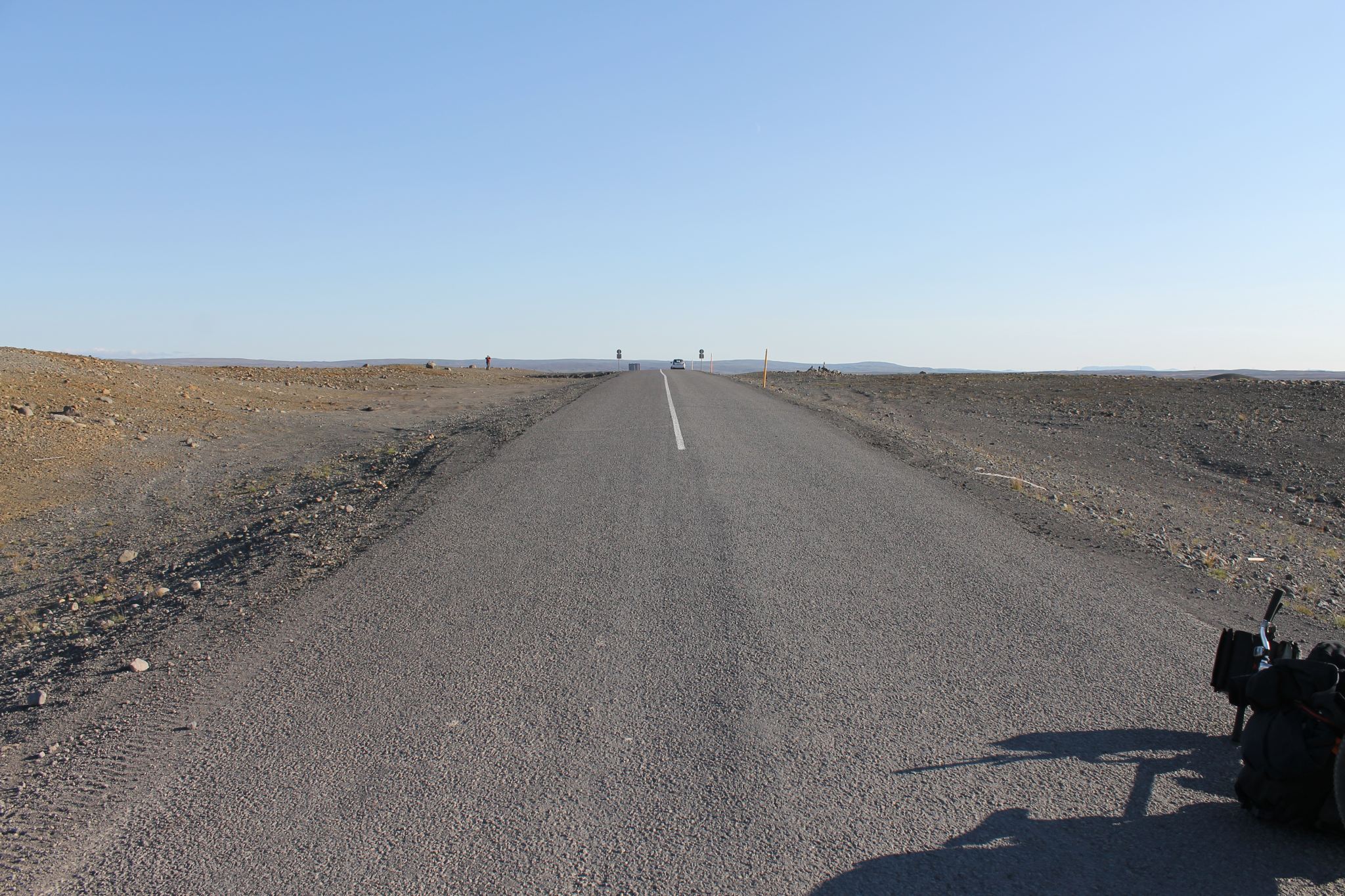 Après une courte nuit au camping, on laisse les valises à la consigne du camping et on se dirige vers l’aéroport de Reykjavik, beaucoup plus petit. Harold – imaginez Oaken le vendeur dans la Reine des neiges. Harold c’est lui – charge les vélos dans la soute. Littéralement. Harold prend les vélos, ouvre la soute de l’avion, pose les vélos et referme la soute. On aurait chargé un sac à dos dans un autocar que ça aurait fait le même bruit. Enfin bon, je vous passe les contrôles de sécurité qui se résume à… rien en fait. Le terminal est grand ouvert sur la piste. Vous n’imaginez pas à quel point c’est reposant de simplement faire confiance aux gens sans avoir à montrer patte blanche tout les dix mètres. Décollage, atterrissage à Akureyri. Là, on passe heure à remonter les vélos, seuls, dans un aéroport absolument désert. On achète à manger au Bonus, du gaz à une station service et on décolle, à vélo cette fois, vers 17h30. C’est parti pour 400km, avec quand même une petite boule au ventre due à l’appréhension.