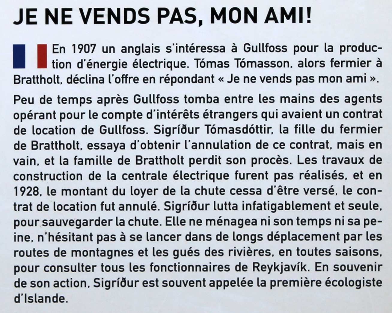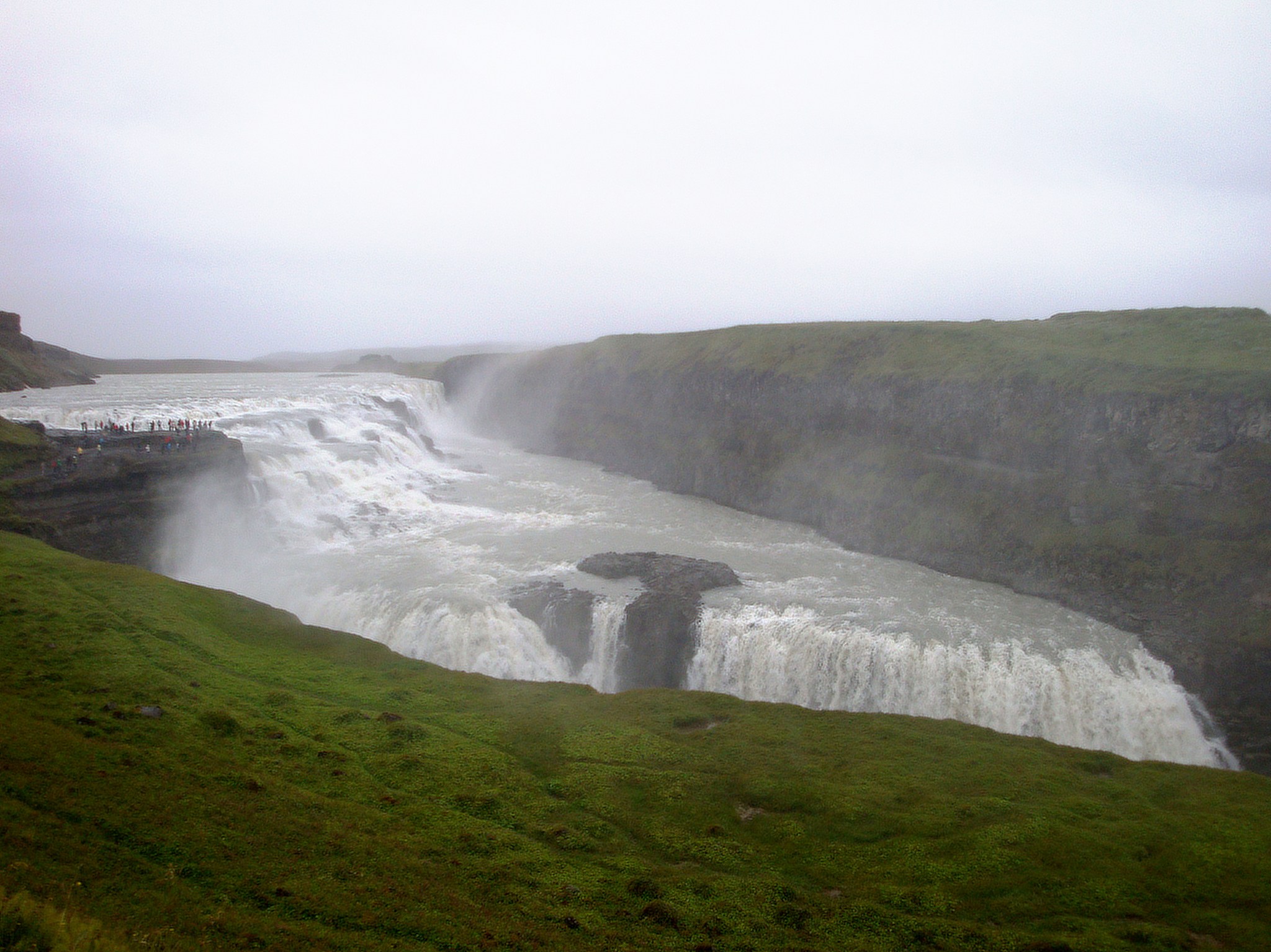 On se réveille dans la grisaille, mais au moins il ne pleut pas. On est en fait au milieu d’un marécage, avec plein de moutons autour de nous. On se met en route, direction les chutes de Gulfoss. Sur le bitume, on avance beaucoup plus vite que sur la piste. Pour la première fois du voyage, on fait vraiment les touristes. On prend notre temps, on prend des photos, on discute un peu avec une cycliste. Les chutes sont assez impressionnantes et très sauvages, mais ça manque de soleil.