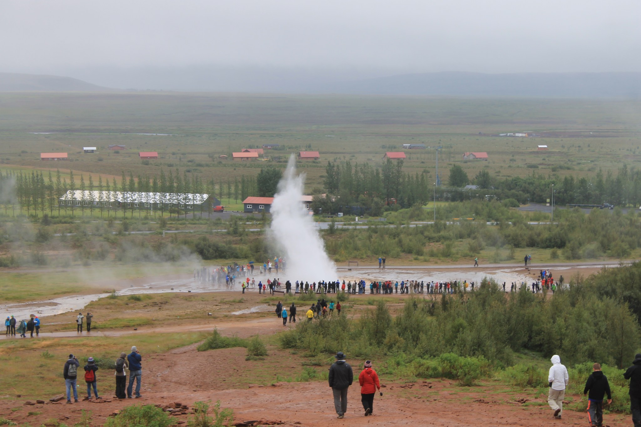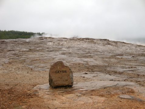 En partant, il commence à pleuvoir. On arrive à Geysir beaucoup plus tôt que prévu. On mange et on se réchauffe à la station service. On s’installe au camping et on va se promener vers les geysers. Mais sous la pluie, c’est un peu triste. On espère qu’il fera plus beau demain. On ne trouve pas de bouteille de gaz. Demain, journée de repos. On va faire une promenade s’il fait plus beau.