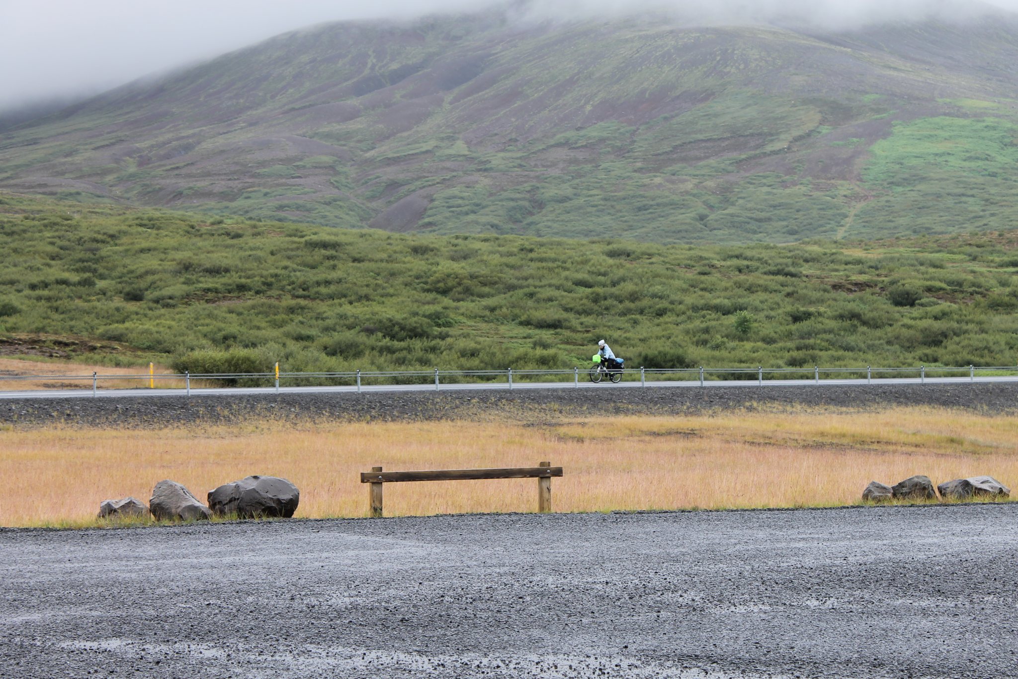 Il pleut. Encore. Tout est humide dans la tente. On reprend la route mais le cœur, les jambes et le moral n’y sont pas trop à cause de ce temps. Heureusement, l’étape du jour n’est pas longue. La route est relativement facile. On arrive vers midi à Laugarvatn, petite bourgade étape entre Geysir et Thingvellir.