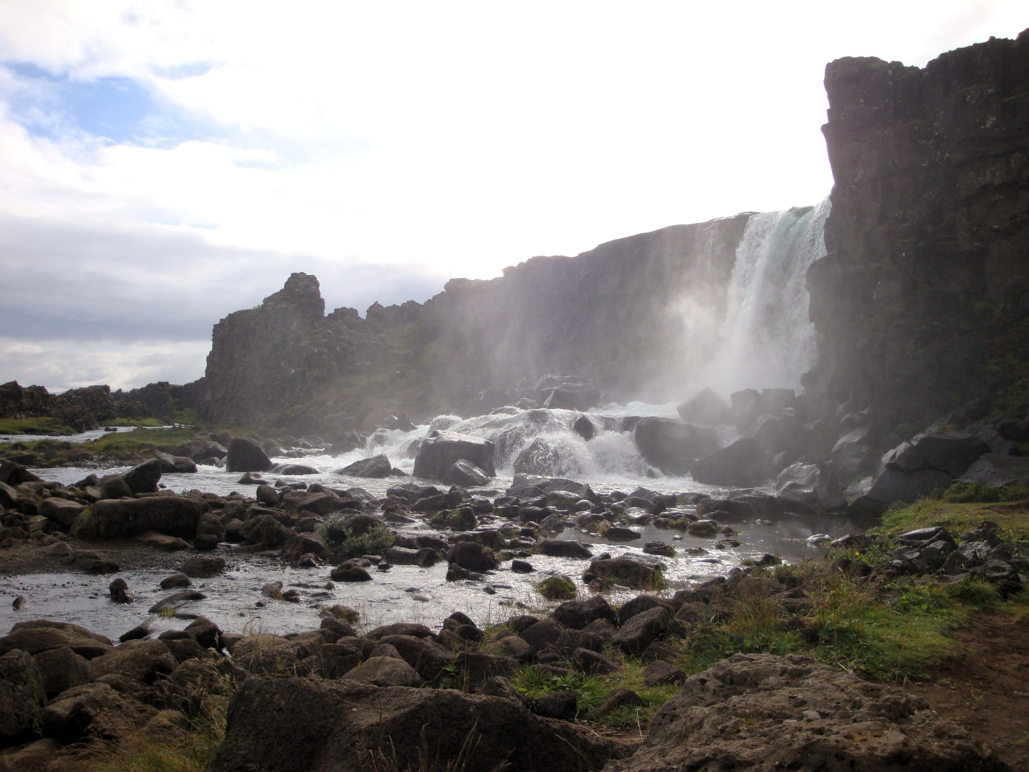 En s’installant au camping on en profite pour sécher les affaires. Pour la première fois depuis trois jours, on est secs et on a presque chaud. On va faire un tour sur le site du premier parlement d’Europe. C’est le site qui nous aura sûrement le plus marqué. C’était le lieu à peu près équidistant de tous les lieux d’Islande donc les islandais avaient décidé de faire leur parlement annuel ici. Les falaises ne sont pas hautes mais sont très imposantes, on rentre fatigués au camping. Demain, retour à Reykjavik. La route risque d’être longue, on espère qu’il fera beau.