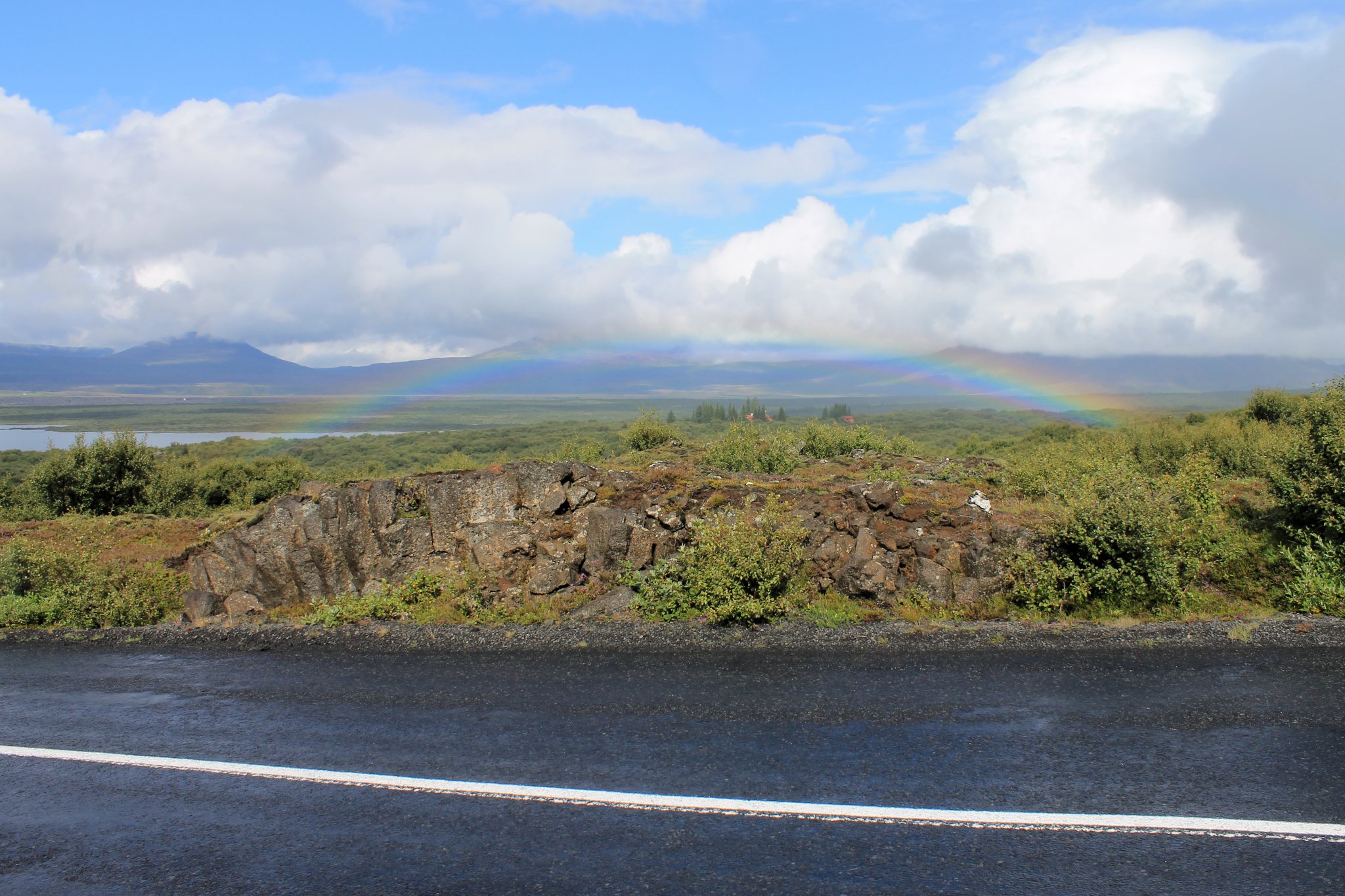 Le ciel se dégage un peu. Un arc en ciel se forme, de quoi nous redonner le moral. La route qui longe le lac de Thingvellir et va au camping est pleine de montées-descentes. On arrive vers 13h. La pluie s’est arrêtée, le soleil pointe le bout de son nez. Le moral remonte.