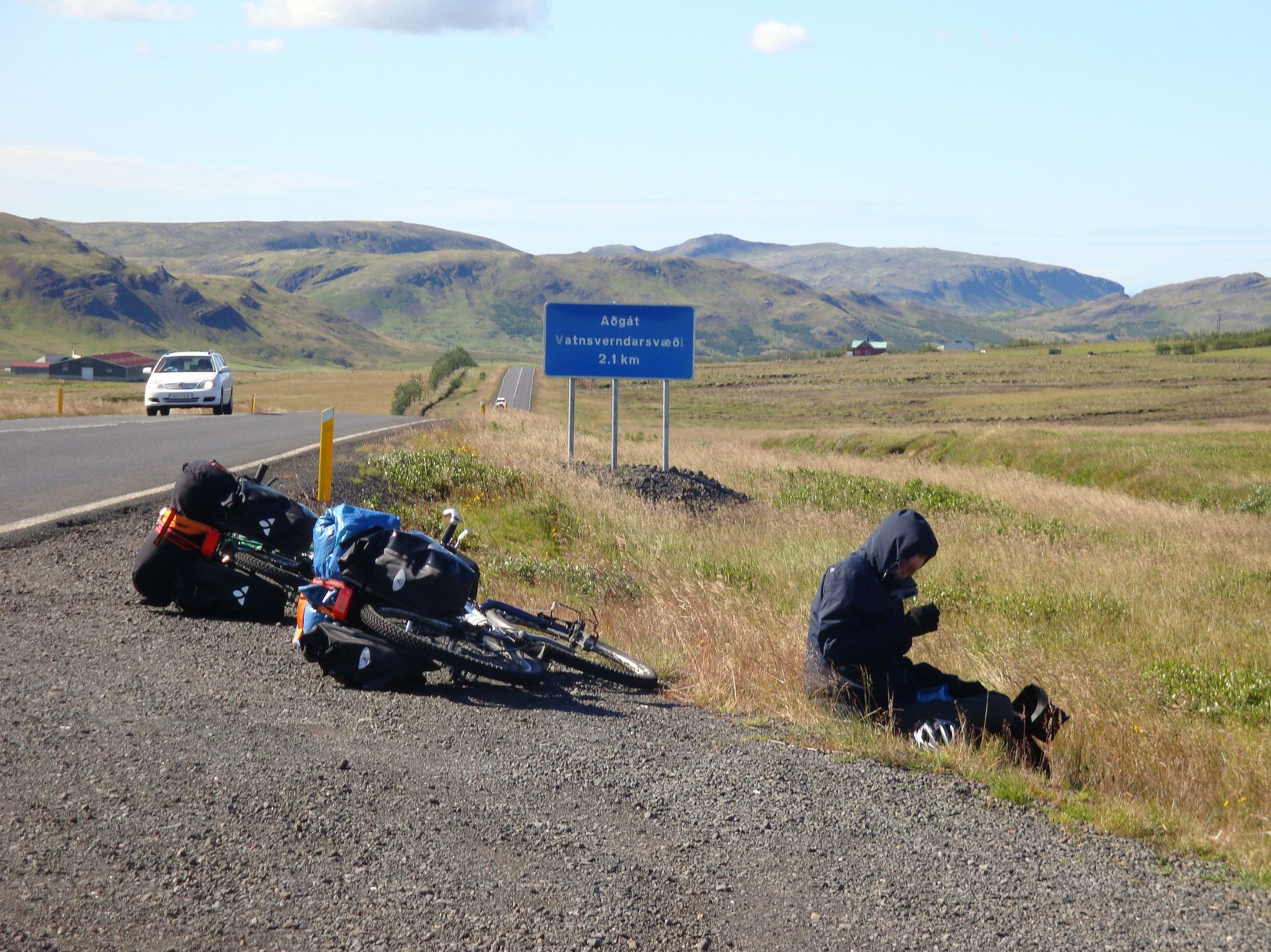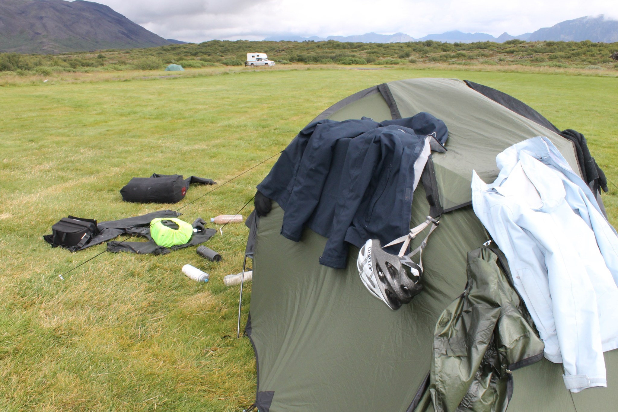 Au camping, comme d’habitude, il n’y a personne et aucun prix affiché. On s’installe, on verra le prix plus tard. On croise un cycliste slovène qui nous dit qu’il a pris la F26 sous la pluie pendant trois jours, puis il en a eu marre et a pris le bus pour abandonner. On achète à manger et du gaz à la station service. Ce gaz supplémentaire nous permet de sécher un peu quelques vêtements, mais ce n’est pas très efficace. La chaleur du réchaud est trop localisée. Demain on met le cap sur Thingvellir.