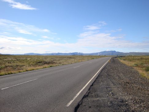 Au réveil, il fait très beau. On profite de cette météo pour rentrer à Reykjavik. On ne roule pas très vite. La route est pleine de montées-descentes et surtout il y a un vent froid de côté qui nous pousse sur la route. Mais toute la partie autour de Thingvellir est très belle. A midi, on s’arrête manger un sandwich.