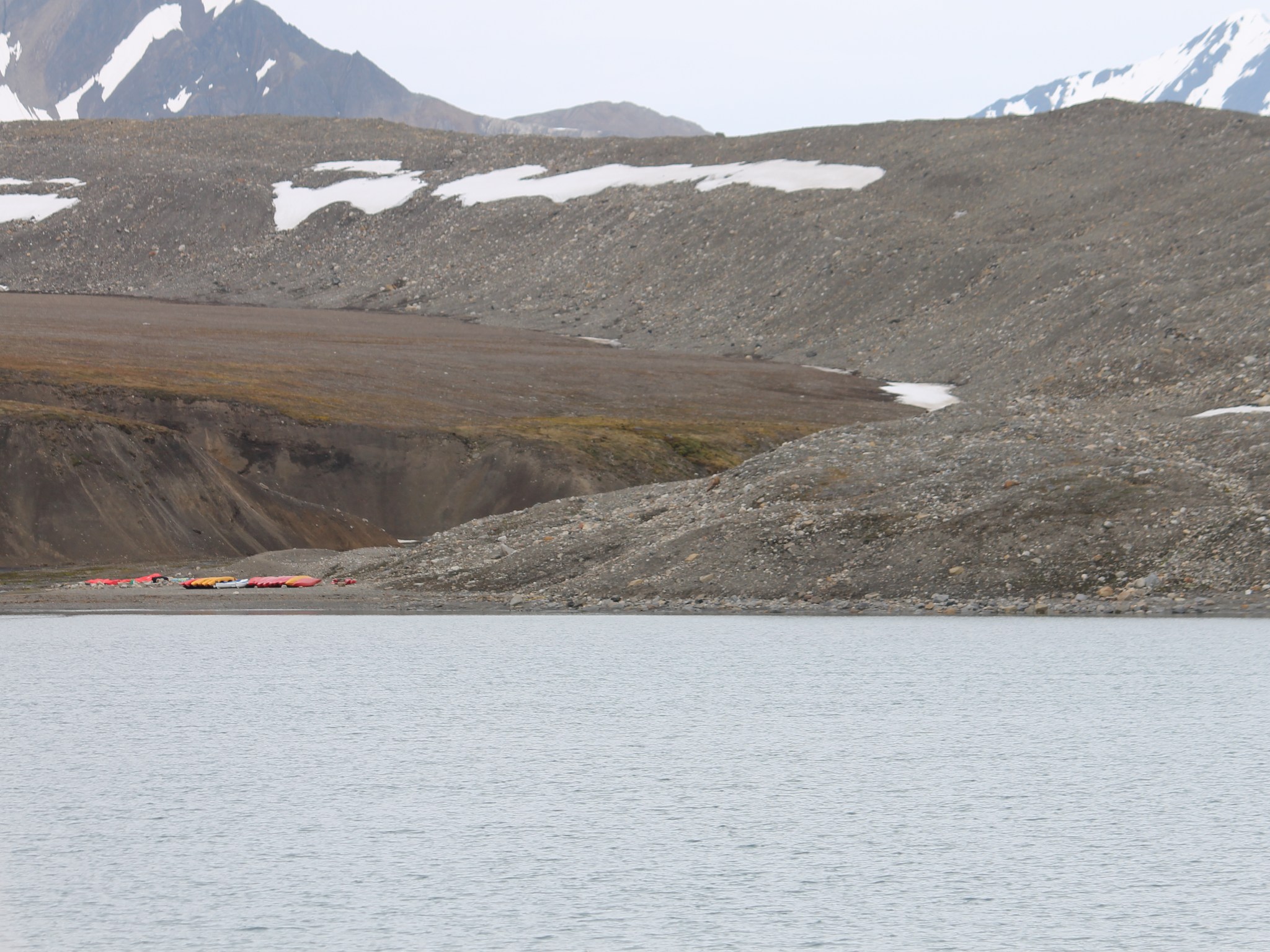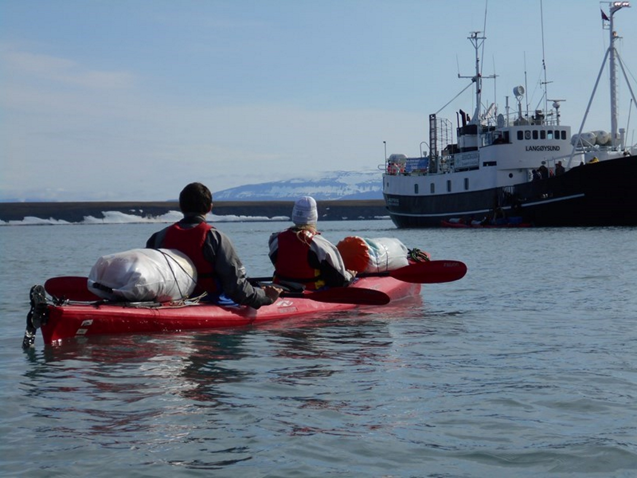Programme du jour : Rejoindre le camp de base d’Alkhornet, de l’autre côté. On remballe les tentes et on charge les kayak. Un bateau fait un détour pour nous livrer le sac de notre guide qui s’était attardé à Bagdad entre Genève et Oslo…