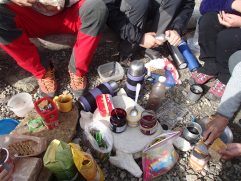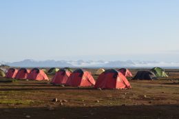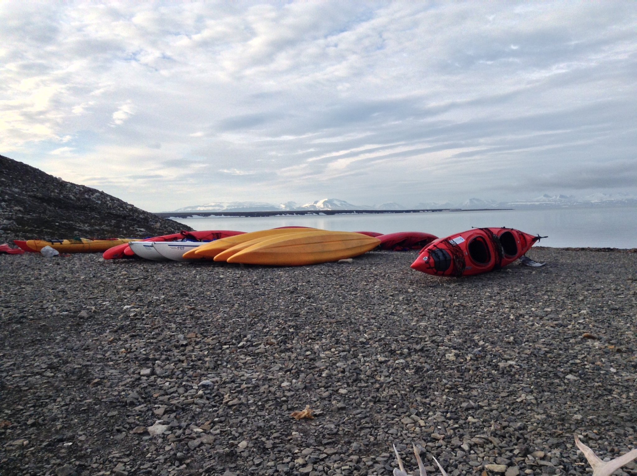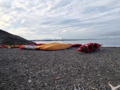 Le temps se gâte pour la traversée. Nous pagayons plus d’une heure au milieu de l’eau, notre destination visible de l’autre côté tout au long du trajet, la mer est agitée d’une légère houle. Nous arrivons finalement sous le soleil pour monter le camps. A l’heure du repas, la tempête se lève. Blottis les uns contre les autres pour manger dans la tente commune, nous commençons à nous rendre compte de la force des éléments dans ces contrées sauvages. Le mât de notre abri ploie au rythme des rafales. Dehors, une tente s’est faite arrachée, plusieurs autres risquent de s’envoler. Malgré leur 50kg et leur formes profilées, les kayaks ont glissé sur plusieurs mètres, trainés par le vent. Nous lestons les embarcations de pierres et retendons les haubans des tentes. Le vent souffle ainsi une bonne partie de la nuit mais sans faire d’autres dégâts.