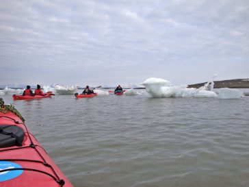 Repas autour du feu au milieu des cailloux, du bois flotté comme combustible, une vertèbre de baleine comme table basse. Le guide nous forme sur l’utilisation des balises Argos, du téléphone satellite et du pistolet d’alarme. Puis montage des tentes. Laure et moi retrouvons les réflexes hérités de l’Islande. Nettoyage des cailloux, montage des arceaux, accrochage de la bâche, ces gestes simples font remonter à la surface d’innombrables souvenirs. Une fois le campement monté, nous prenons la direction les kayaks pour une petite balade au bord du glacier. Les premier icebergs nous attendent. Bien qu’insignifiants comparés aux montagnes de glaces du Groenland, ces « petits » blocs de glace font déjà plusieurs tonnes. Puis, le monstre. Le fleuve de glace de 3 km de large vie, respire, chacun de ses grognements gronde comme le tonnerre et s’entend à plusieurs kilomètres, des blocs de glaces gros comme des autobus se détachent et tombent dans la mer. Nous revenons au camp pour notre première nuit sur la terre des ours.