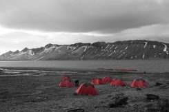 Deux heures et demie plus tard, le camp de base est en vue sur les berges du glacier d’Esmarkbreen dans la bain d’Ymerbukta. Les kayaks dorment paisiblement sur les rives du fjord, abrités des caprices de l’océan arctique. Le zodiac nous débarque avec le matériel et les vivres puis nous abandonnent à notre sort, seuls, totalement coupés du monde pour les sept prochains jours.