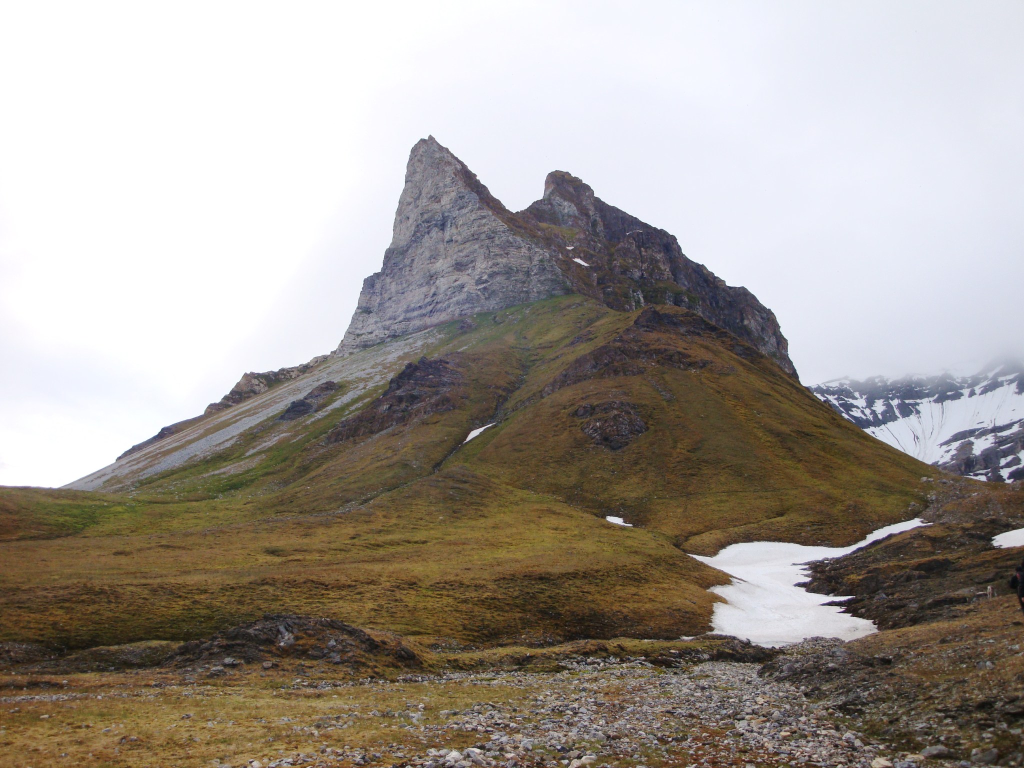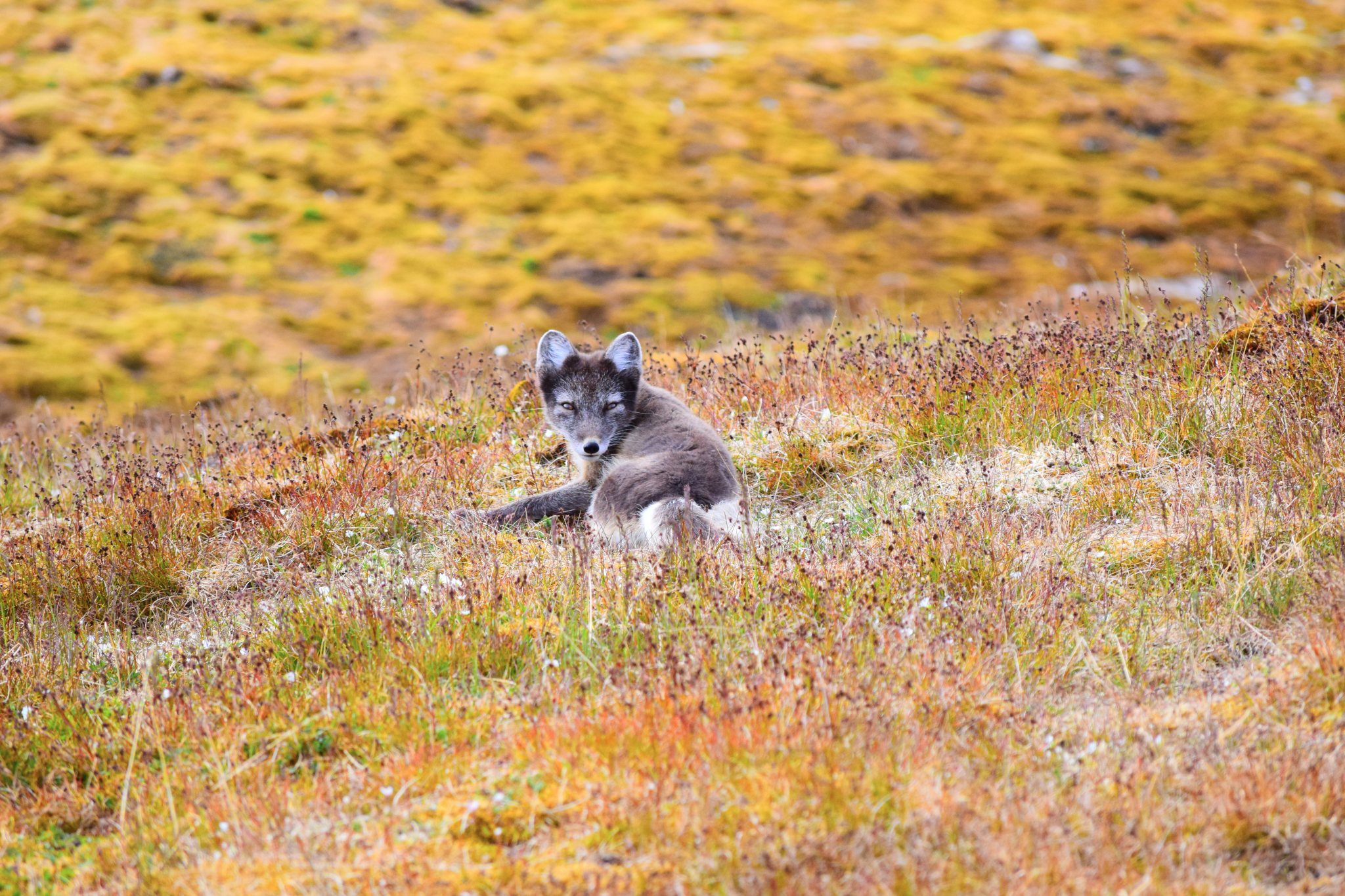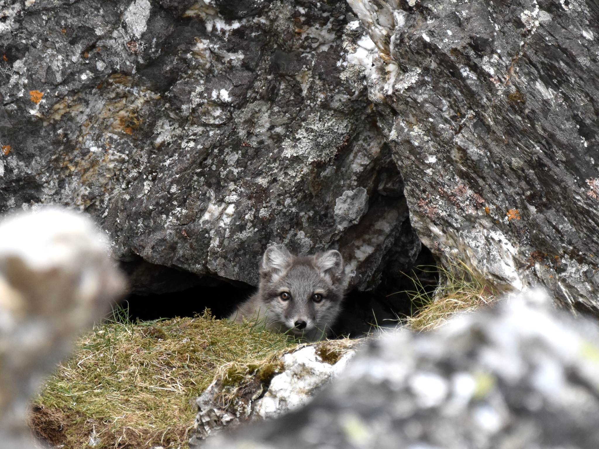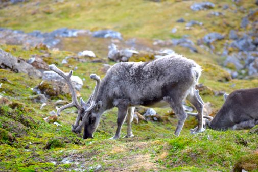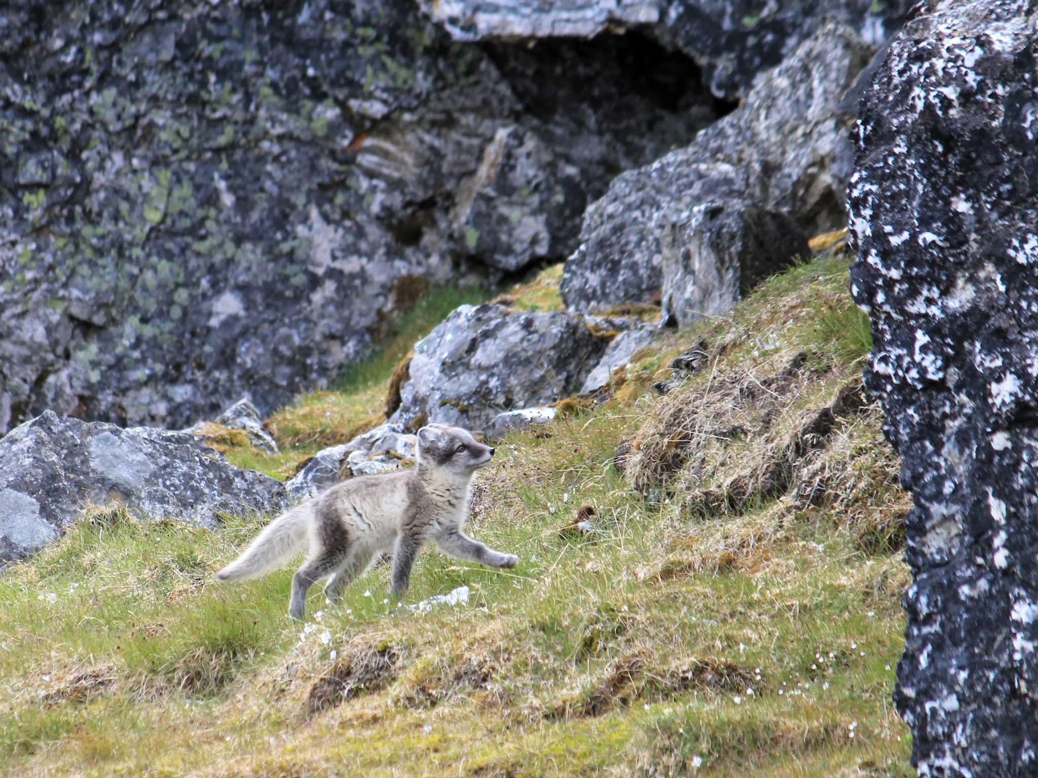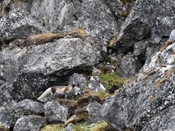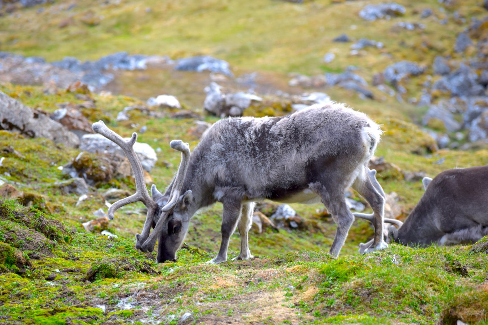 Nous arrivons au pied de l’apic rocheux qui culmine à 400 mètres et qui est le lieu d’un véritable écosystème miniature de quelques hectares : Le promontoire faisant un point d’envol idéal, de nombreux oiseaux s’y sont installés. Les petits ou les œufs qui tombent ont attiré des renards polaires au pied de la falaise. Les fientes et déjections ont apporté de la matière organique, qui à permis à la toundra de se développer, attirant ainsi des rênes. Le contraste entre désert de caillou et plaine verdoyante est saisissant. Nous prenons un repas au milieu des rênes dans cet oasis de verdure.