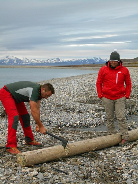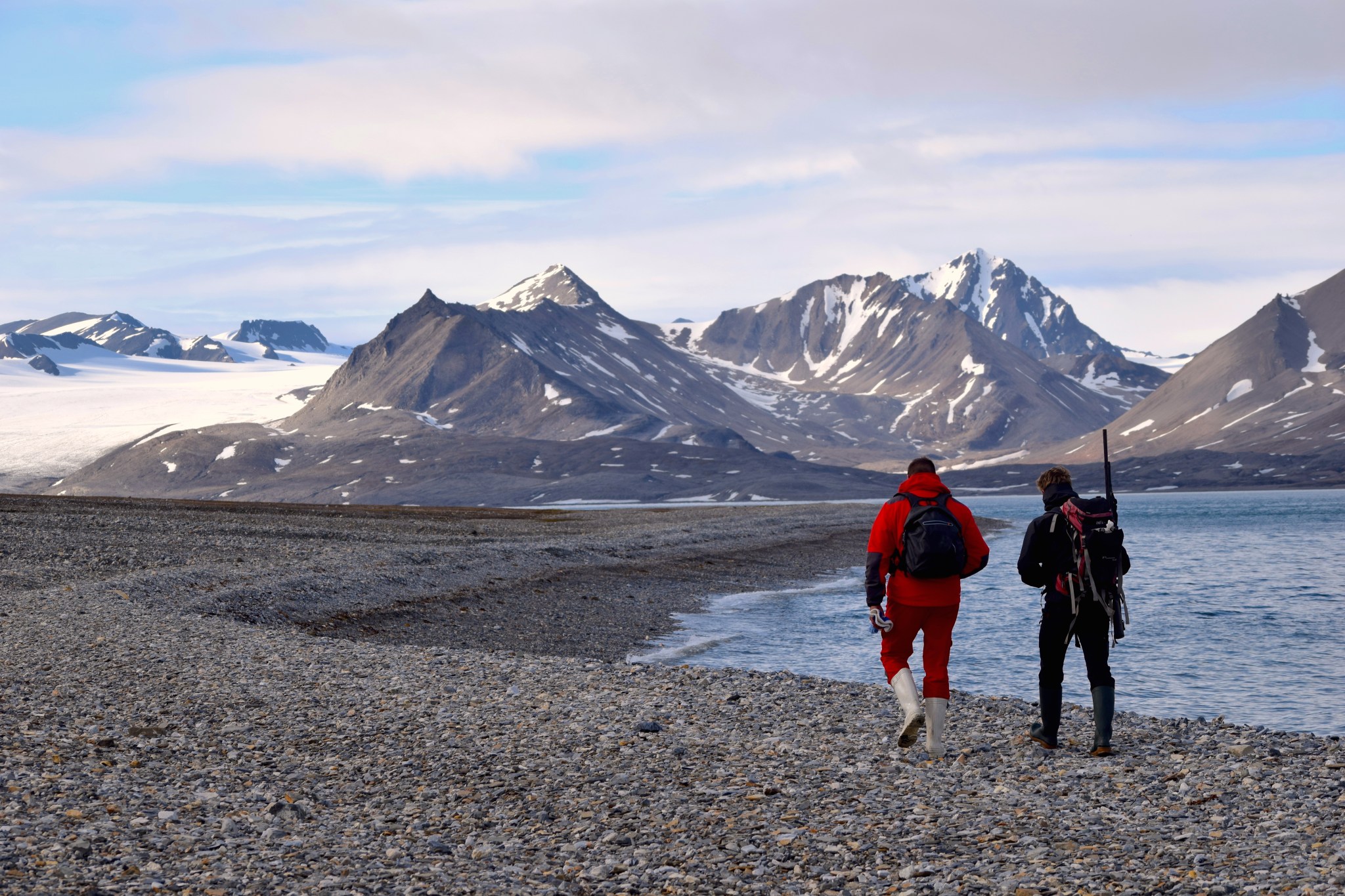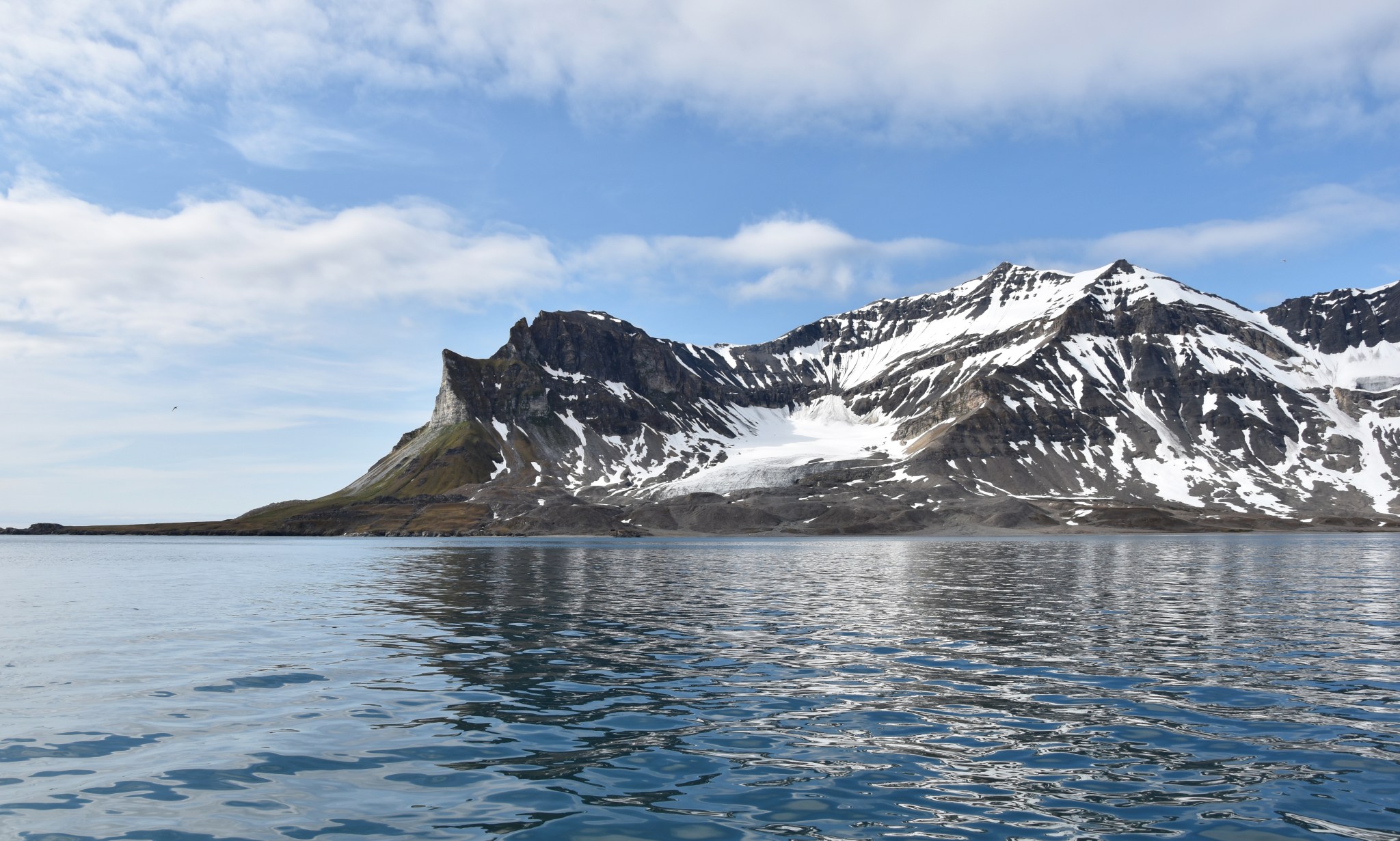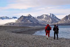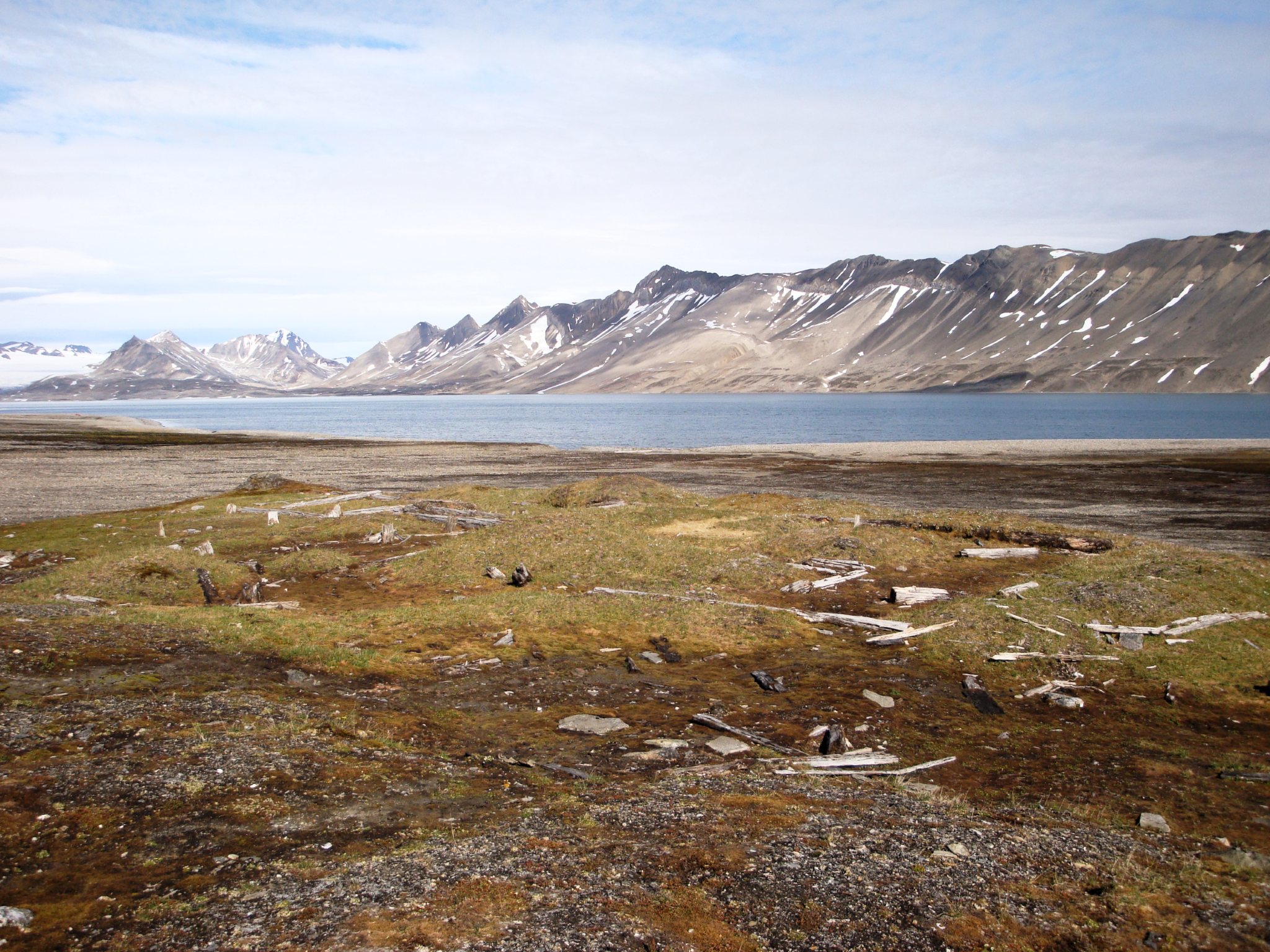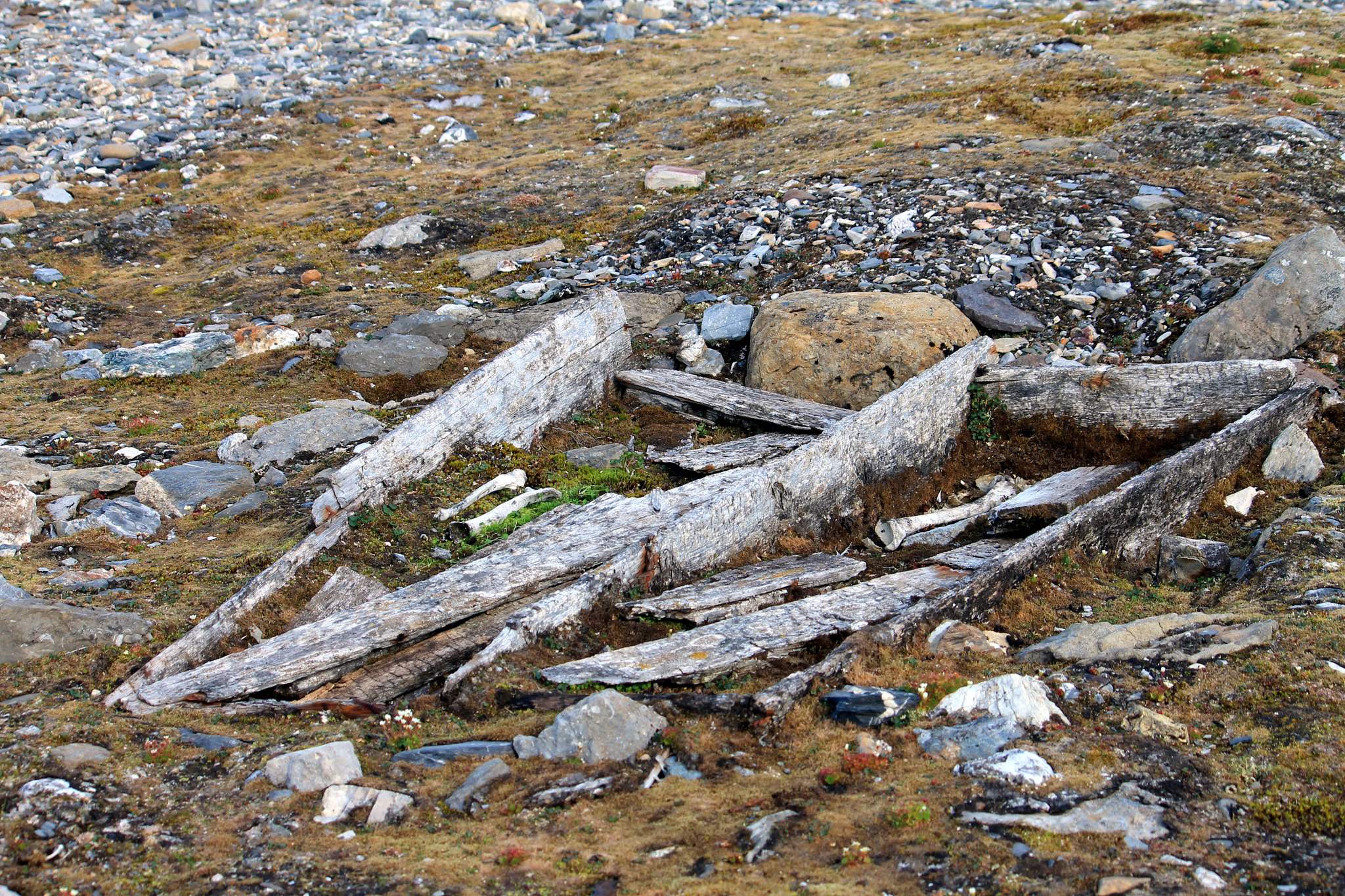 Une belle journée s’annonce, si l’on peut parler de journée dans un monde où le soleil se couche le 25 août. Nous partons randonner le long du fjord jusqu’aux falaises d’Alkhornet. Nous croisons quelques vestiges ainsi que les tombes d’anciens marins Pomors. Les corps ont été depuis longtemps dévorés par les ours, mais les cercueils demeurent ici depuis près de 5 siècles protégés par le permafrost.