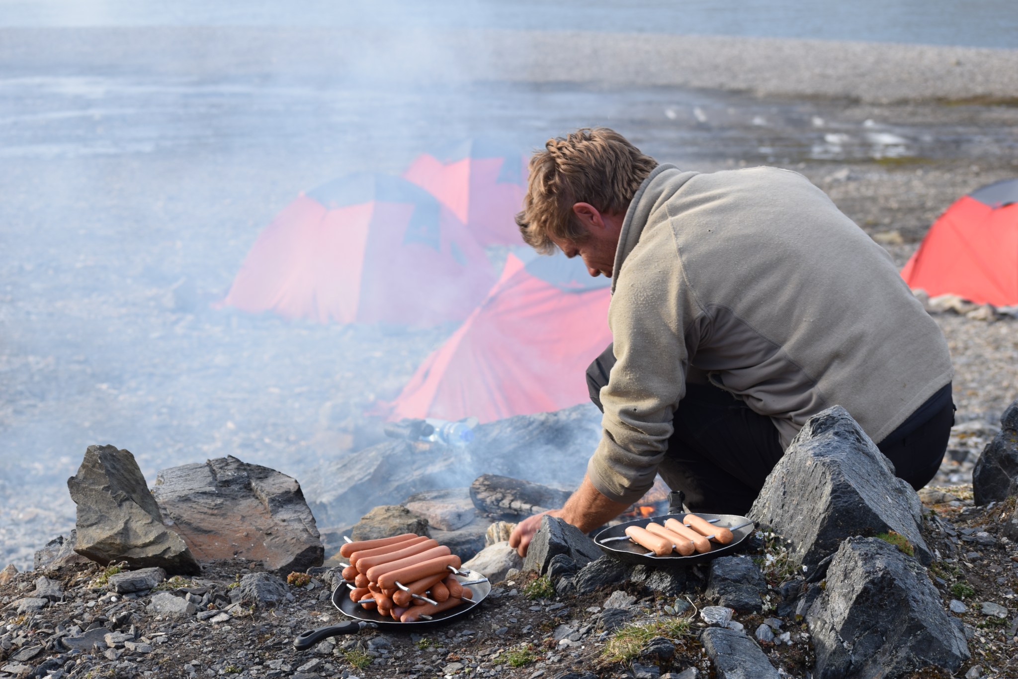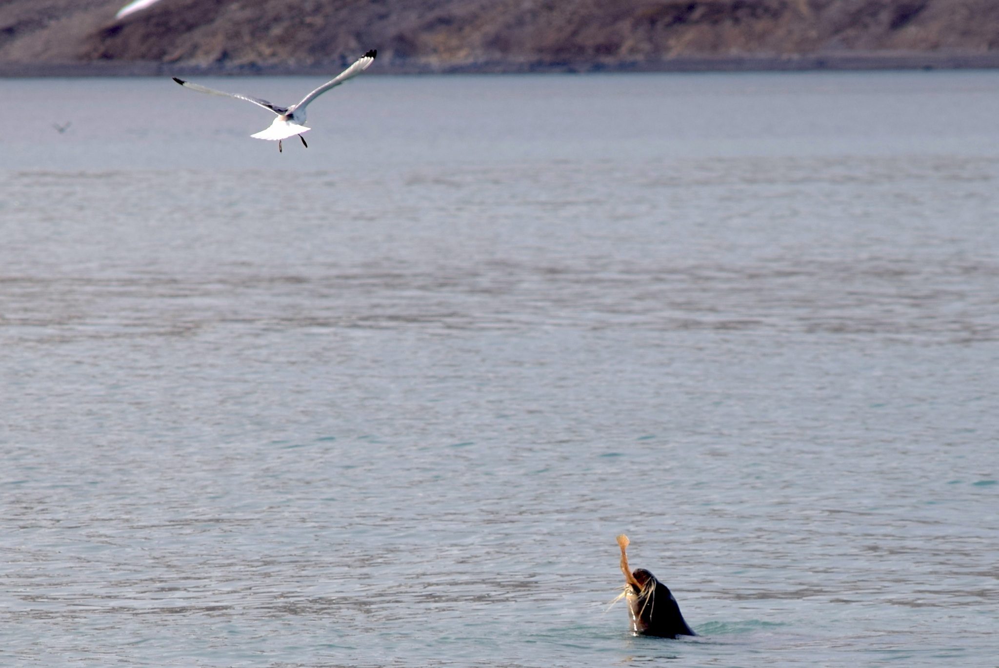 Cette magnifique journée se termine au camp de base autour d’un barbecue de saucisses fumées au bois flotté. A quelques dizaines mètre de la berge, une mouette et un phoque se disputent un poisson. Cette nuit, Laure et moi sommes de garde.