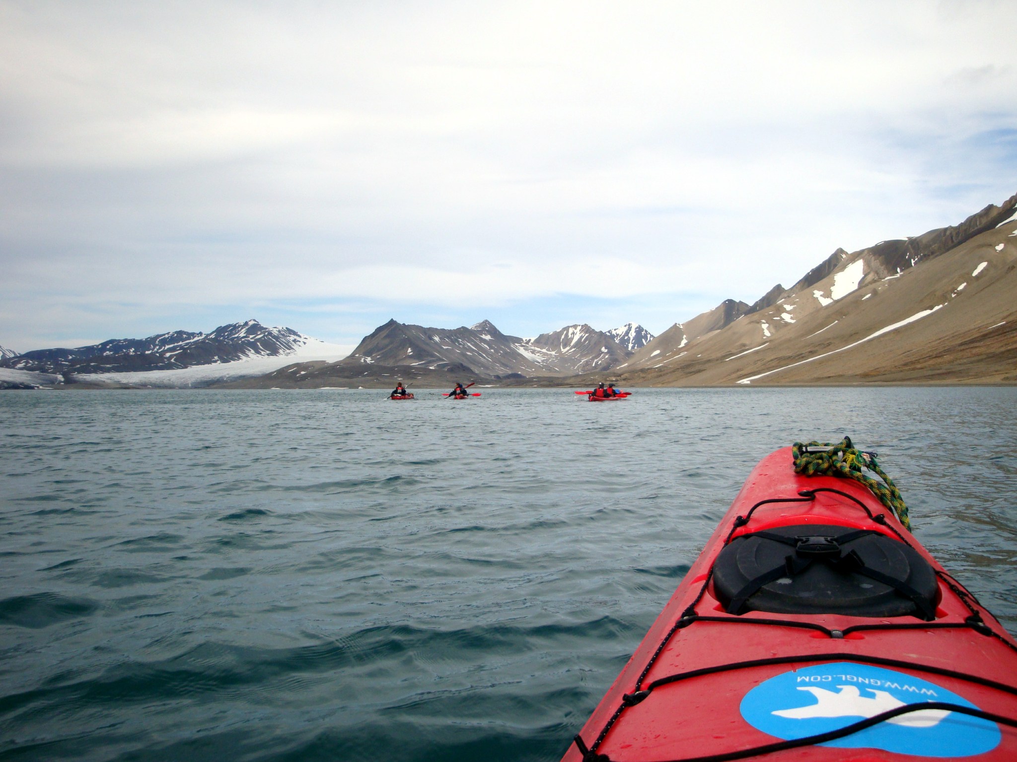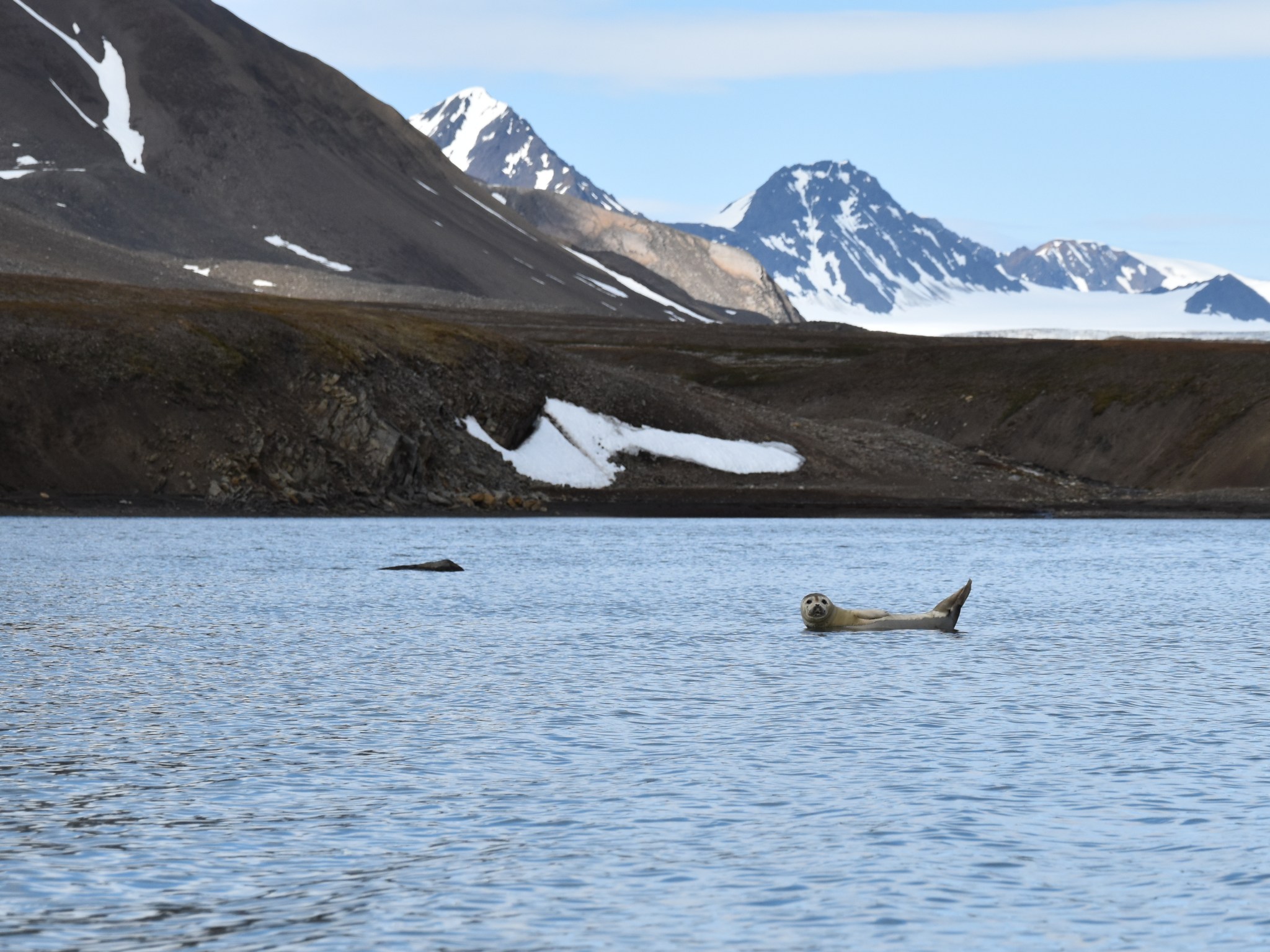 Un fois sorti du fjord, le vent et la houle se ressentent d’avantage. Il y a quelques petites méduses, les creux de la houle atteignent plus d’un mètre de haut. De quoi renverser notre embarcation si ne nous sommes pas vigilant. On s’arrête quelques instants pour observer un phoque annelé inféodé à son caillou. Celui ci est plus craintif que les phoques barbus mais aussi plus curieux, Il retourne rapidement dans l’eau en nous voyant arriver mais tourne autour de nous en nous observant pendant plusieurs minutes. Nous croisons ensuite un autre groupe de kayakistes qui se rend au camp d’Alkhornet. Nous arrivons à Ymerbukta alors que le temps commence à se gâter. Il est 18h quand nous décidons d’aller faire une balade à pied, l’avantage sous ces latitudes est qu’on n’a pas peur de se faire surprendre par la nuit.