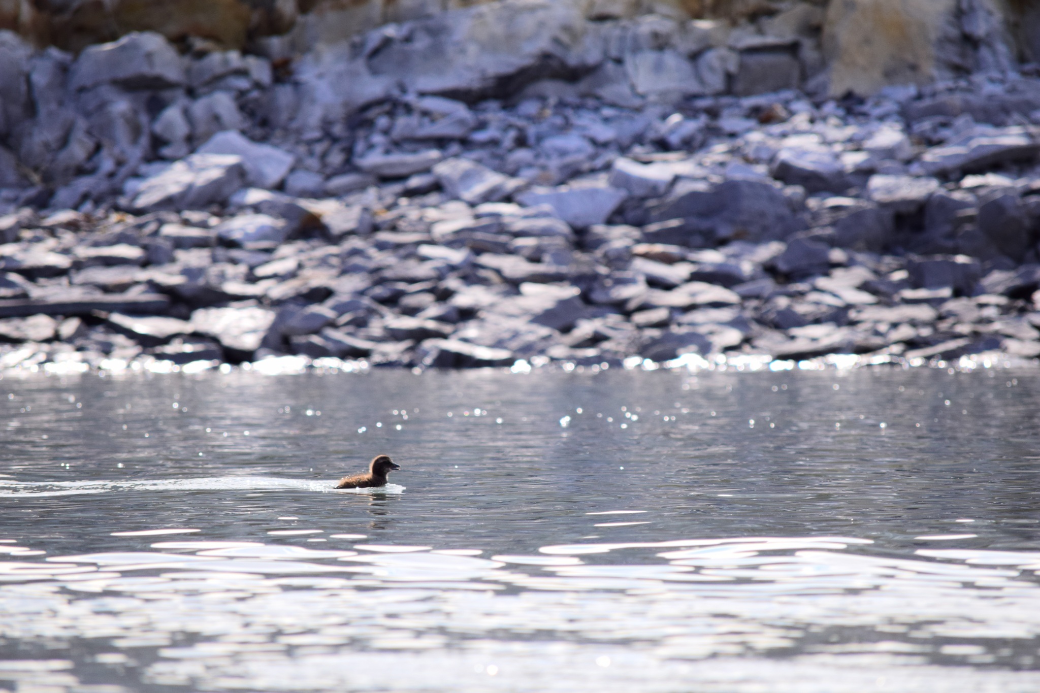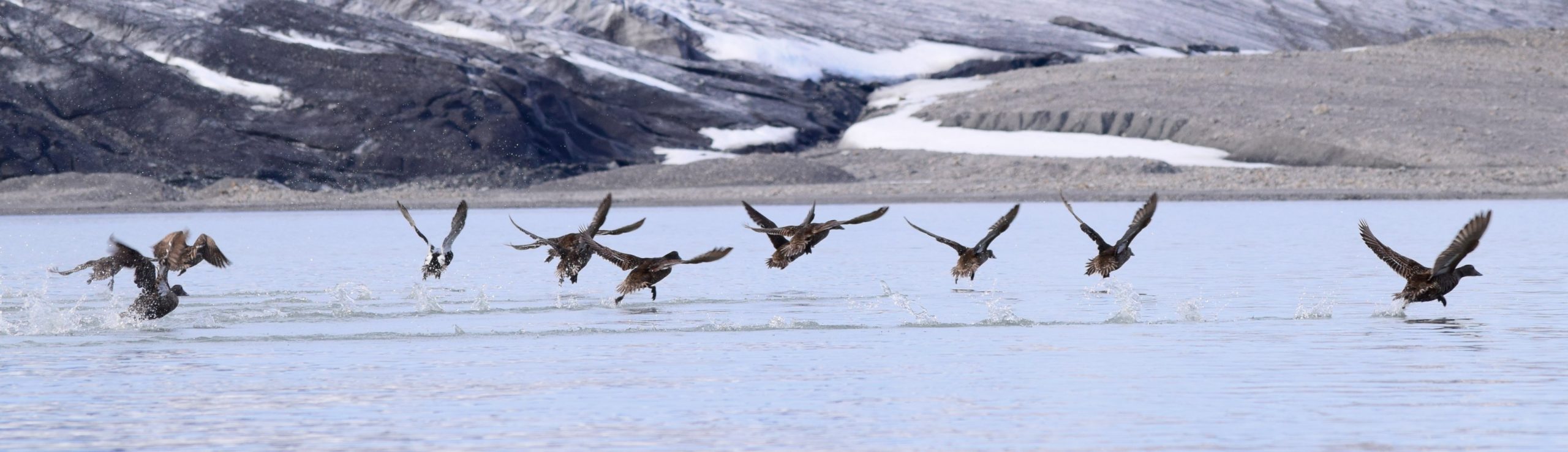 Après un petit déjeuner, nous partons visiter le fond du fjord et les 3 glaciers. Première halte sur la rive opposée où s’étend un ancien cimetière de morses. Ce sont les restes des chasseurs Pomors qu’on a vu la veille, Ils venaient dépecer les morses ici il y a trois siècles. La toundra prolifère à cet endroit alors que tout le reste n’est que cailloux. Dans ce monde hostile, le moindre apport en matière organique favorise la flore locale. Cette petite visite permet aussi de surveiller la présence d’ours sur le glacier. Rien a signaler, On peut repartir en kayak vers deux petites îles sur lesquelles on observe de nombreux oiseaux et leurs petits ainsi qu’une population de canards eider, identifiable à son vol lourd et peu élégant.