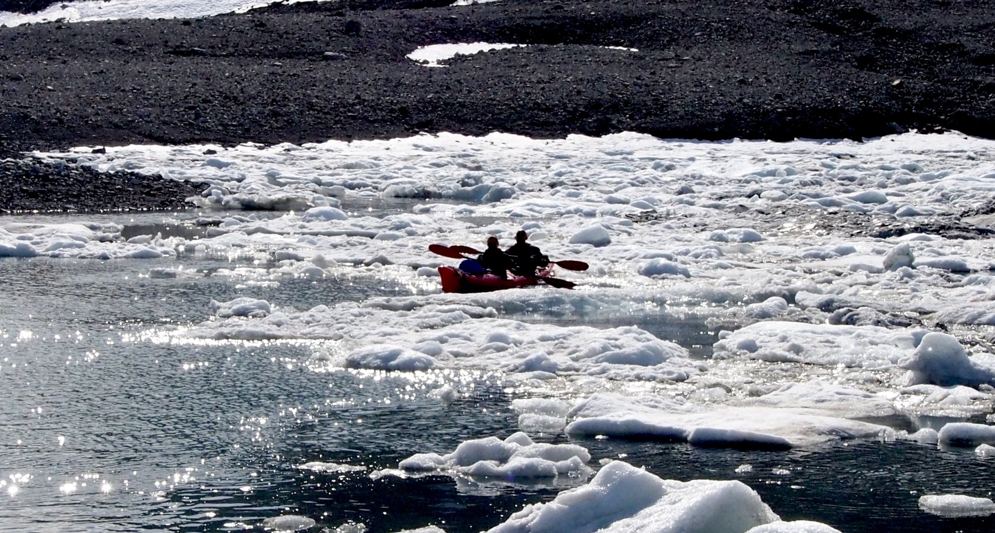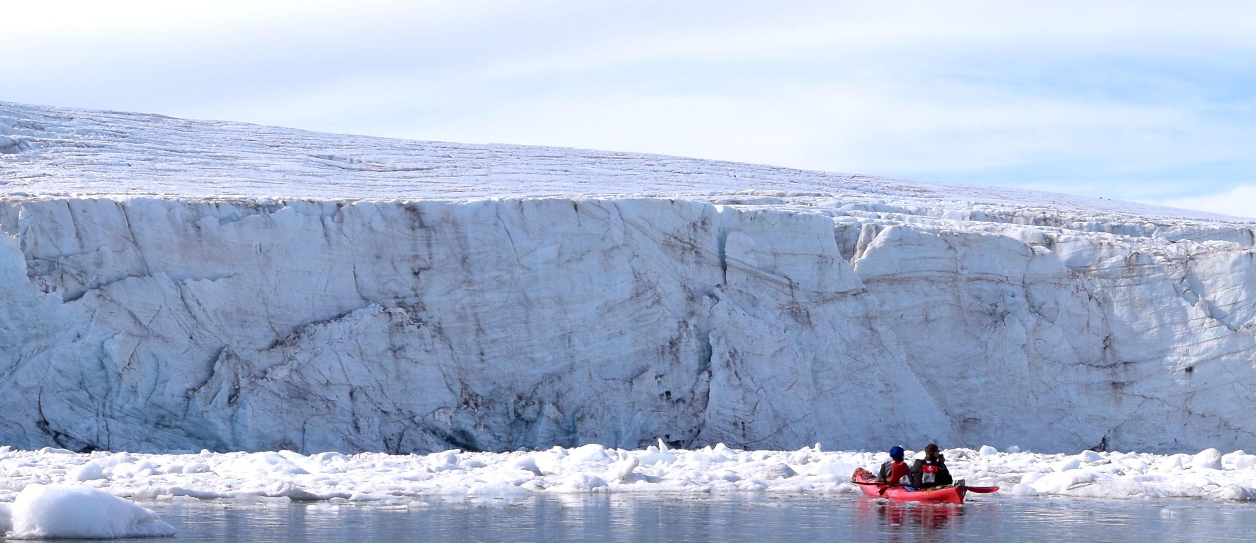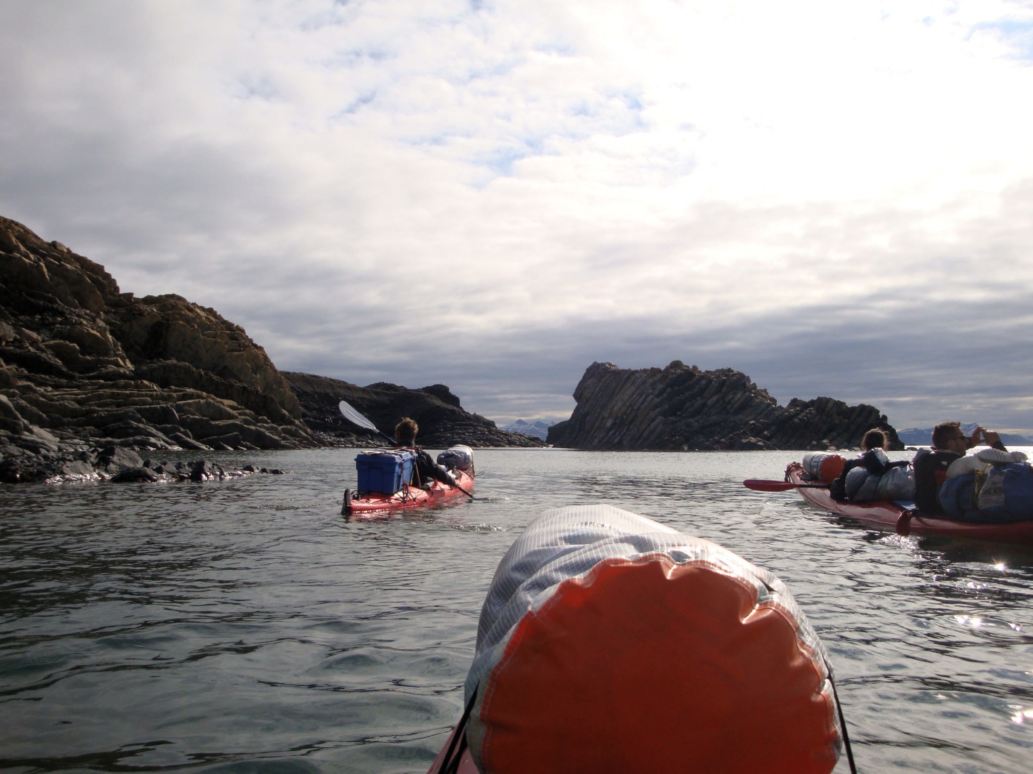 Nous nous rapprochons du glacier et rencontrons un phoque roux couché sur son iceberg. Ce dernier n’est pas effarouché et semble plutôt surpris de voir cinq embarcations glisser silencieusement vers lui. Nous nous arrêtons ensuite pour manger au pied du glacier. Au moment de repartir, la marée montante a repoussé la banquise vers le fond du fjords, nous barrant le chemin pour sortir. Ils nous faudra trouver un passage dans ce labyrinthe de glace pour retourner au camp.