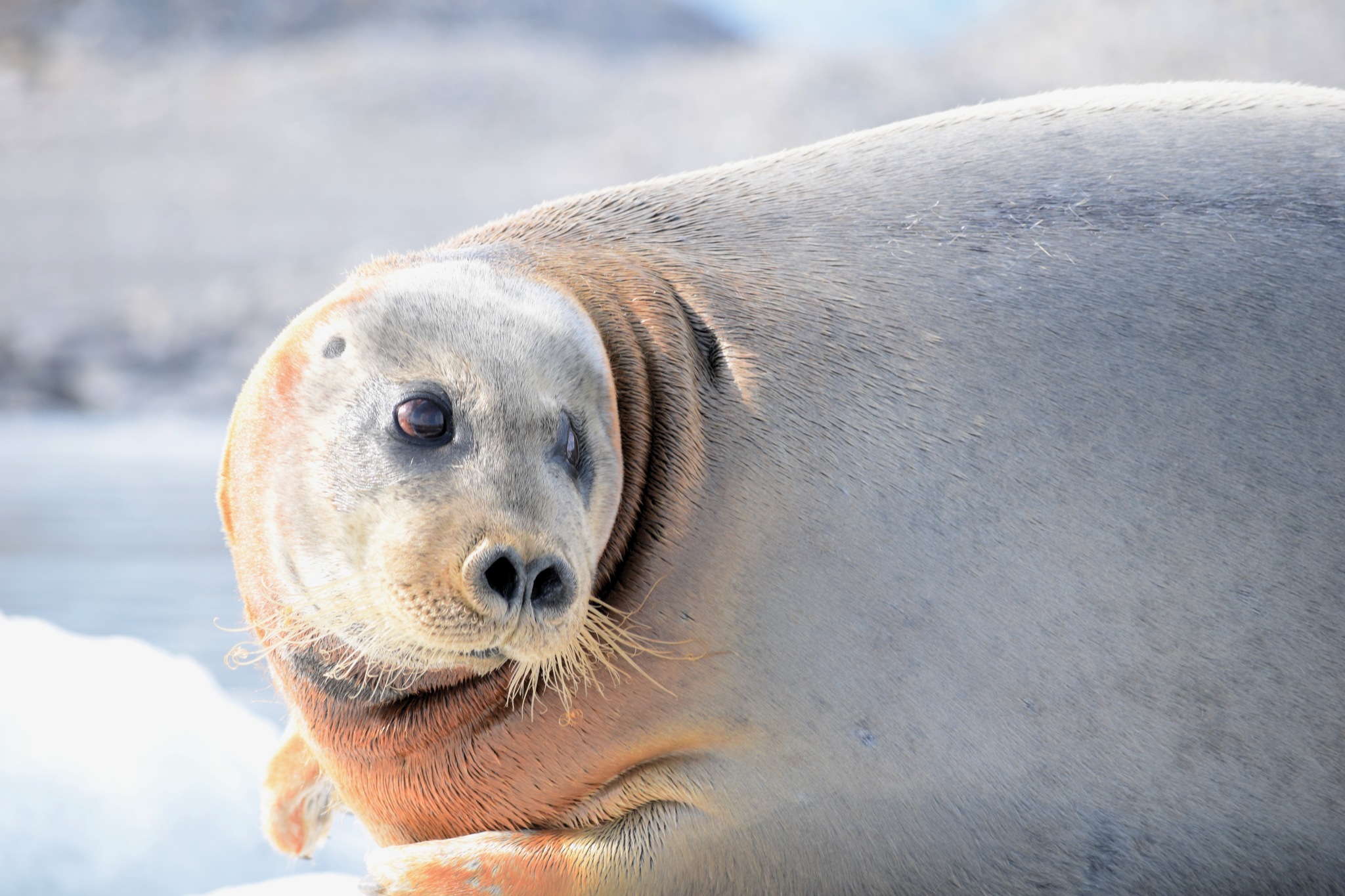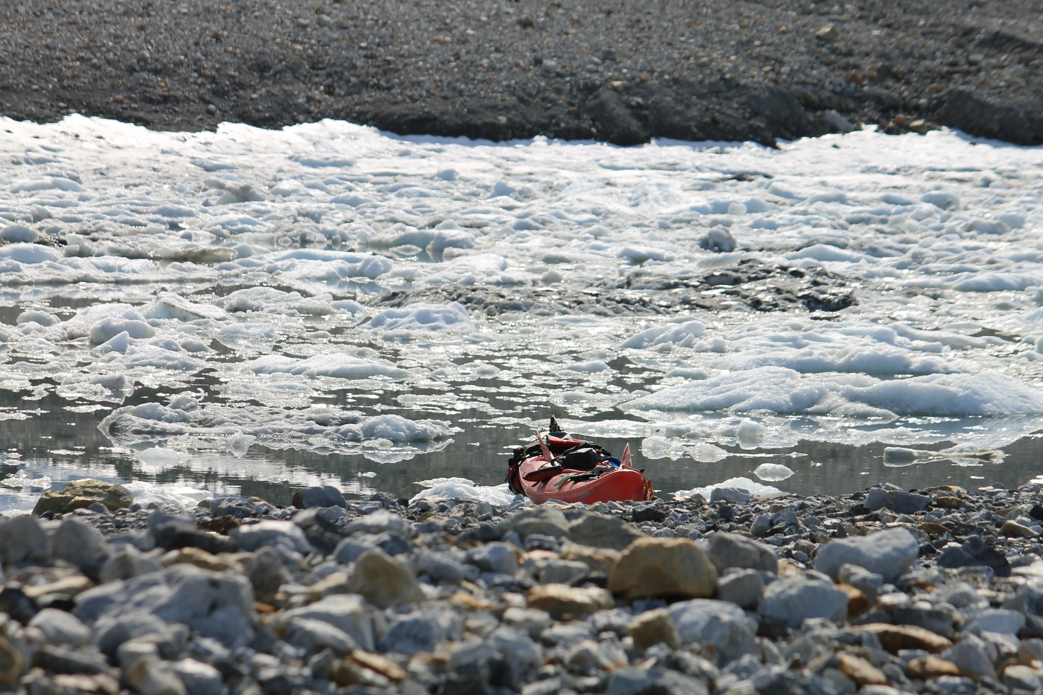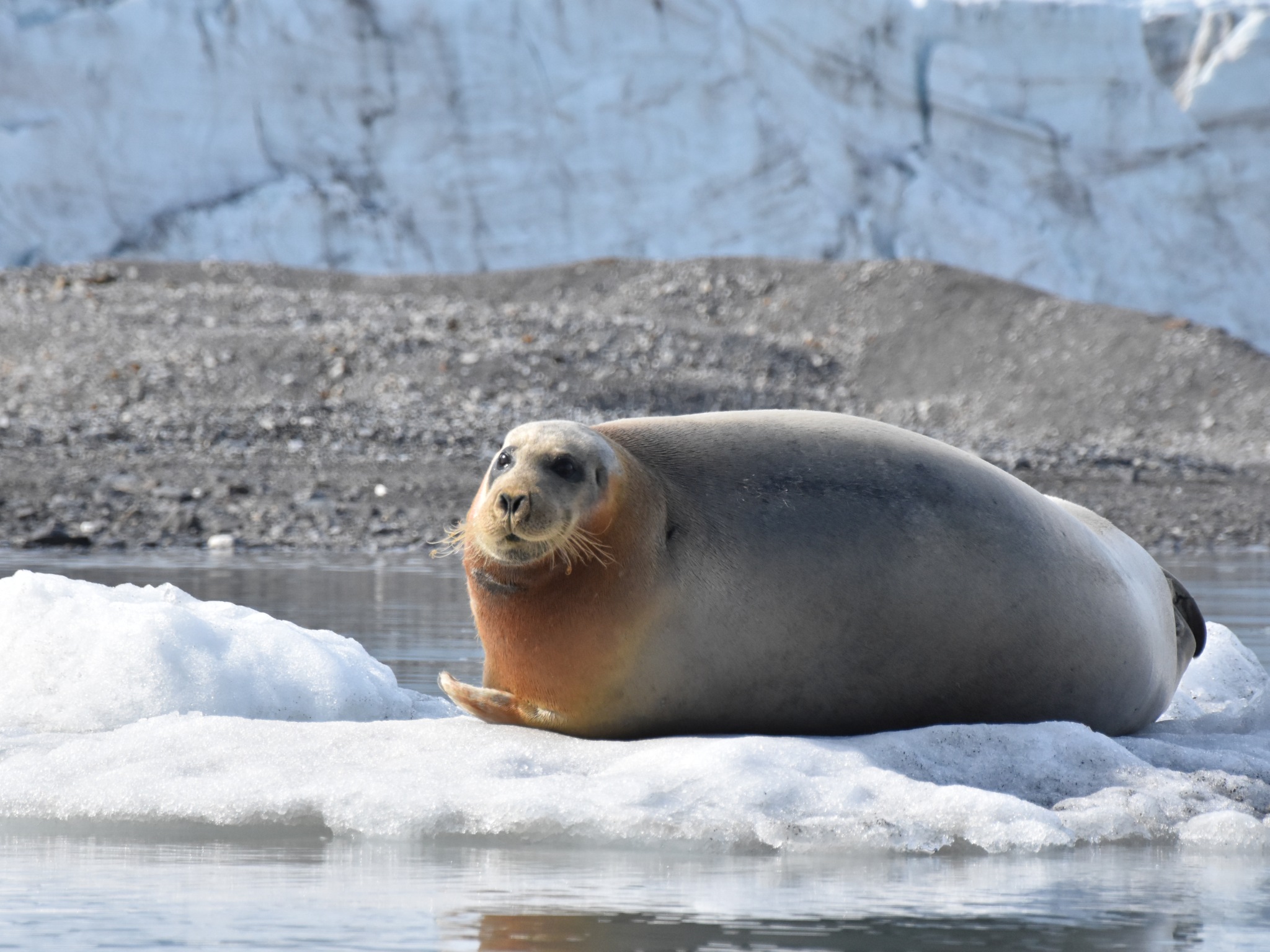 Nous nous rapprochons du glacier et rencontrons un phoque roux couché sur son iceberg. Ce dernier n’est pas effarouché et semble plutôt surpris de voir cinq embarcations glisser silencieusement vers lui. Nous nous arrêtons ensuite pour manger au pied du glacier. Au moment de repartir, la marée montante a repoussé la banquise vers le fond du fjords, nous barrant le chemin pour sortir. Ils nous faudra trouver un passage dans ce labyrinthe de glace pour retourner au camp.