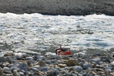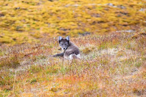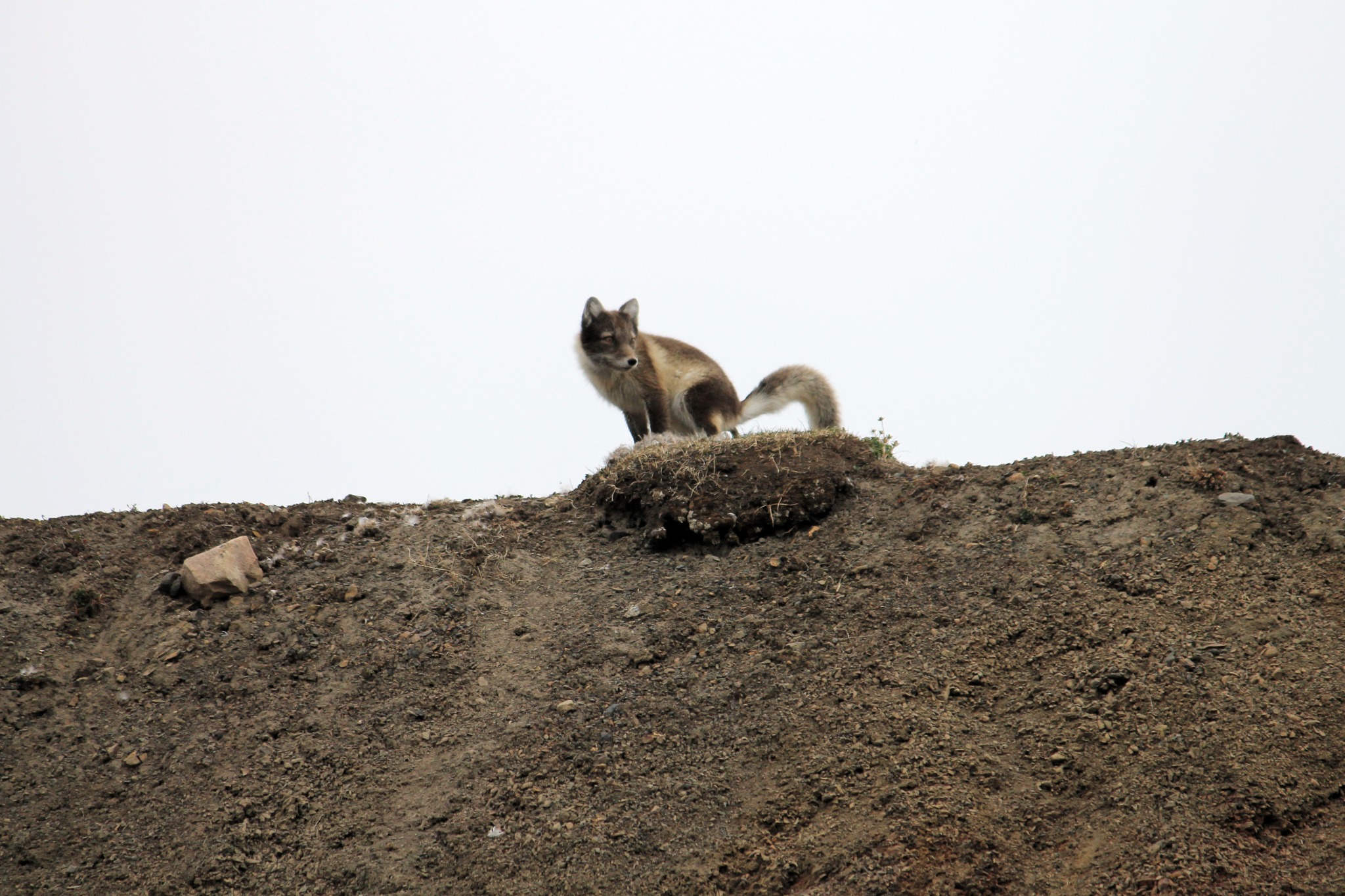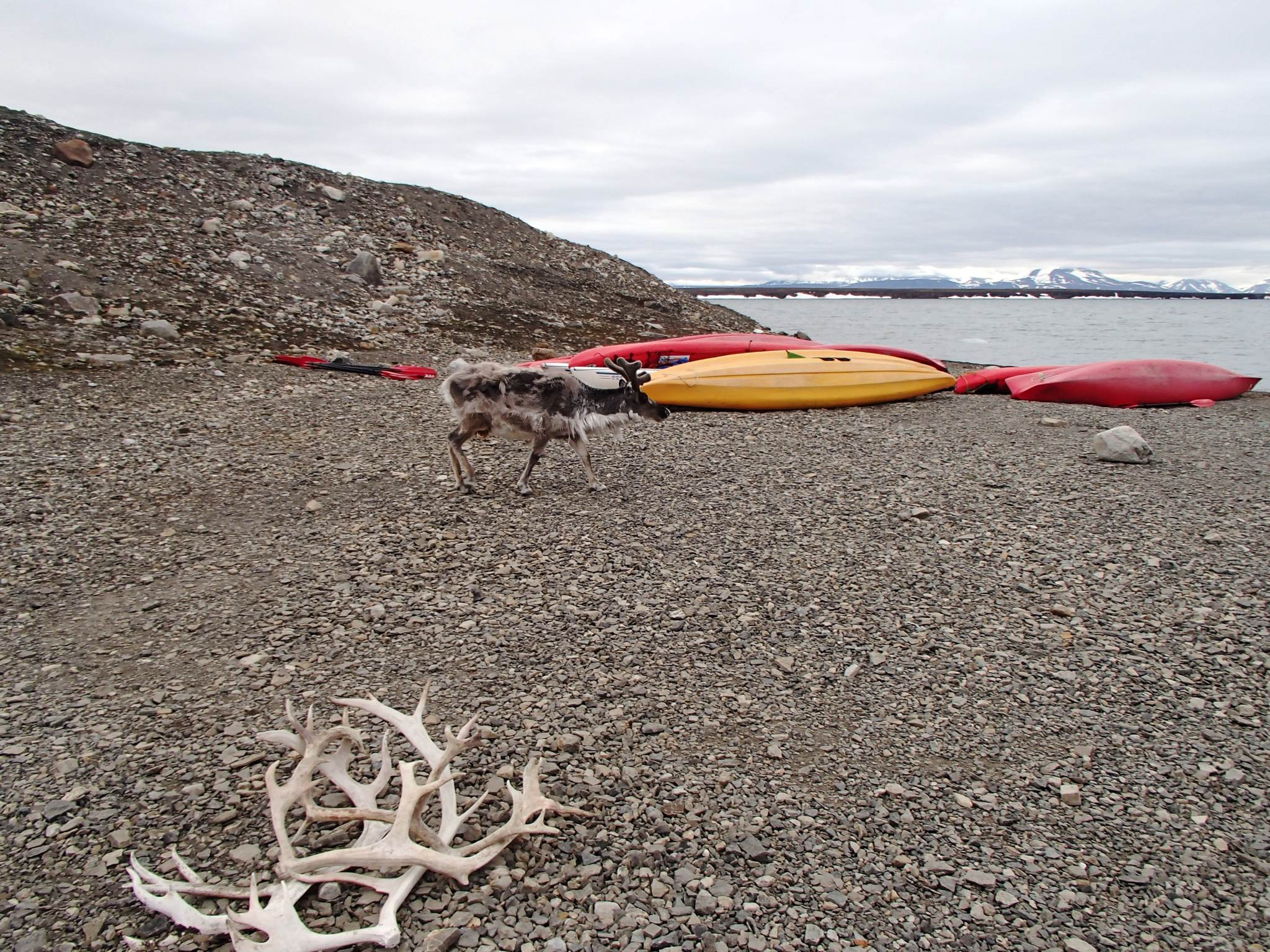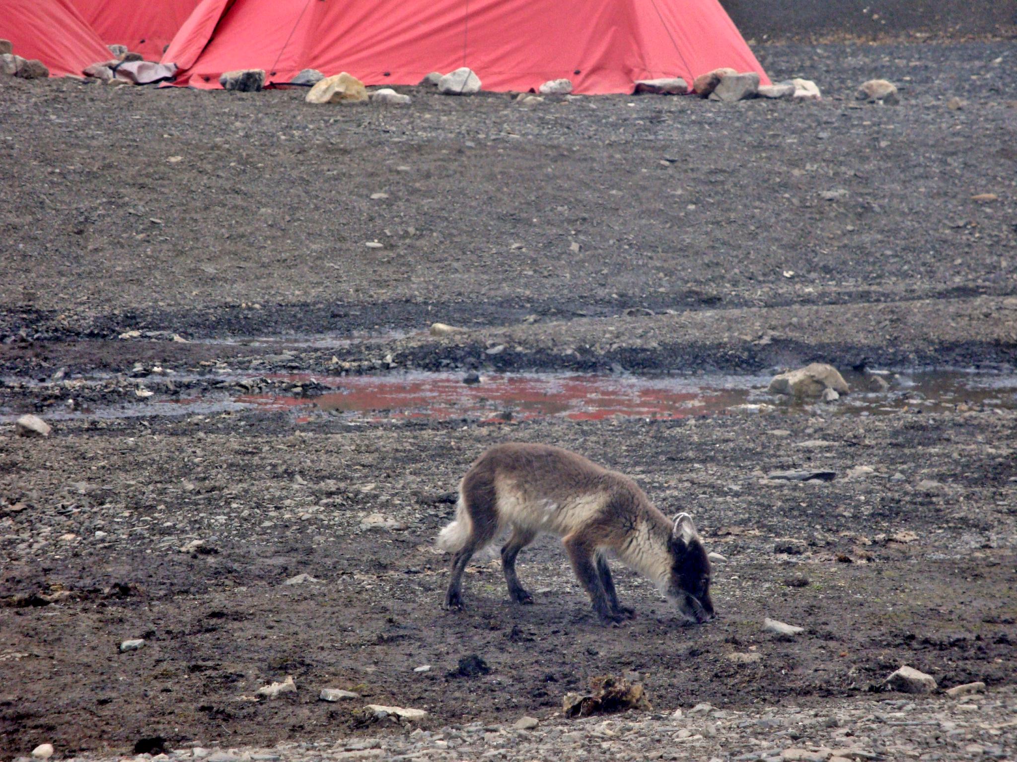 Deuxième garde pour nous. Il y a des rênes au fond du camp, un petit renard fait le tour des tentes à la recherche de nourriture. Il faut être attentif à ce qu’il ne trouve pas le garde-manger. Les « touristes » ne sont là que 2 mois dans l’année et ce petit goupil doit malgré tout garder ses instincts de chasseur pour survivre à l’hiver. Il attrape un oiseaux et défèque dans son nid. J’en profite moi aussi pour aller me soulager aux toilettes, enfin au bout de la plage. Le luxe de ce camp est de pouvoir lever la pagaie lorsque les toilettes sont occupées. Dans ce monde hostile, on en revient aux fondamentaux… J’entends un bruit. Par réflexe, je me saisis du pistolet d’alarme. Ce n’est que Greg qui se lève pour aller lui aussi se soulager…