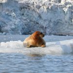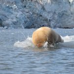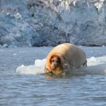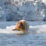Il nous faut rentrer au camp. Après l’avoir saluer tant de fois au cours des dernières années, notre guide lui fait un dernier au revoir. C’était sa dernière expédition sous les falaises d’Alkhornet pour lui. Comme pour lui répondre, le monstre de glace vêle une dernière fois puis nous laisse repartir. Nous faisons un détour pour observer un phoque barbu roux. Nous admirons encore une fois l’élégance particulière de cet habitant se jetant à l’eau.