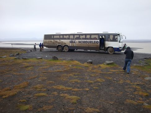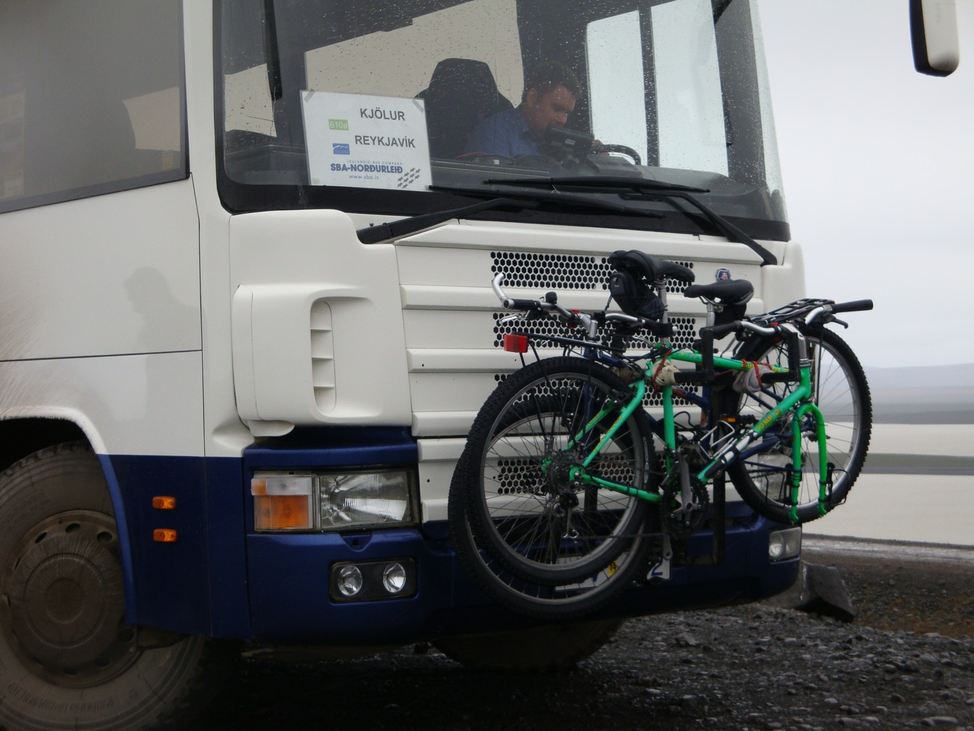 Nous avons expérimenté le voyage en bus en Islande, avec les vélos donc. C’est très particulier le bus islandais, très spécifique. Vous n’avez qu’à voir la photo, rien à voir avec nos bus de ville.