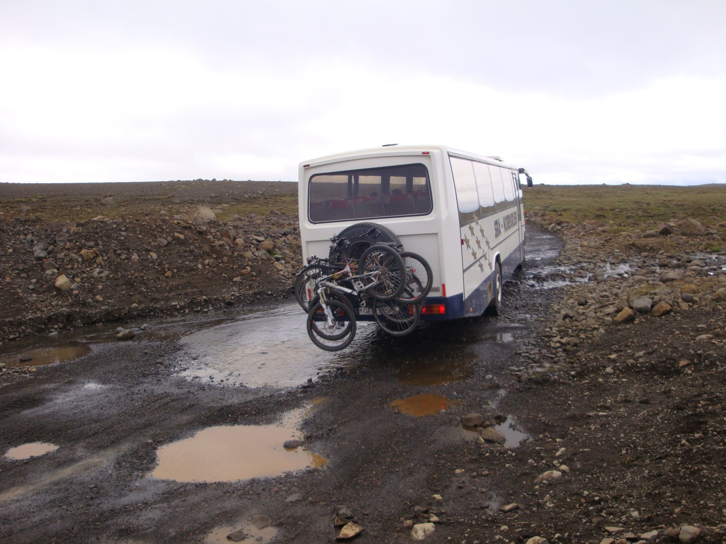 Bon, c’est sûr qu’en voyant la piste, on est content qu’il ait pris autant de soin à monter les vélos. Les six roues motrices et l’expérience islandaise du chauffeur ne sont pas de trop pour avancer sans encombre.