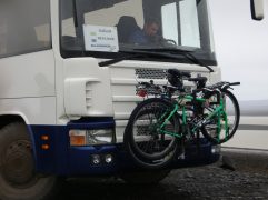 Quand on voit le bus arrivé, on a un petit moment de stress car il y a déjà deux vélos dessus. Le chauffeur, lui, n’est pas du tout inquiet… Il monte les vélos sur le porte-vélo à l’arrière, les enlève, les remet dans l’ordre inverse, les enlève, essaie dans tous les sens et tous les ordres. Comme il n’y arrive pas, pour nous, le stress continue de monter. Et là, il part à l’avant, sort deux grandes tiges en ferraille de sous le bus et monte… un deuxième porte-vélo à l’avant du bus ! Il met les vélos dessus, démonte et remonte le porte-vélo dans l’autre sens et remet les vélos. Il rajoute des chiffons pour ne pas abîmer les cadres, rajoute encore une bonne dizaine de tendeurs. Puis, il se retourne vers nous et nous demande si on le montage nous convient.
