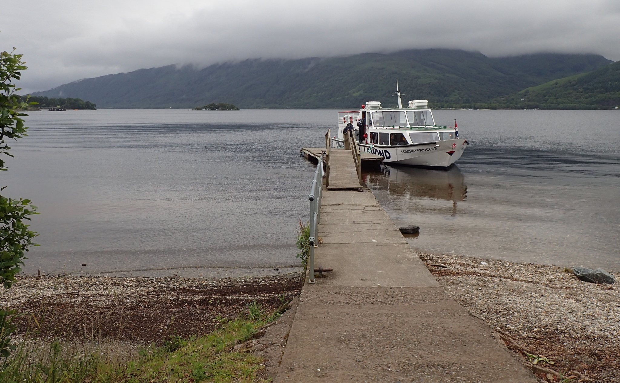 La traversée de la ville se fait sans encombre sous une pluie fine accompagné par la bonne humeur des habitants. Les pistes cyclables sont très bien aménagées et très bien indiquées. De longues portions en sous-bois longe la River Clyde, nous éloignant des voitures et du tumulte urbain. Les autochtones sont particulièrement amicaux et stéréotypés. Après avoir bien cravaché sur les dernier kilomètres, nous arrivons à Luss à 16h10, juste à temps pour le ferry de 16h15 dans lequel il y a… 2 passagers et 2 vélos, nous.