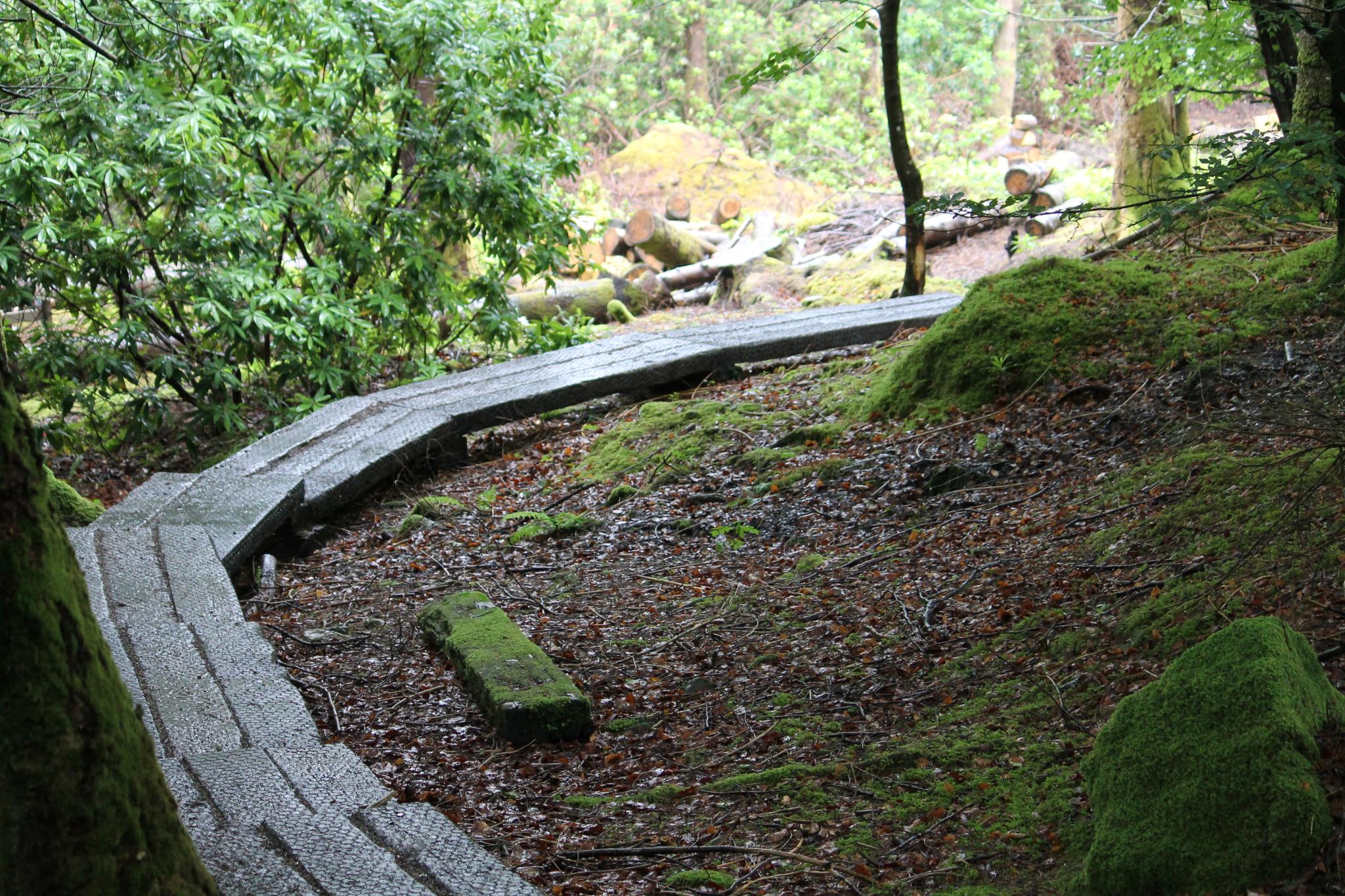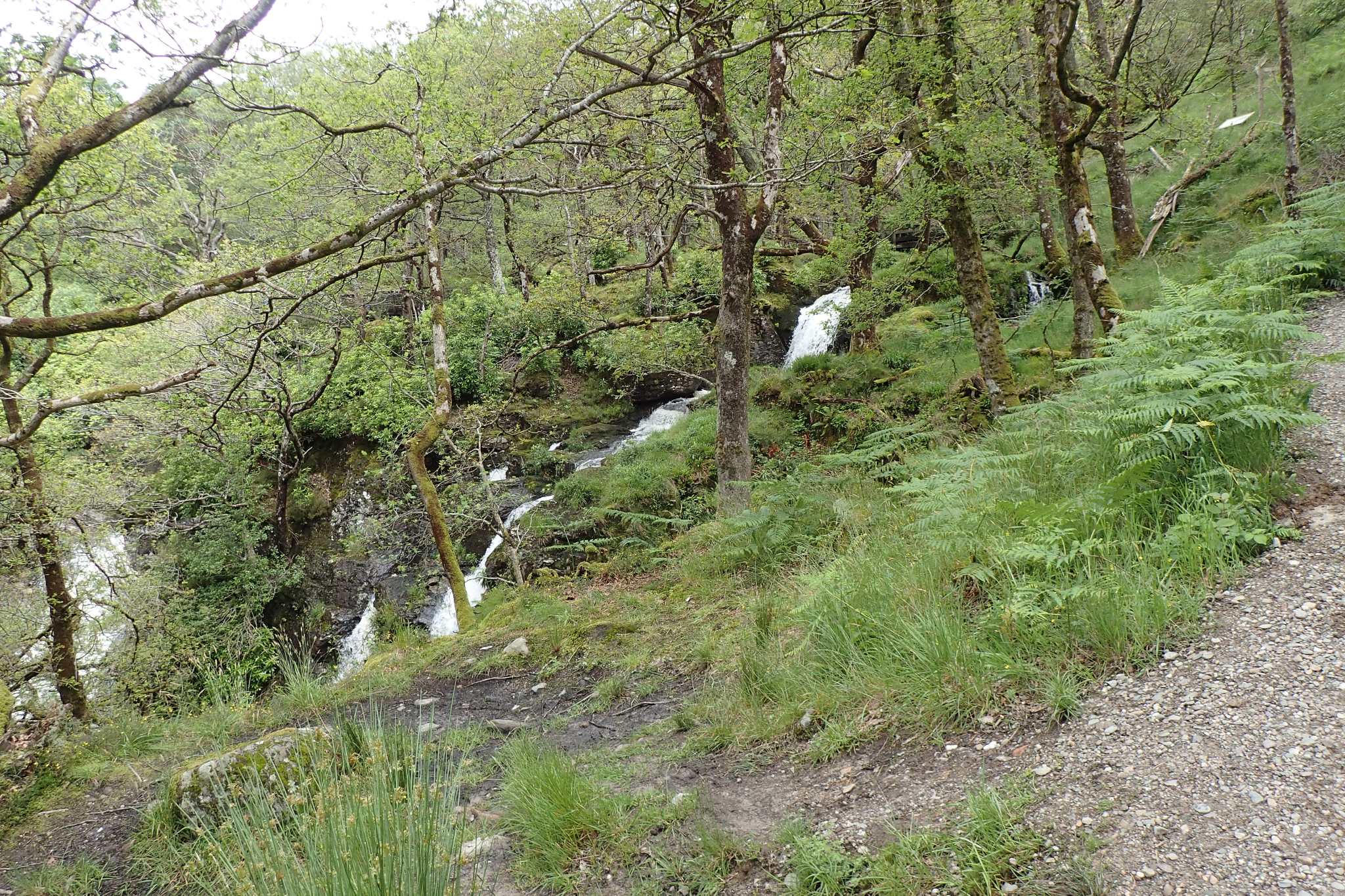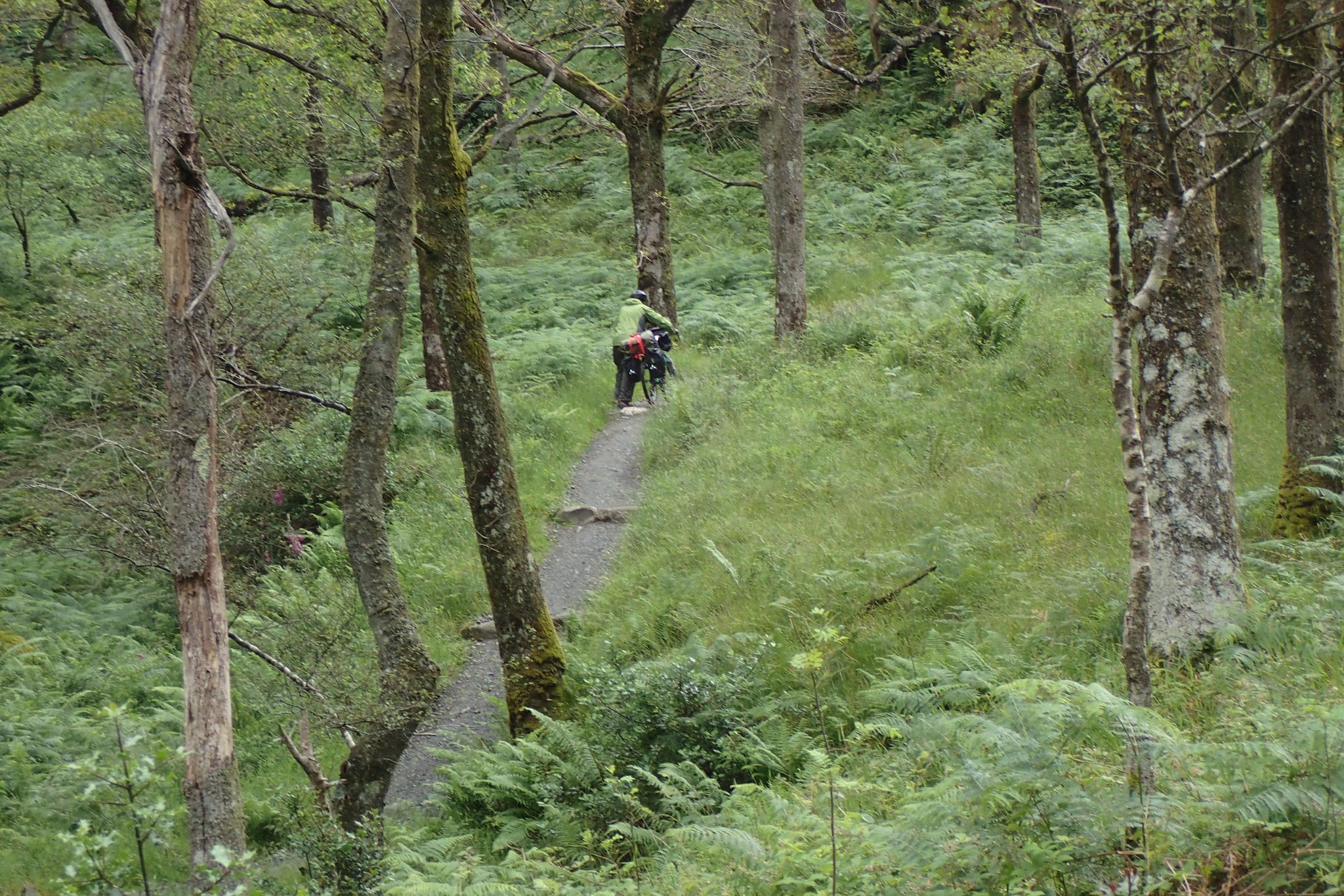 Nous ne savions pas trop si la West Highland Way était praticable en vélo ou non. Elle est indiqué comme « chemin cyclable » sur OpenStreetMap mais nous n’avons pas trouvé de témoignages de cyclo-randonneur sur internet. Les débuts sont engageants, avec une large piste roulante et propre. Cela se corse quelques kilomètres avant Inversnaid où la piste se transforme sans prévenir en chemin de rando montagneux. Pierriers, racines, dévers, côtes et descente se succèdent cassant chaque fois un peu plus les montures et leur cavaliers. La piste serait praticable et pourrait même être agréable en VTT suspendu. Mais avec nos camping-car de 30Kg , cela se révèle un vrai calvaire. 3h et 3km plus tard, nous arrivons enfin à Inversnaid en début d’après midi.