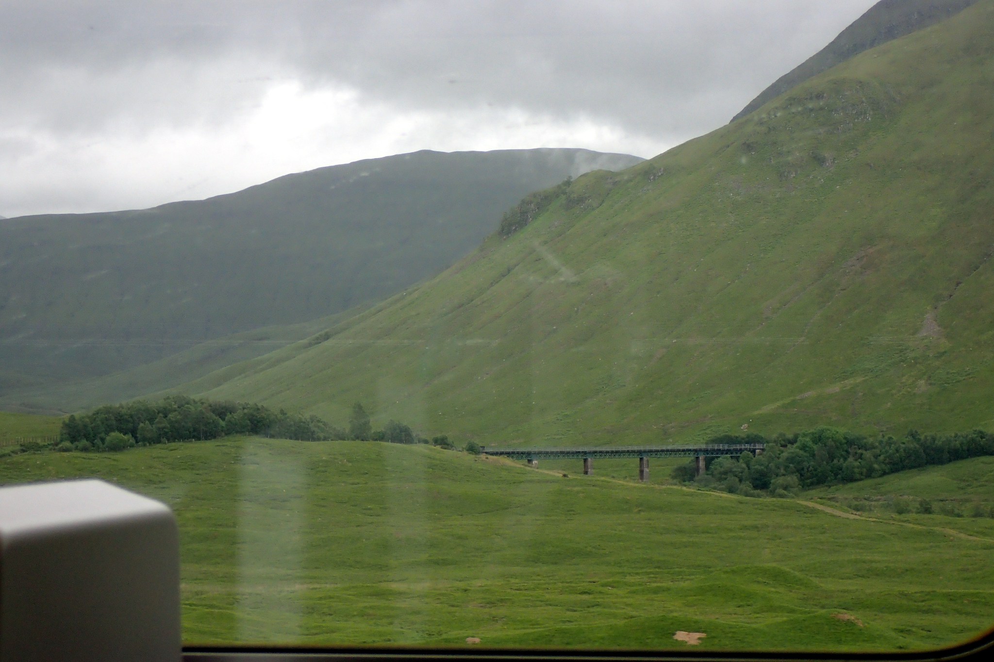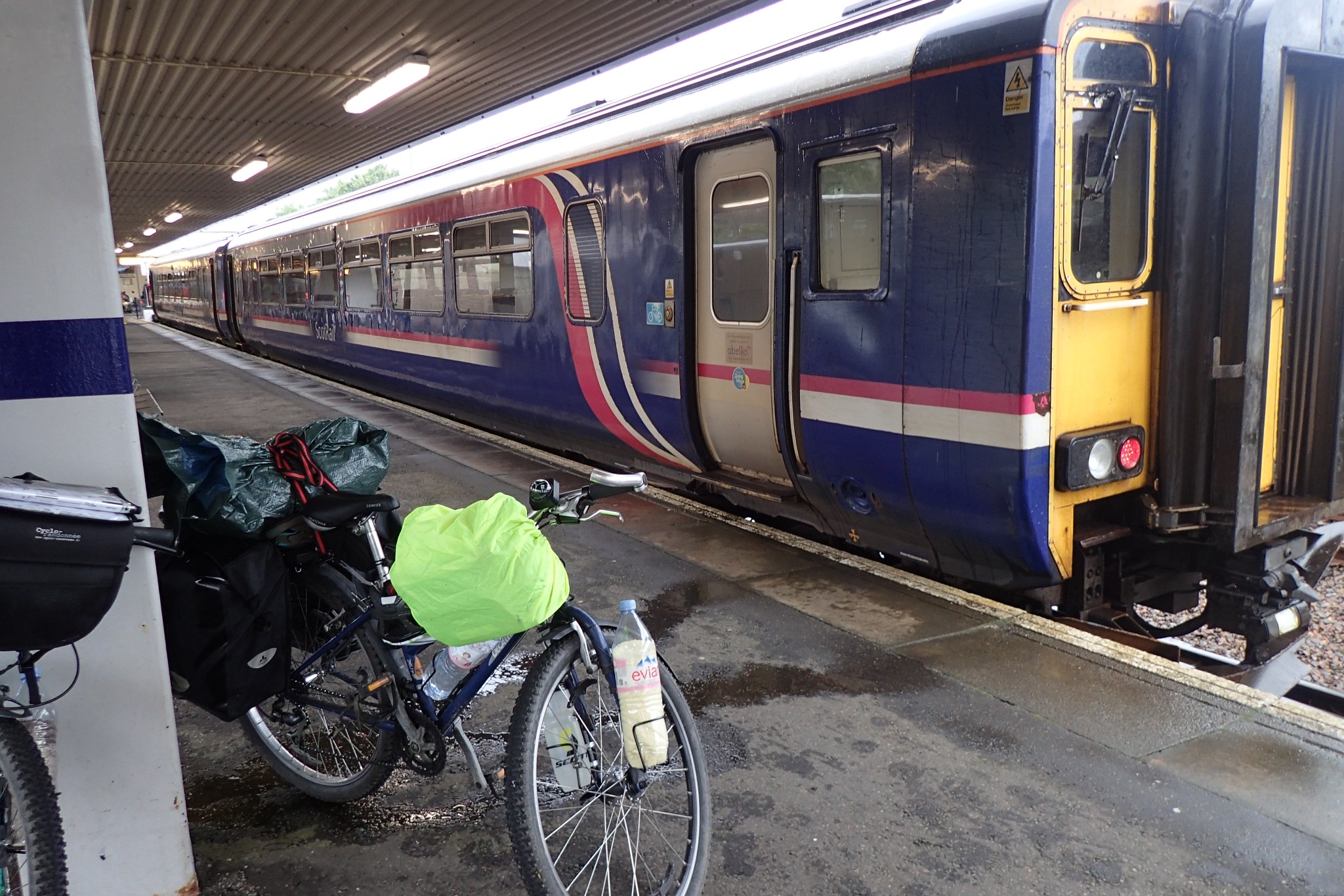 Rapidement, le genou de Thibaut montre des signes de faiblesse dans les montées, probablement un reste des péripéties d’hier combiné à l’humidité ambiante. Impossible de continuer, on improvise donc un plan B en s’arrêtant à Crianlarich pour prendre le train. Coup de chance, il y a une gare et un train pour Fort William … dans 4 heures. On attend patiemment. Thibaut en profite pour strapper son genou avec une vielle chaussette.