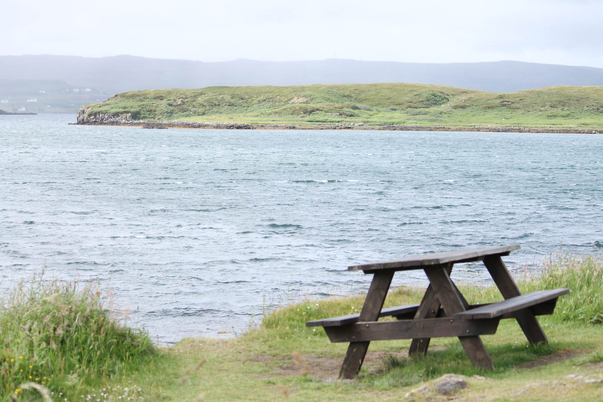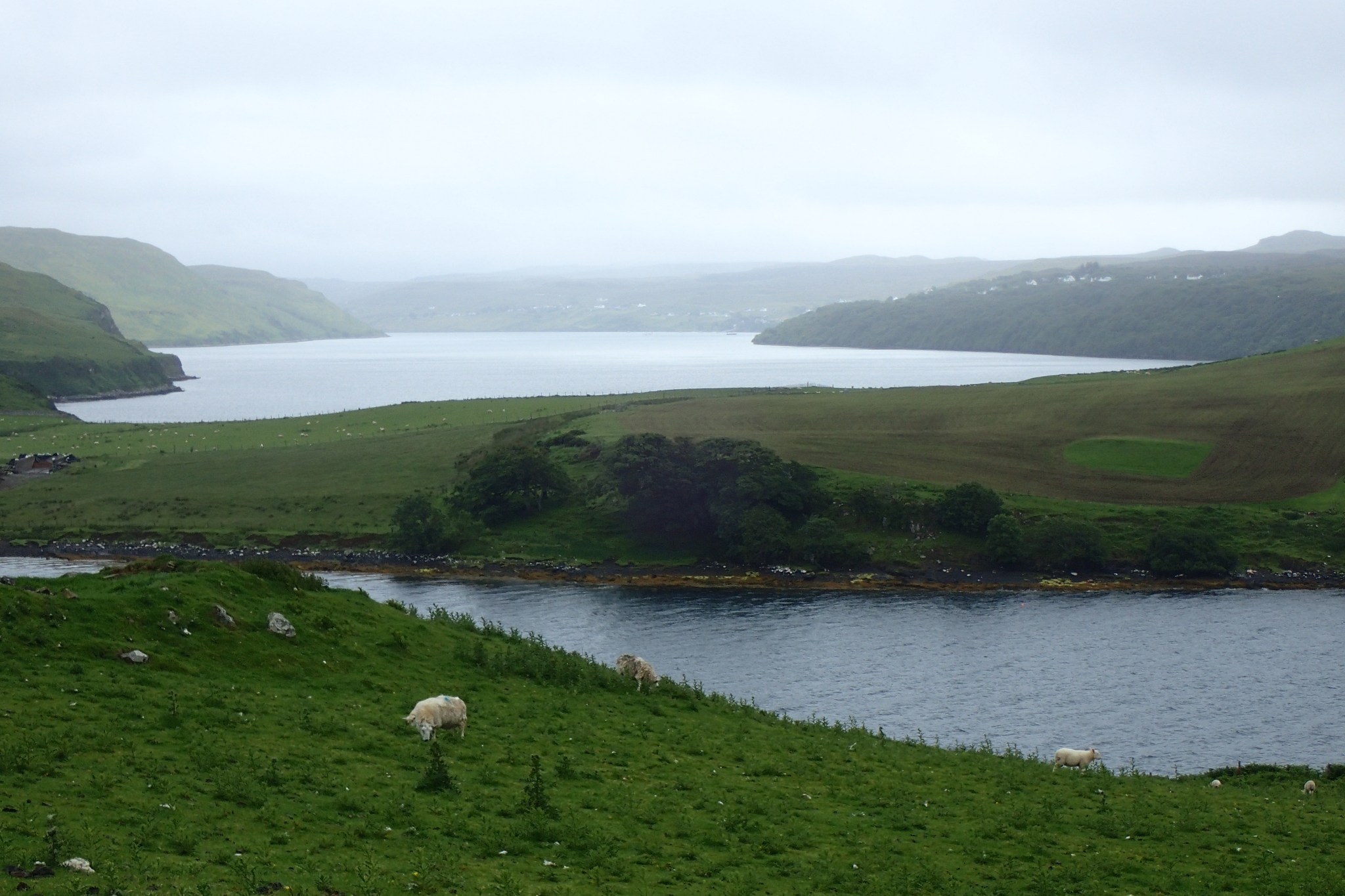Nous abandonnons nos montures au camping pour louer une voiture. De quoi faire de plus longues distance au sec, et reposer les jambes et le moral. Première expérience de conduite à gauche. Contrairement à nos craintes, la difficulté n’est pas tant de serrer sa gauche que de ne pas finir dans le fossé ou de se prendre un trottoir. Direction l’île de Skye sous les nuages et la pluie. Nous croisons quelques moutons sur les fameuses routes à bulles d’Ecosse.