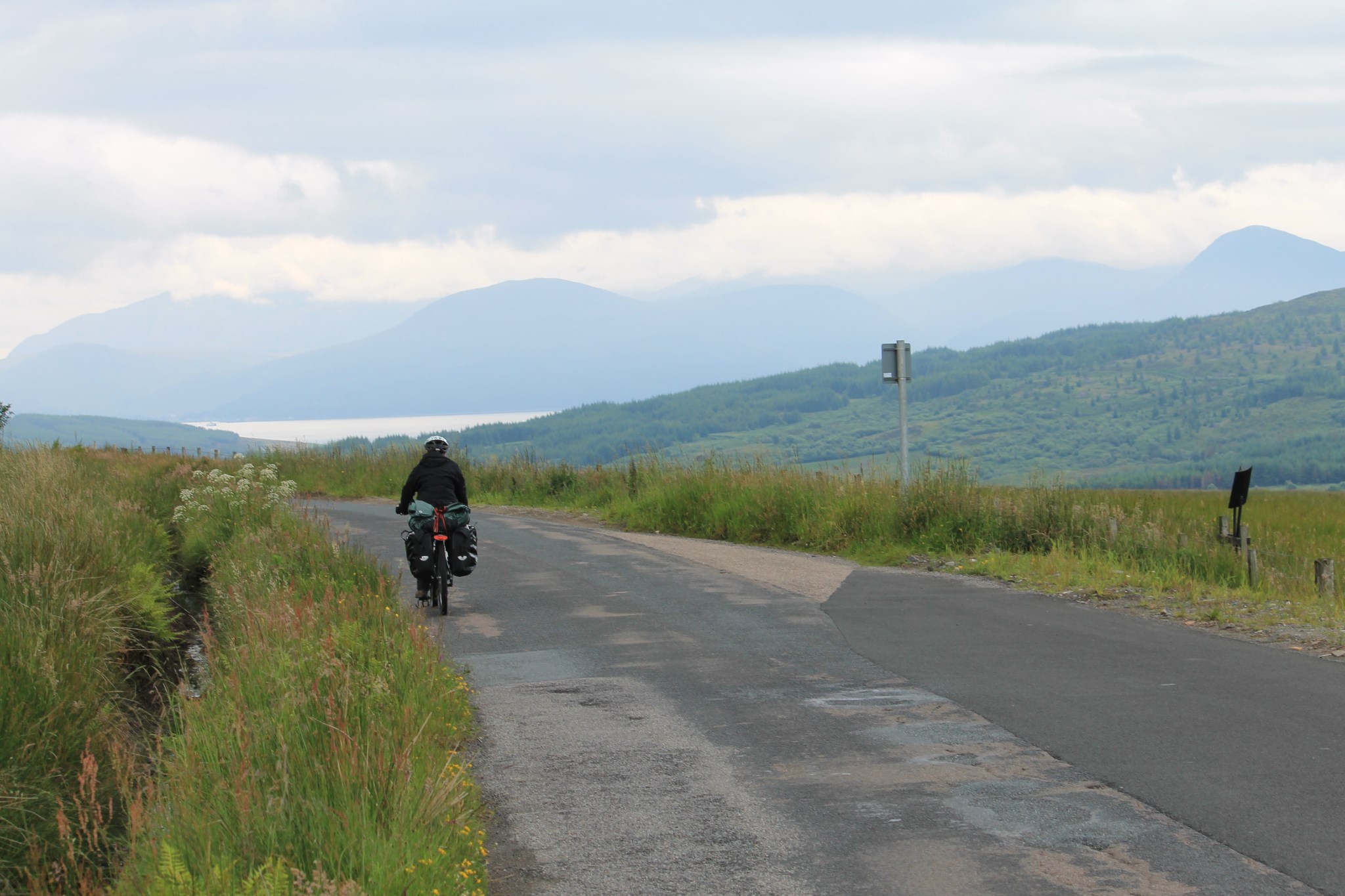 Après un petit arrêt à la distillerie, on part pour Brodick. On fait le choix du chemin le plus court au lieu de passer par le milieu de l’île. Le route côtière grimpe sur d’interminables kilomètres. Les 200 précédentes bornes commencent à se faire sentir, et grimper une côte avec un vélo chargé de 20kg de bagages est bien différent de grimper avec un vélo à vide. L’ascension s’effectuera en bonne partie à pied.