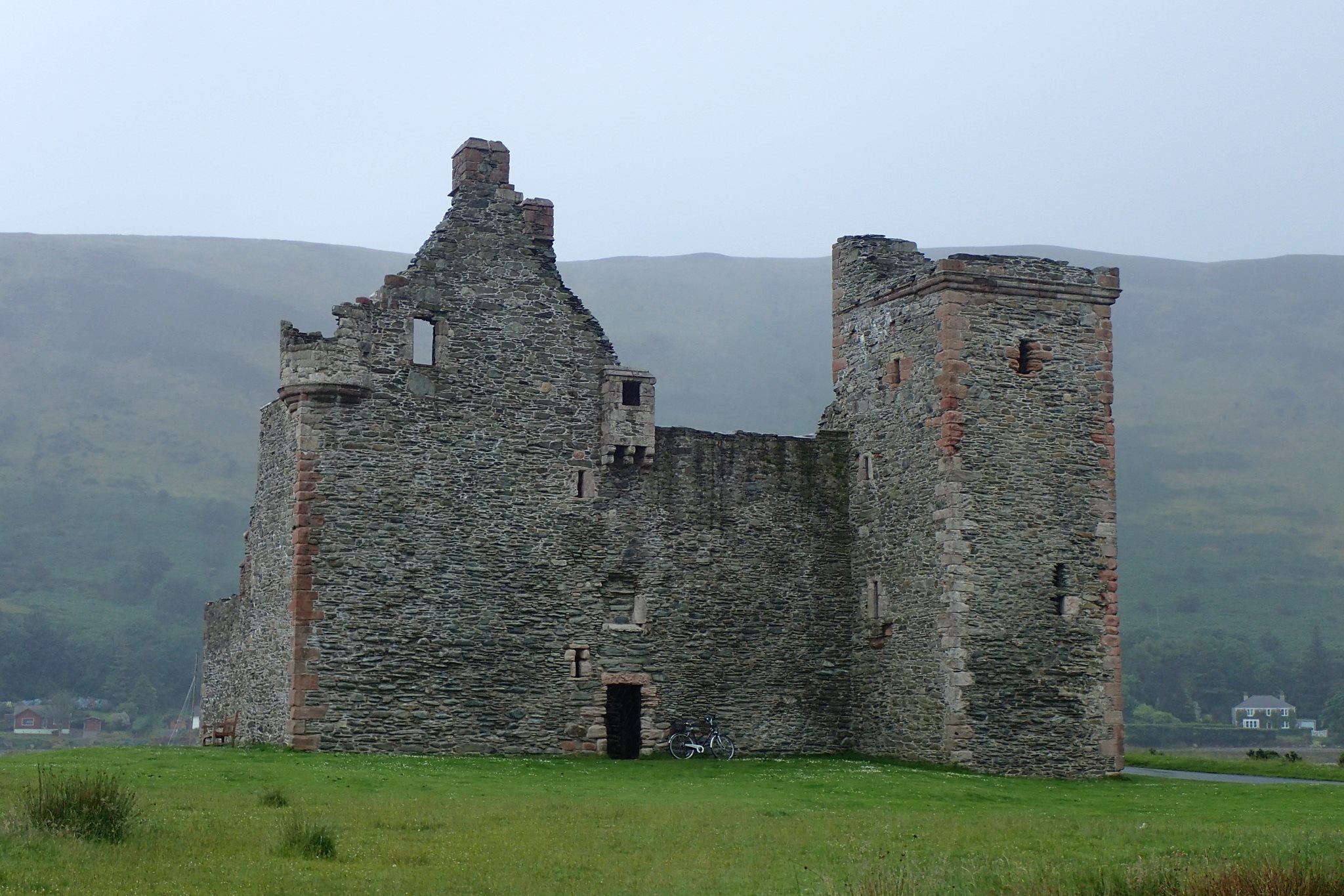 On débarque à Lochranza sous une pluie fine fort désagréable. Nous avions repéré des toilettes publiques lors de la préparation du roadbook. Très utile pour ravitailler en eau. Malheureusement, elles sont condamnées. On devra rationner…