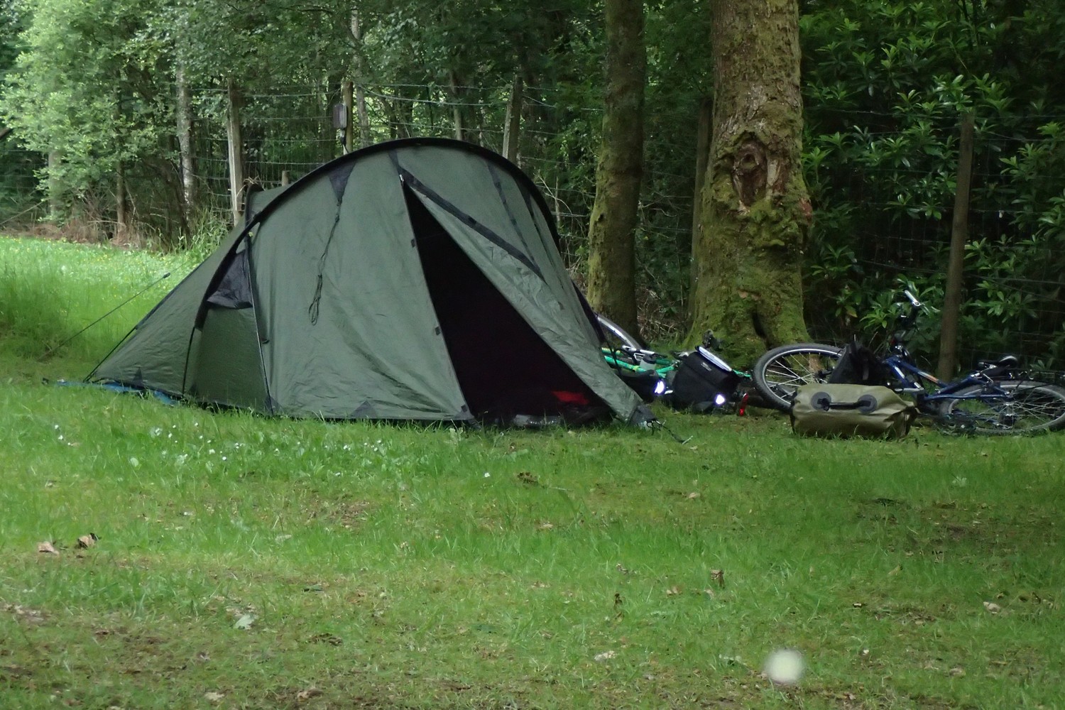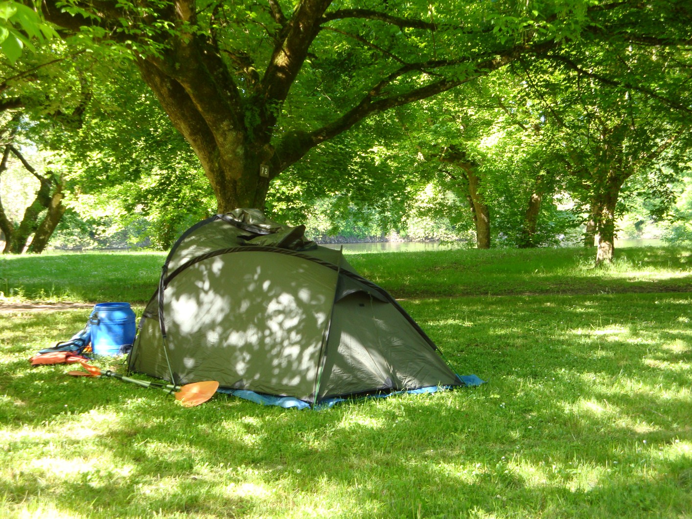 L’auvent est suffisamment grand pour stocker 4 sacoches de vélo et avoir encore la place de mettre le réchaud et manger à l’abri de le pluie.