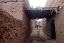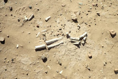 Nous remarquons des ossements au milieu des cailloux. Tout d’abord, des os de dromadaire, puis une main humaine et finalement un corps tout entier très bien conservé. Les ossements sont nombreux, probablement les restes d’une épidémie ou d’une guerre. Difficile de les dater. Des nomades auraient pu vivre ici depuis le Xème siècle.