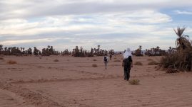 Nous partons à 9h après la « mangeation » (terme consacré par notre guide) du matin pour la plus longue étape du périple. 22km de sable nous attendent. Nous remarquons rapidement que le désert ne l’est pas tant que ça, toute une vie se cache derrière les empreintes de pattes qui courent le long des dunes. La matinée se déroule sous une température clémente et un sol dur de boue séchée. Vers midi, le mercure commence à monter mais reste agréable. Peut-être 25°. Le tendon d’achille de Laure signifie sa présence à chaque dune. Elle serre les dents et avance. On s’arrête vers 13h30 en retrouvant Hussein le cuistot. Ce sera ratatouille. Après quelques opérations de maintenance sur les pieds des participants, nous faisons une sieste sous l’arbre. Le seul arbre. Nous avons quitté la palmeraie ce matin et naviguons à présent entre les dunes qui se suivent et se ressemblent. Impossible de se repérer dans cet océan de sable.