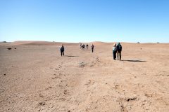 Nous repartons ce matin pour une étape plus courte. 11 km vers la dune de la Chance, de quoi reposer un peu les jambes et cicatriser les ampoules. Les quelques dunes laissent place à un plateau désertique. La surface de boue séchée est plus roulante, les chevilles souffrent moins. Les plateaux immenses se succèdent, entrecoupés de quelques dunes de sable.