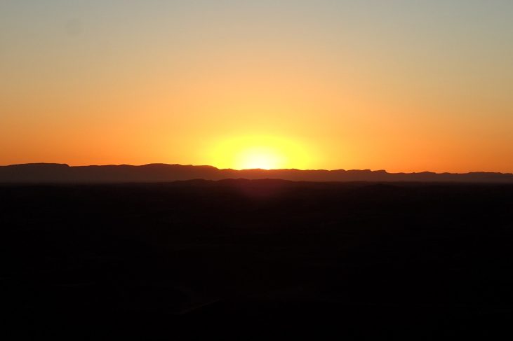 La route est droite, mais la pente est forte. Après 40 minutes d’ascension ayant permis à un membre du groupe d’affronter sa peur des névés, nous retrouvons un couple suisse. Ils viennent d’un autre camp au pied de la dune. Nous regardons le soleil se coucher sur un poste frontière marocain, puis redescendons manger.
