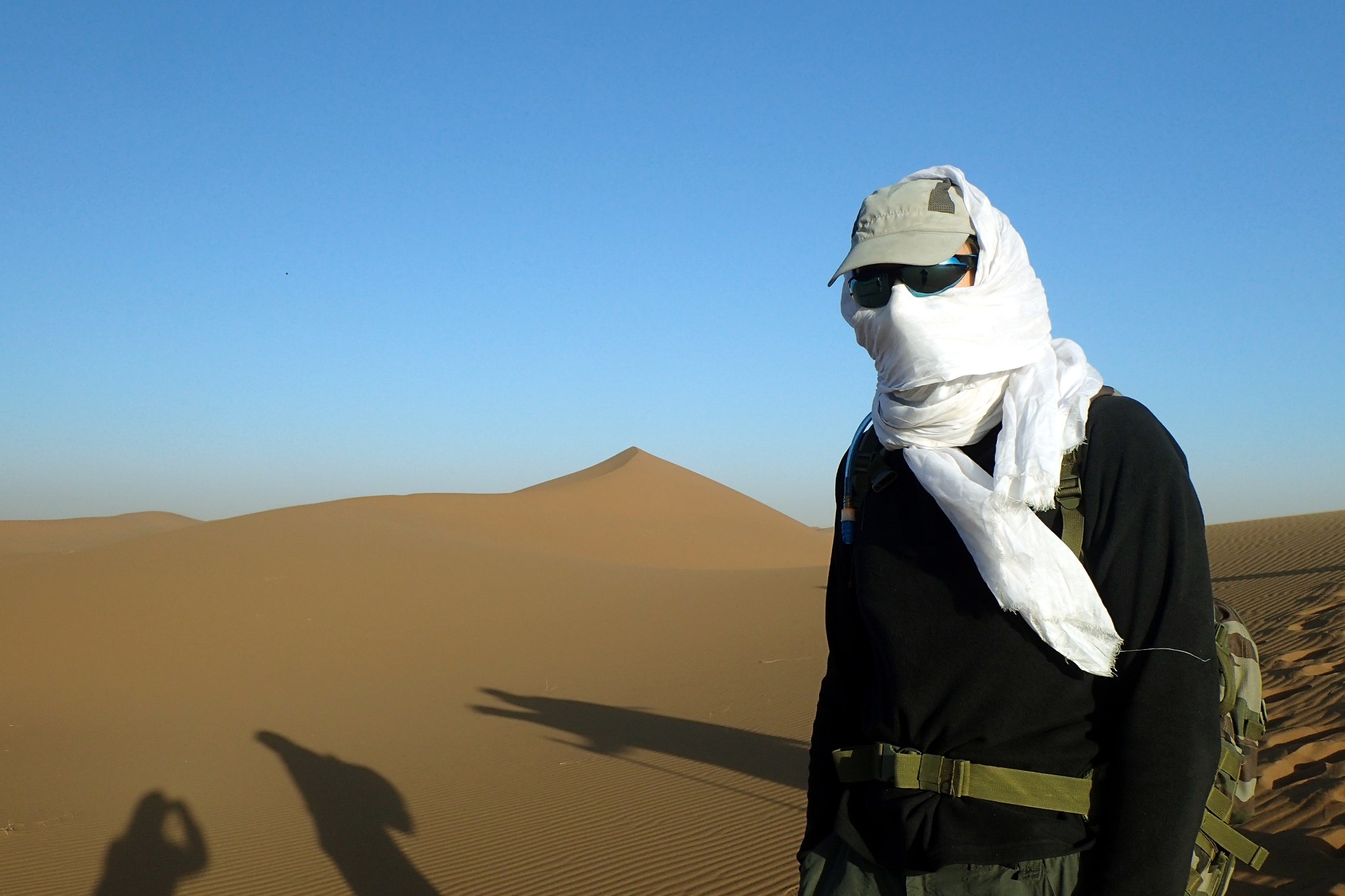 Thibaut a refait la tente à sa manière avant d’aller se coucher. Il a peut-être bien fait. Les vagues de sable ont déferlé toute la nuit, malmenant la tente mais celle-ci à tenu bon. La toile à pourrir à fait son boulot, beaucoup moins de sable est rentré cette fois-là. Le vent se calme au petit matin et nous partons sous un soleil radieux mais un air frais. La physionomie du groupe à changer par rapport au début. Le groupe s’étale et quelques vieux commencent à fatiguer.