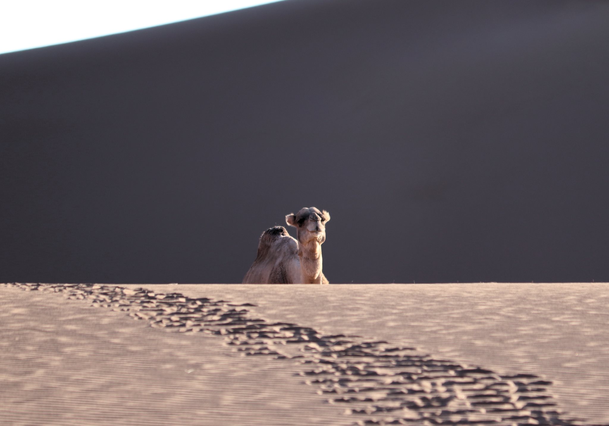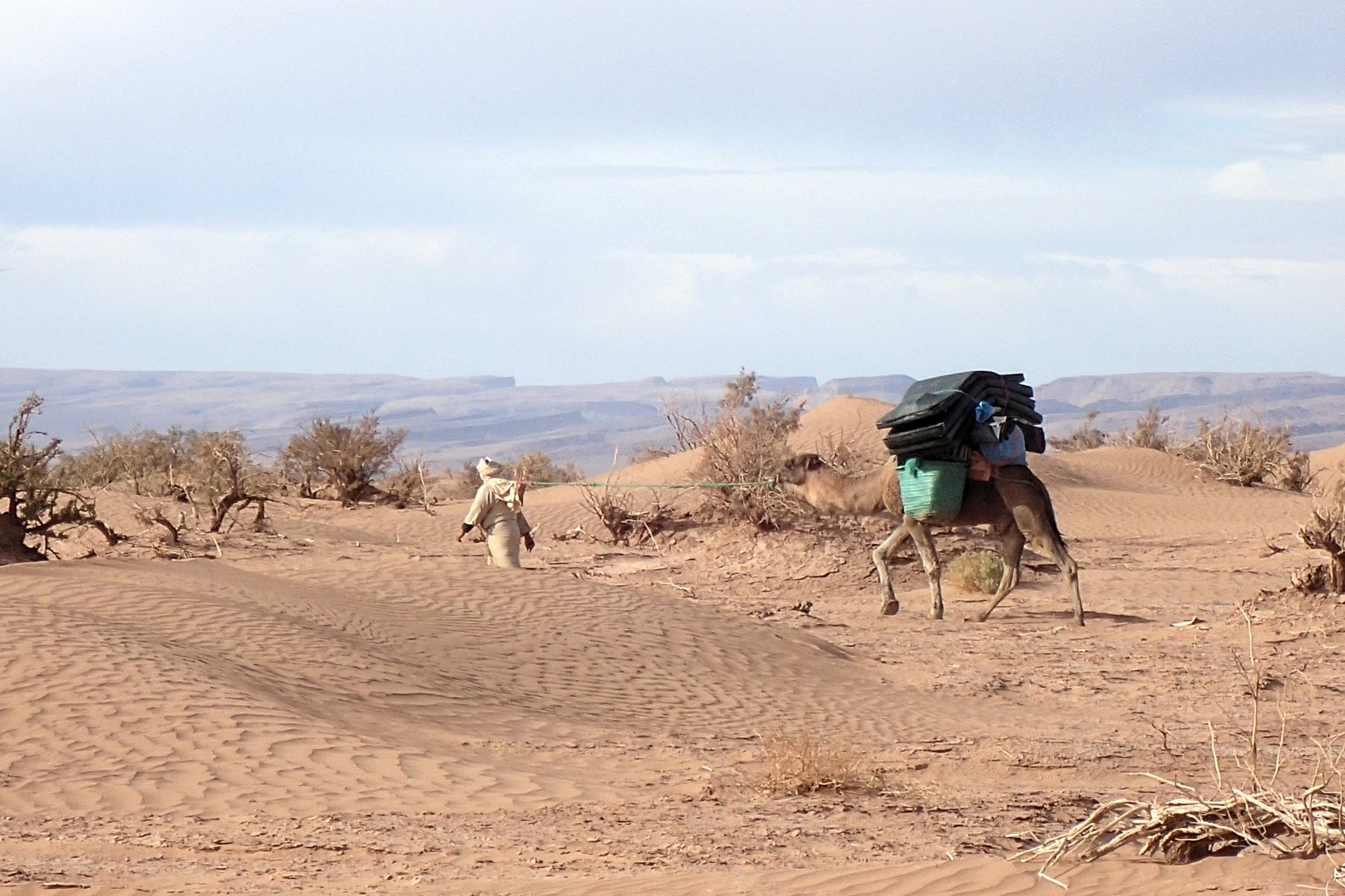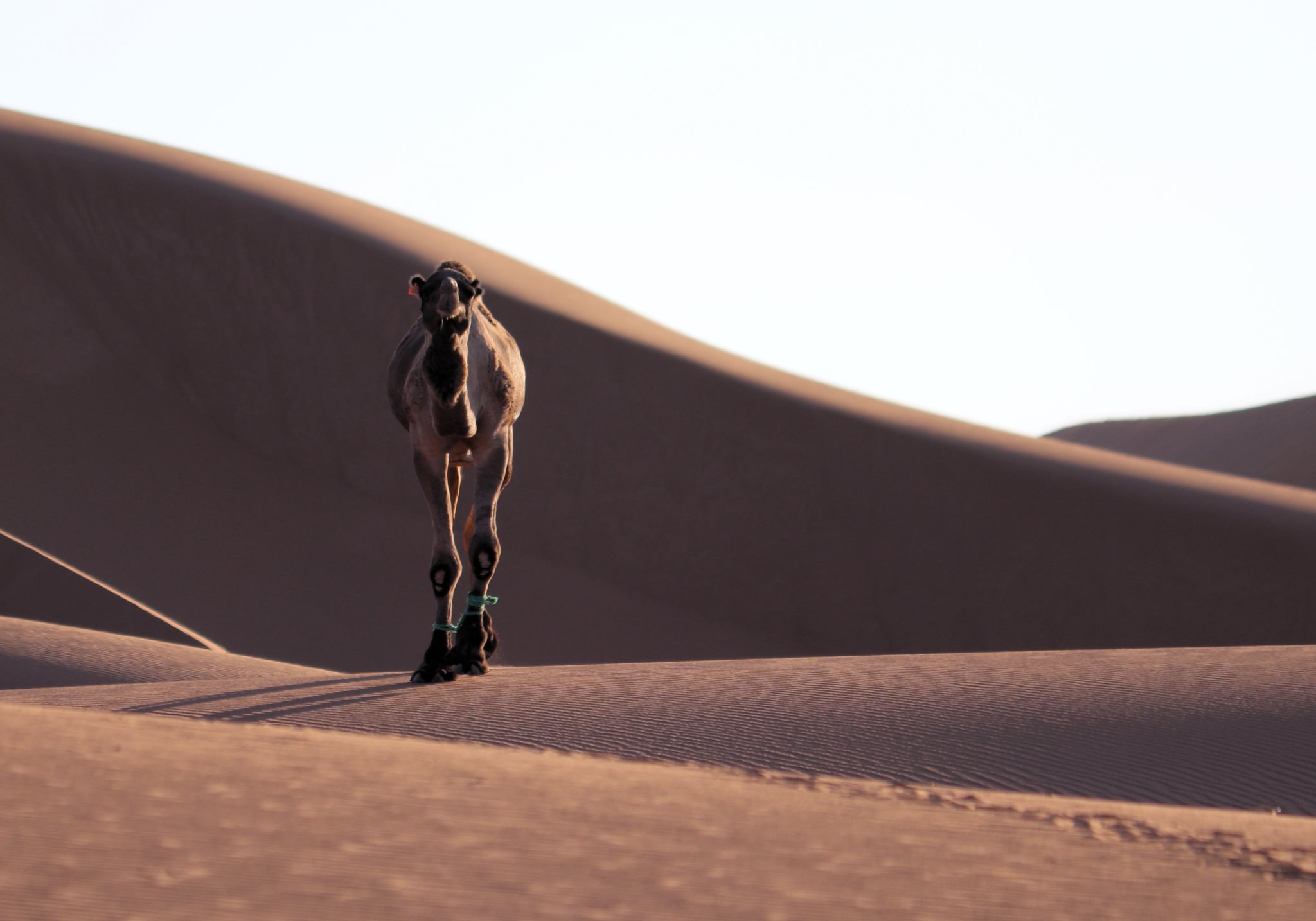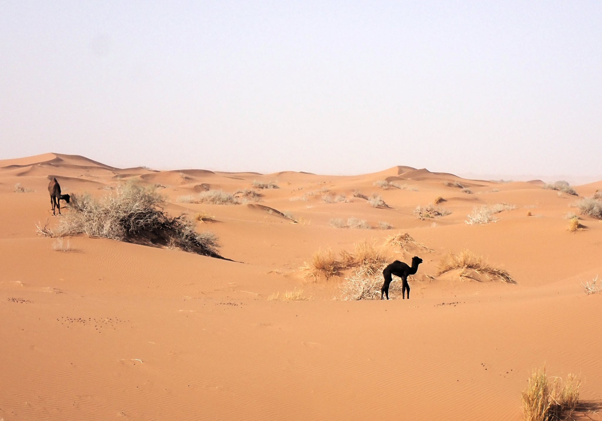 Le vent s’est levé vers 1h du matin. La nuit a été agitée et la tente s’est à moitié effondrée. On lève le camp vers 9h, les affaires pleines de sable et de poussière. On croise un dromadaire et son petit, appartenant probablement à des nomades. Le dromadaire sauvage n’existe plus depuis longtemps. Le jeune ne doit pas pas avoir plus d’une semaine mais tient déjà sur ses pattes, même si la marche reste hésitante. Choupette devrait en prendre de la graine.